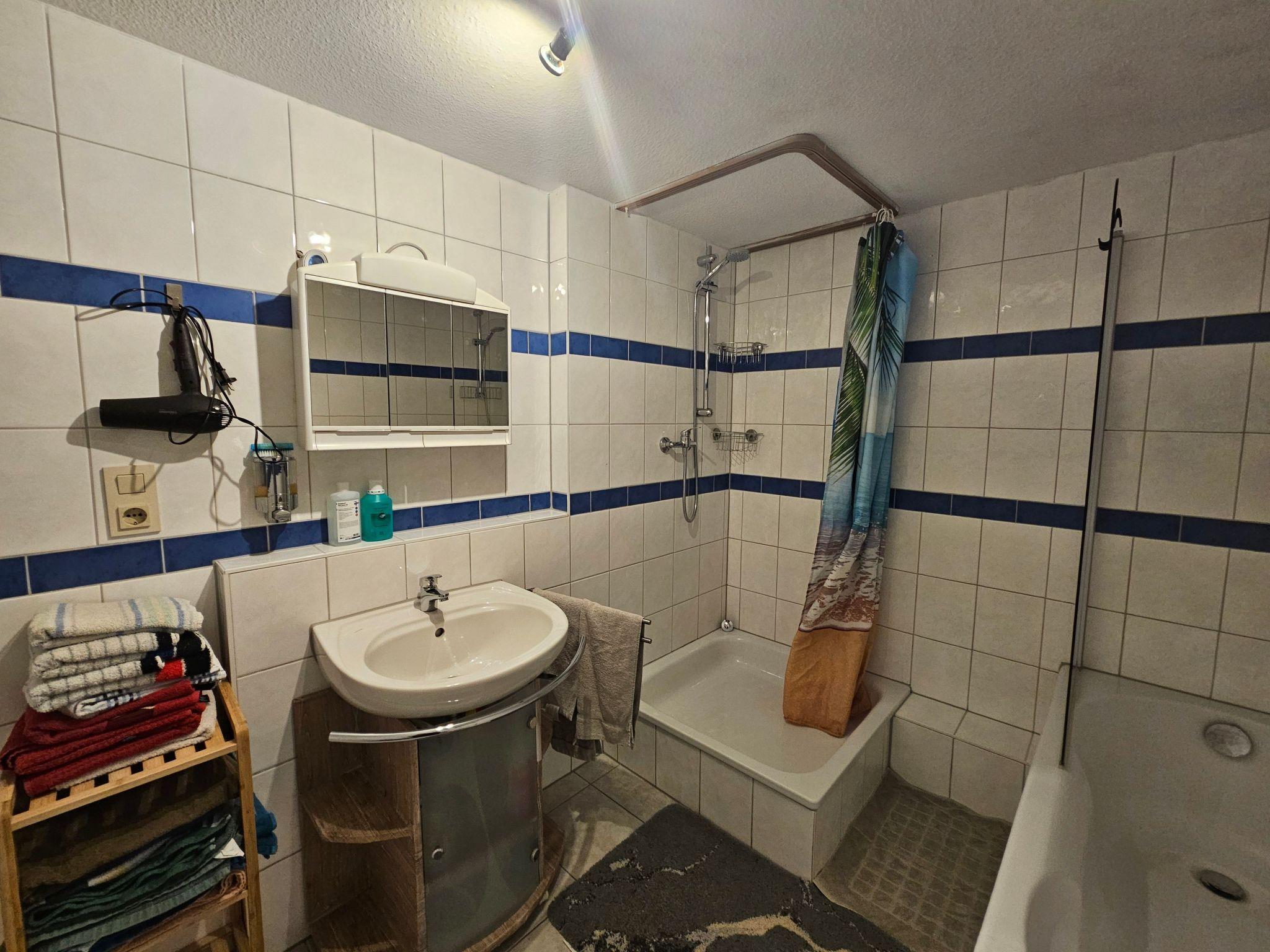 The internal staircase takes you to the maisonette flat on the top floor. No lift available. This is suitable for a maximum of six people and has two bedrooms. One of them is a quadruple room and has a covered, secluded, 10 m² balcony with table and chairs, so that smokers don't miss out either. In the lower part of this flat you will find the eat-in kitchen with a large dining table, fully equipped kitchen with fridge***, cooker with ceramic hob and oven as well as extractor bonnet, sink and dishwasher, coffee machine, kettle, microwave, crockery, the daylight bath with additional shower and WC.