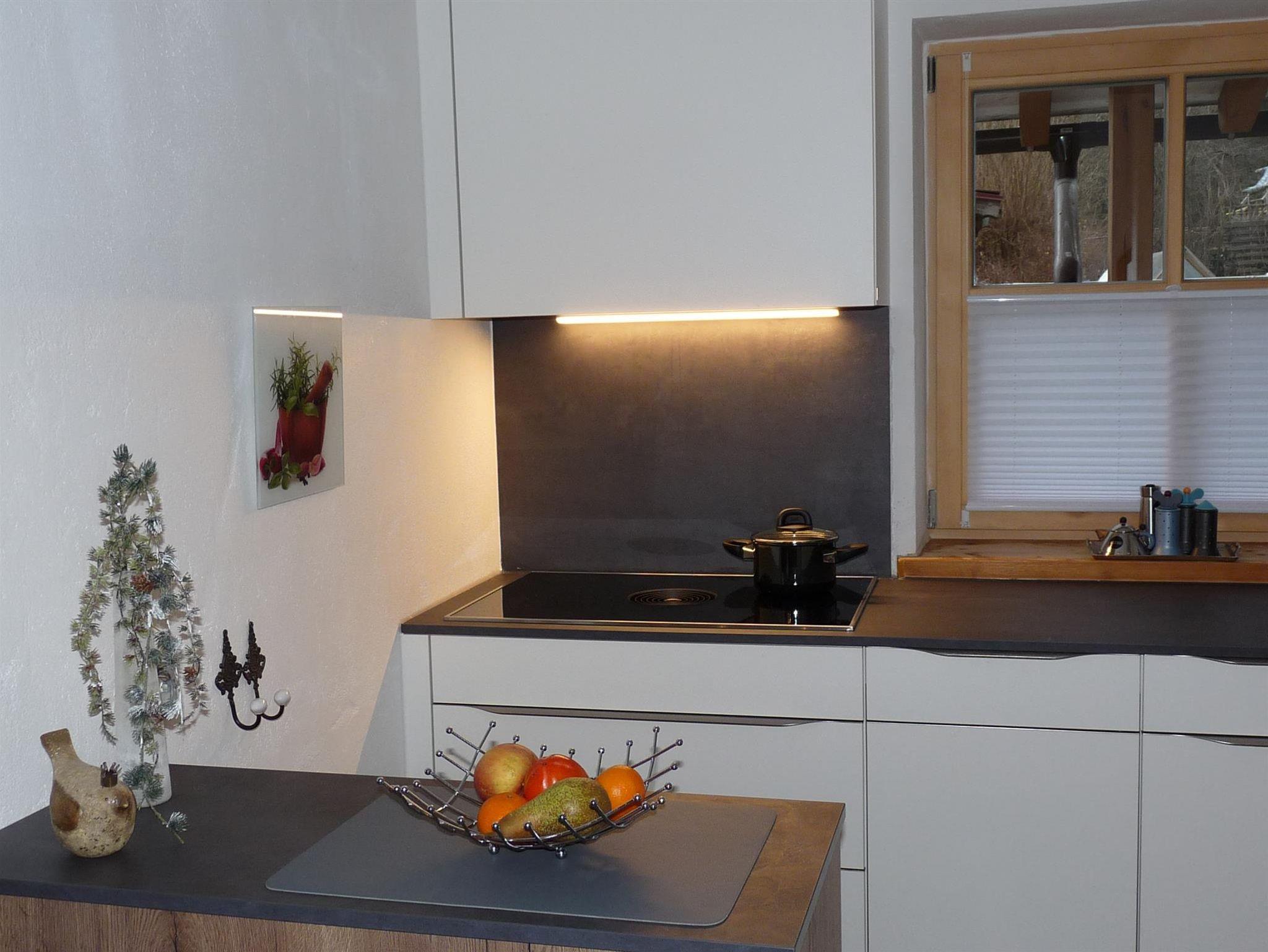 Die voll ausgestattete Küche lässt keine Wünsche offen: Spülmaschine, Cerankochfeld, Mikrowelle, Kaffeemaschine, Kühlschrank sowie weitere Küchenutensilien stehen zur Verfügung.