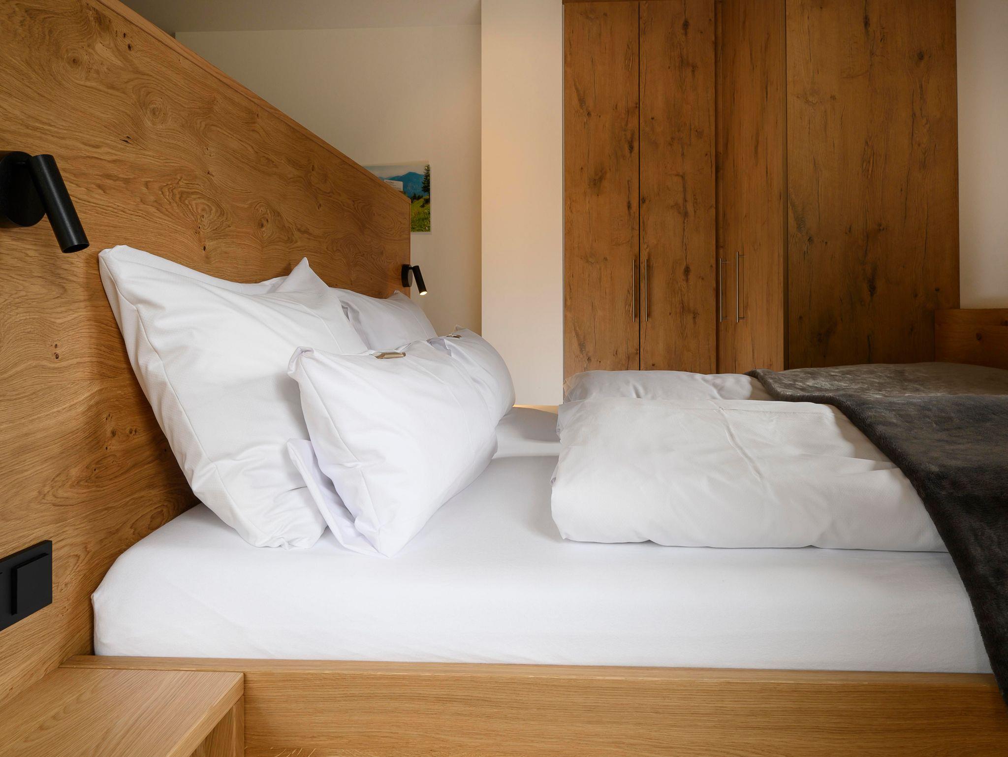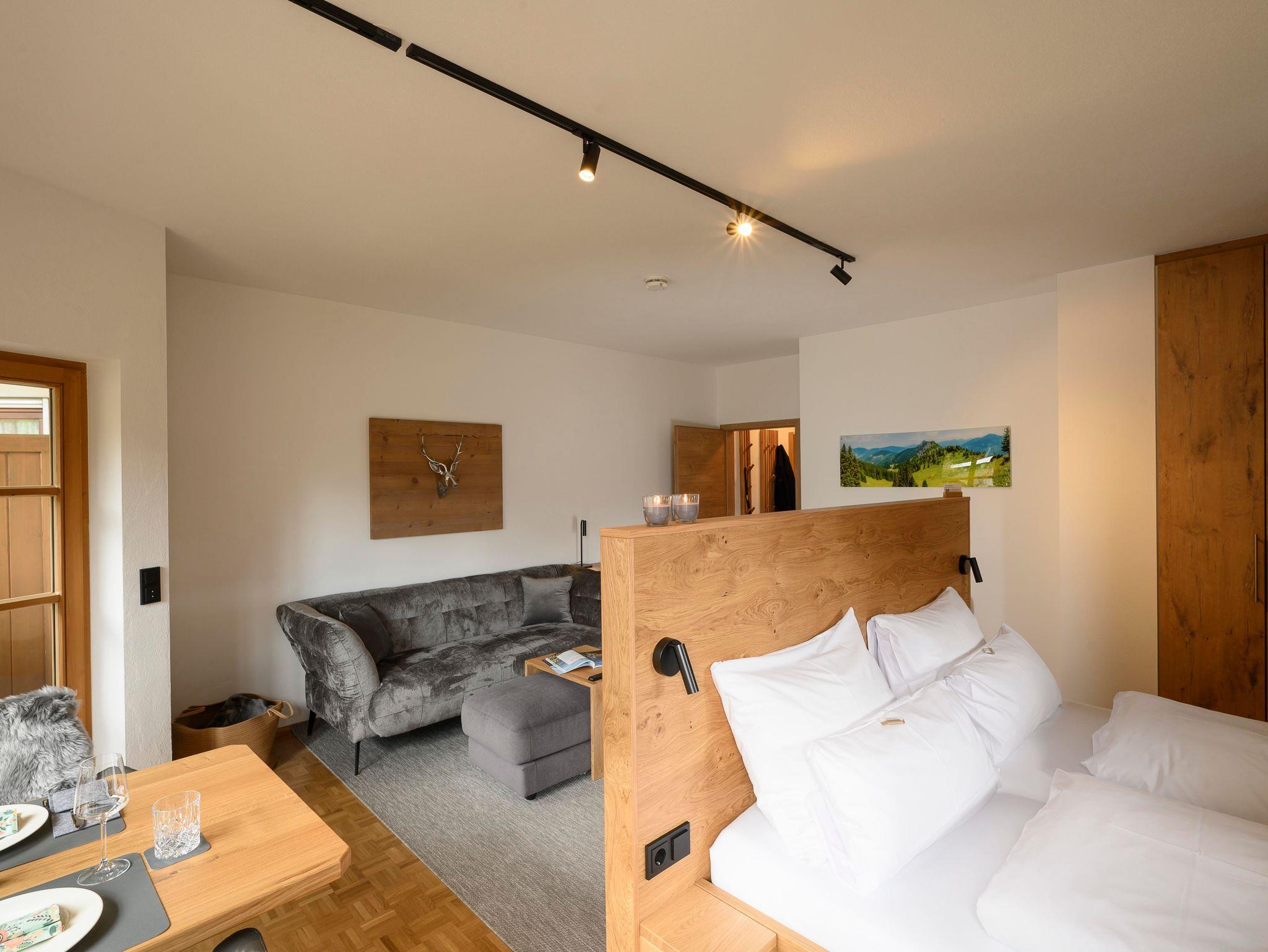 In der Ferienwohnung verspricht der helle, große und gemütliche Wohn- und Schlafbereich dank komfortablem Doppelbett eine erholsame Nachtruhe, einen schönen Eckschreibtisch, einen einladenden Essbereich mit traumhaftem Bergblick und einen gemütlichen Sitzbereich mit Smart-TV. Von hier gelangen Sie auf den wohlig ausgestatteten Balkon und genießen relaxt im Hängesessel das zauberhafte Bergpanorama.
