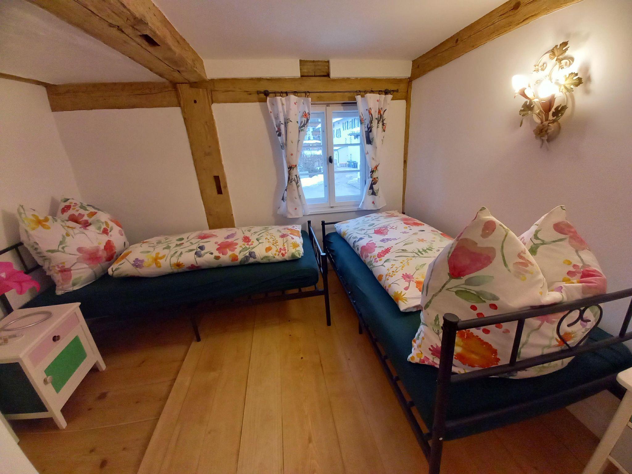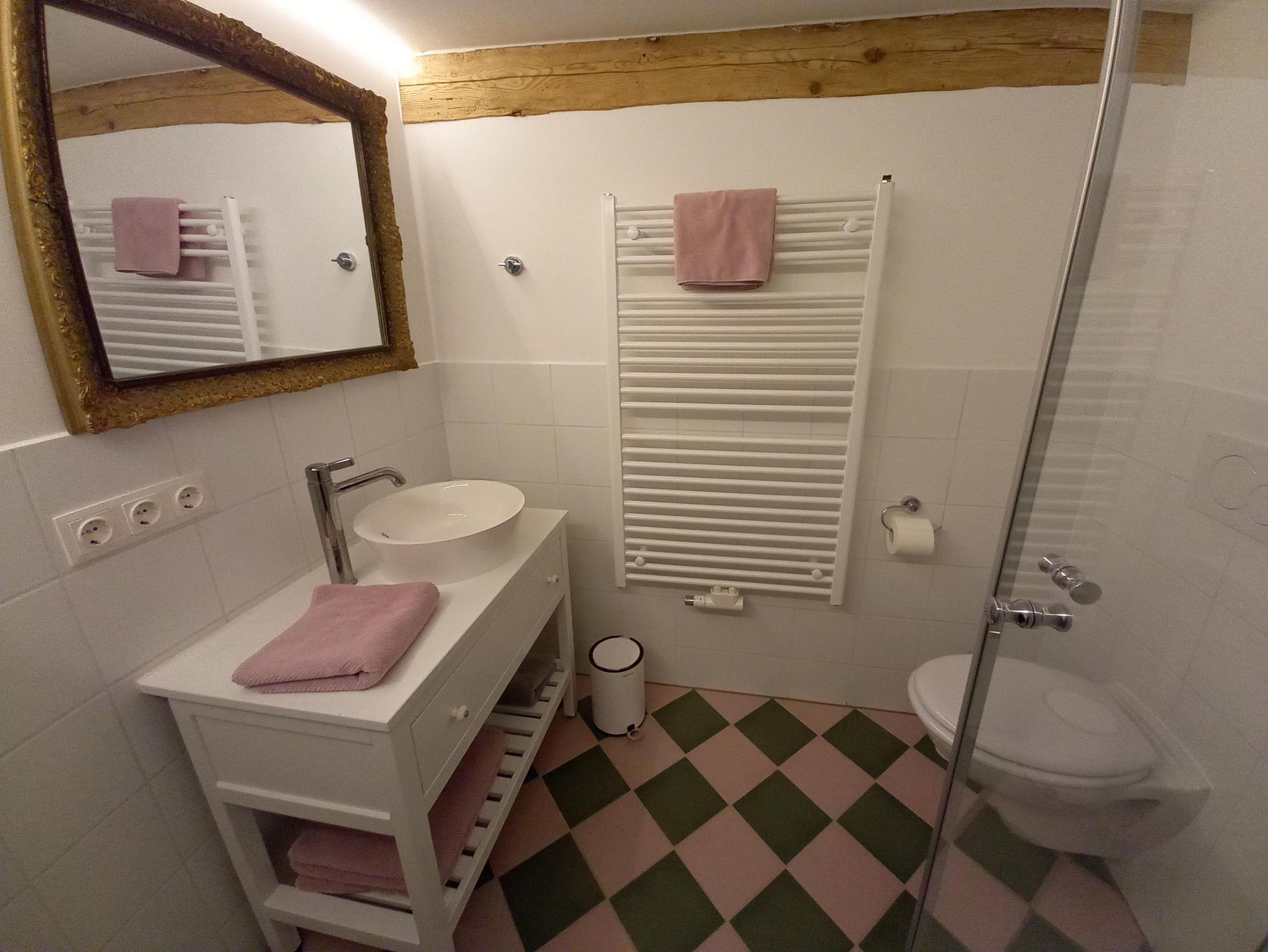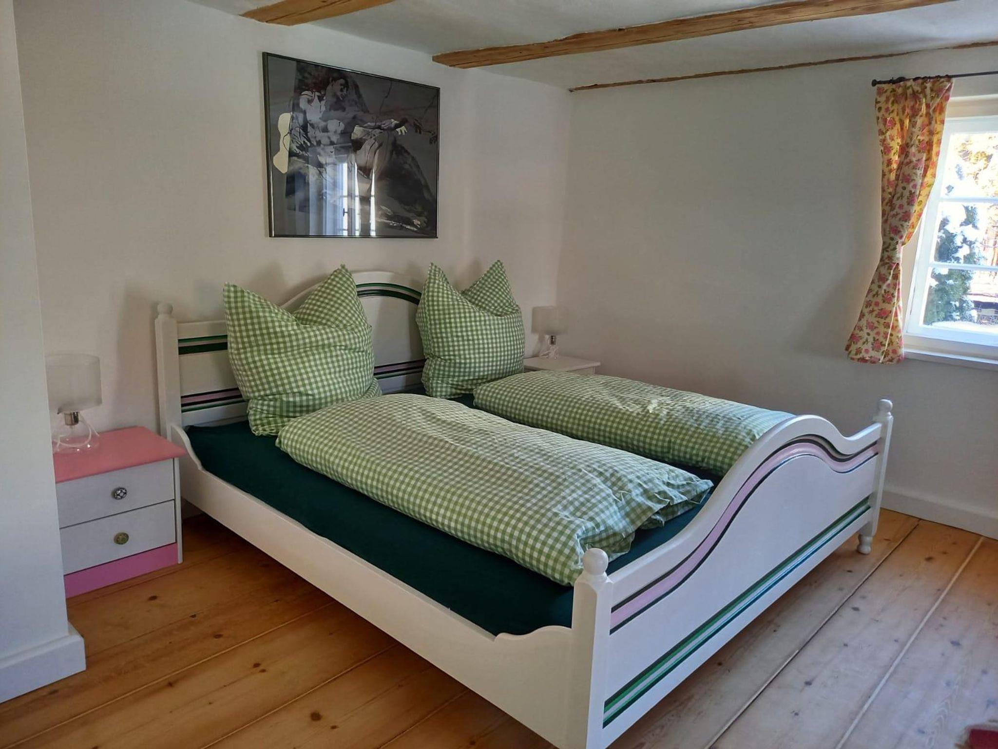 Die Ferienwohnung Rosarot liegt auf der Ostseite vom Hennalahaus, frisch renoviert verfügt sie im Erdgeschoß über ein originelles Wohnzimmer mit Sat-TV und Esstisch und eine voll ausgestattete Küche mit Backofen und Spülmaschine. Im ersten Stock befinden sich zwei Schlafzimmer, eines davon, das größere, mit Doppelbett, das kleinere mit zwei Einzelbetten. Im ersten Stock befindet sich auch das Badezimmer mit Dusche. Im ersten Stock beträgt die Deckenhöhe 2 Meter, da Sie sich in einem denkmalgeschützten Haus befinden, im Erdgeschoß ist die Deckenhöhe normal. Sie haben einen separaten Eingang, den nur Sie benutzen. Sie sind herzlich eingeladen, den Garten auf der Südseite des Hauses mitzubenutzen.