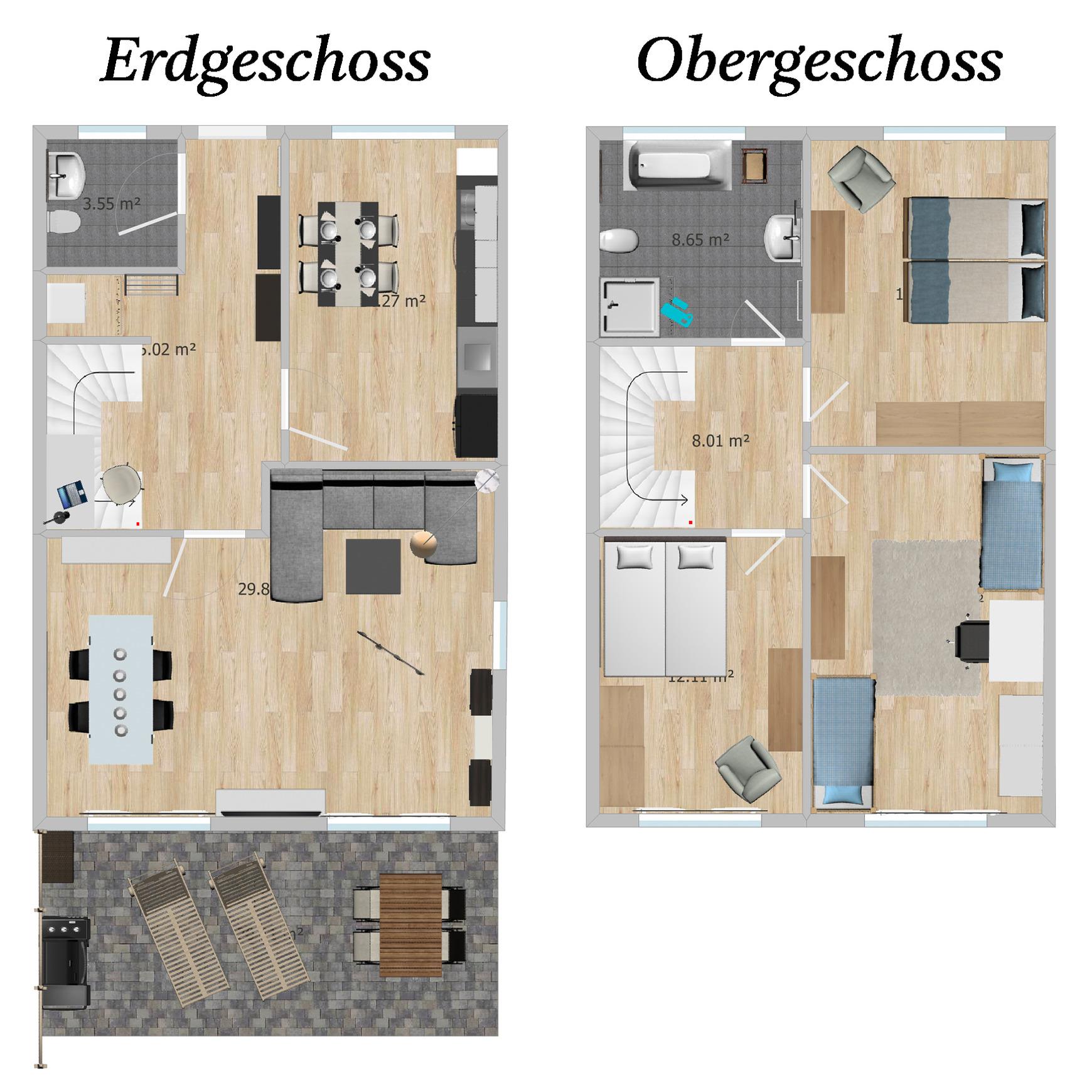 Das modern eingerichtete Haus bietet auf 140 qm Platz für bis zu 10 Personen. Genießen Sie die voll ausgestattete Küche, Internet, Fußbodenheizung und Wohnbereich mit TV. Außen warten ein kleiner Garten mit Grill und Gartenmöbeln und mehrere Parkplätze direkt am Haus.