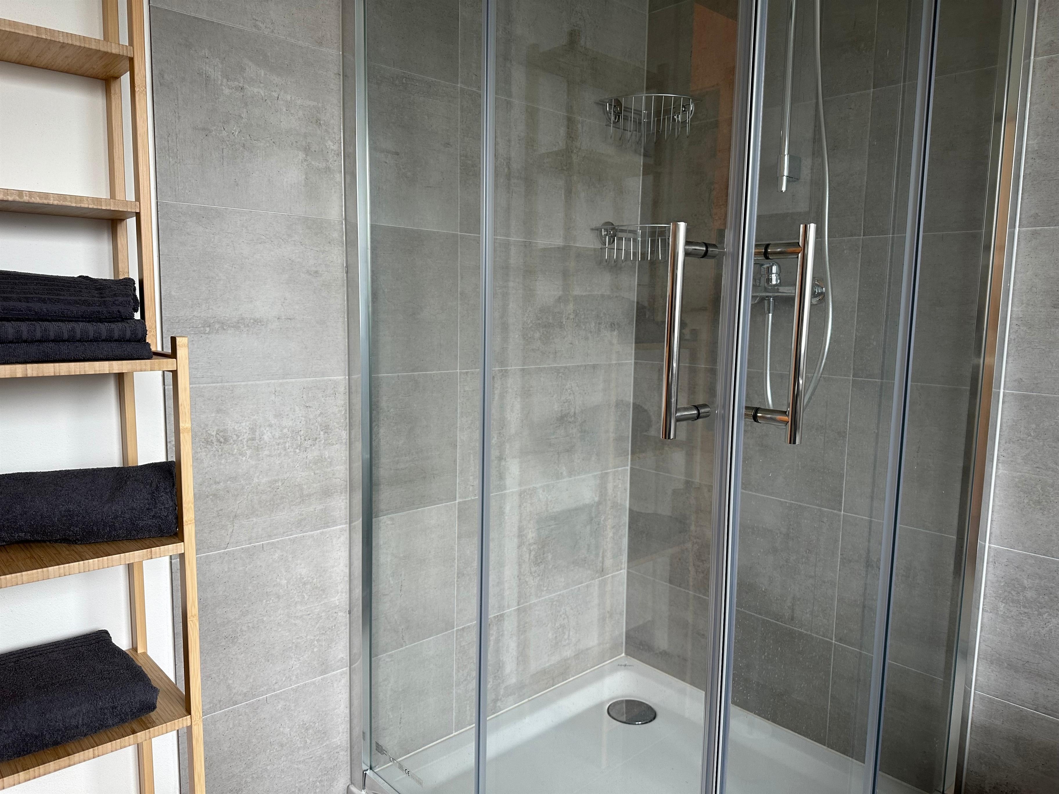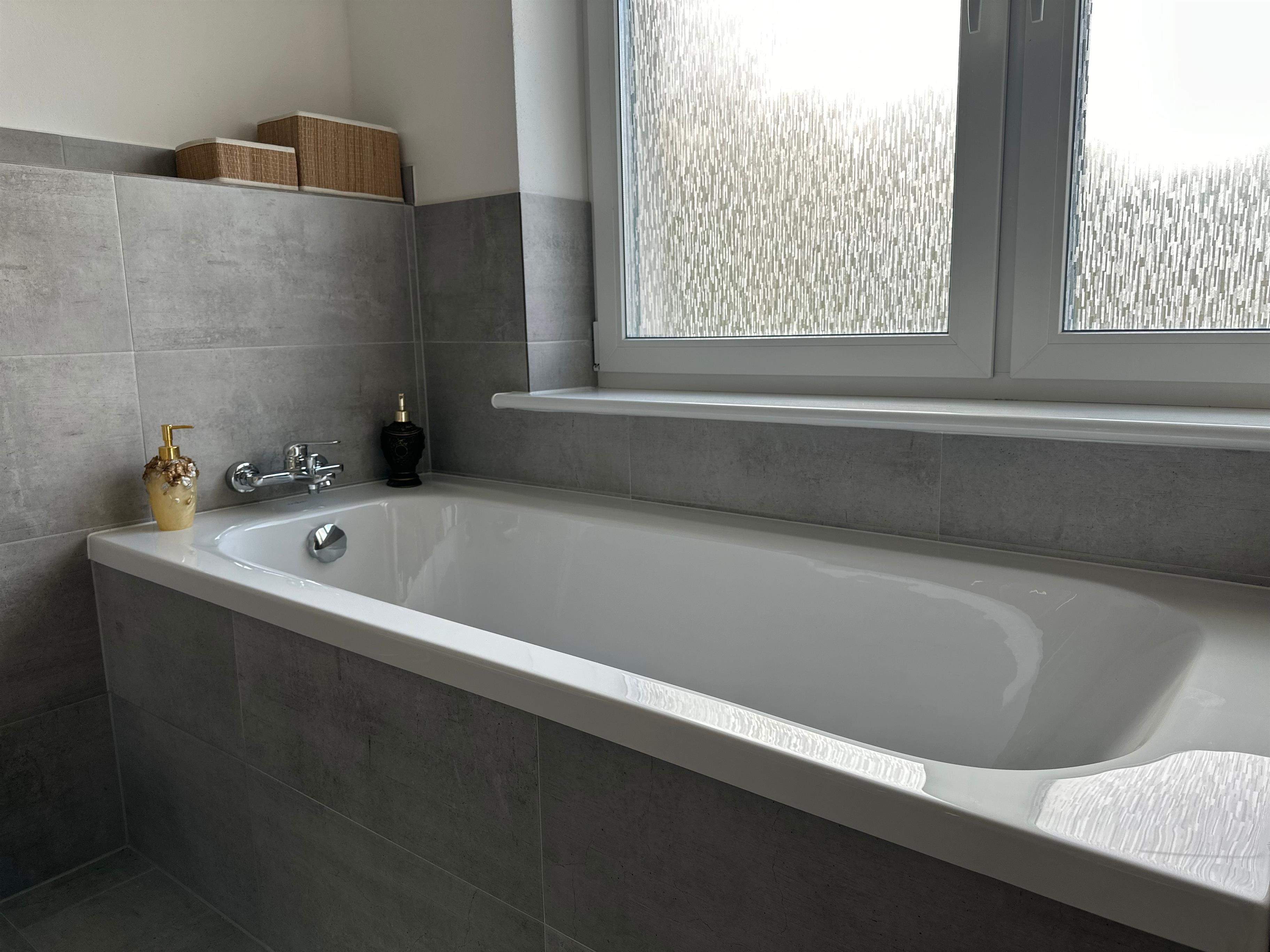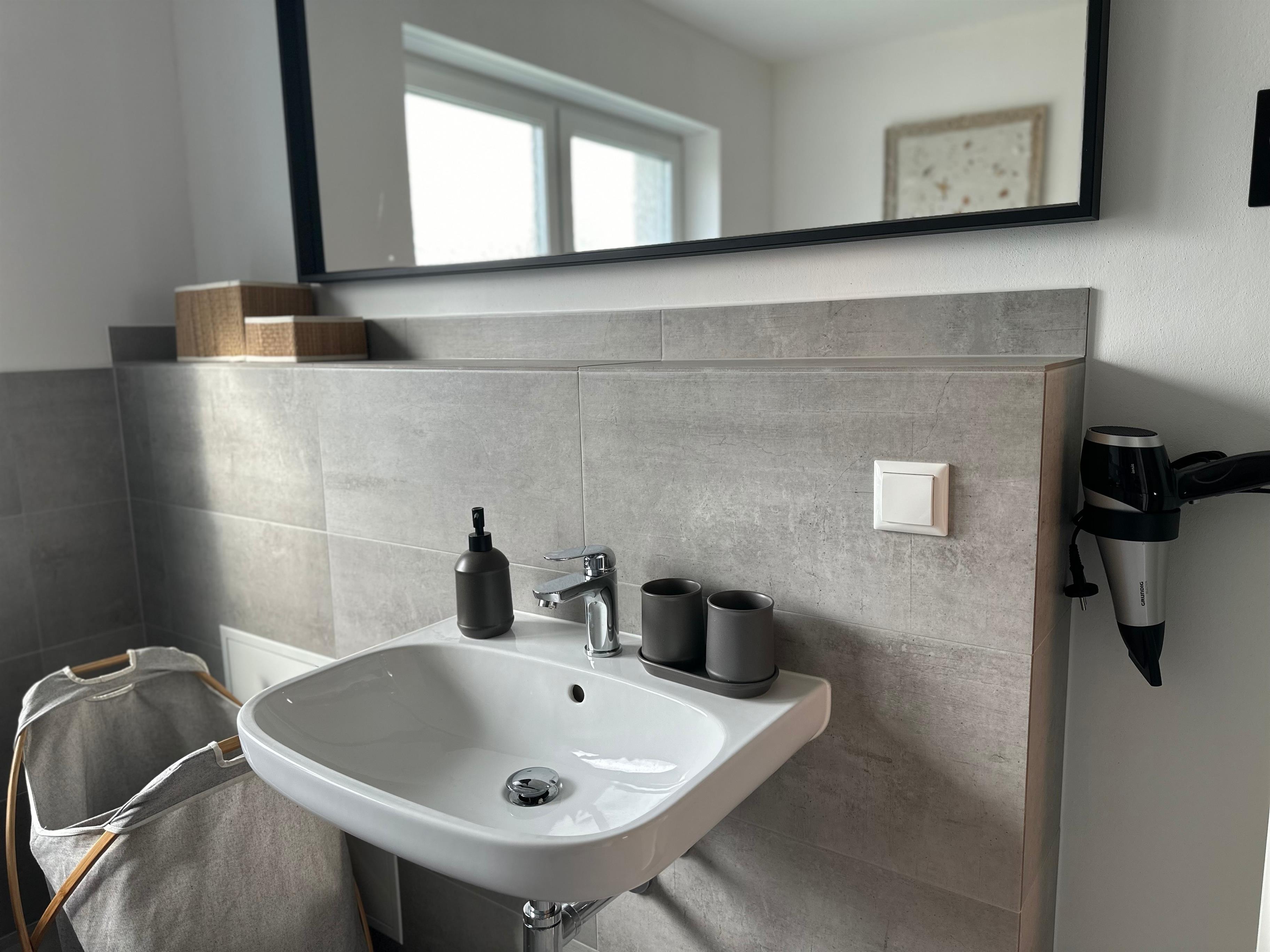 - Badezimmer mit Badewanne, Dusche und Fön sowie zusätzlichem Gäste-WC