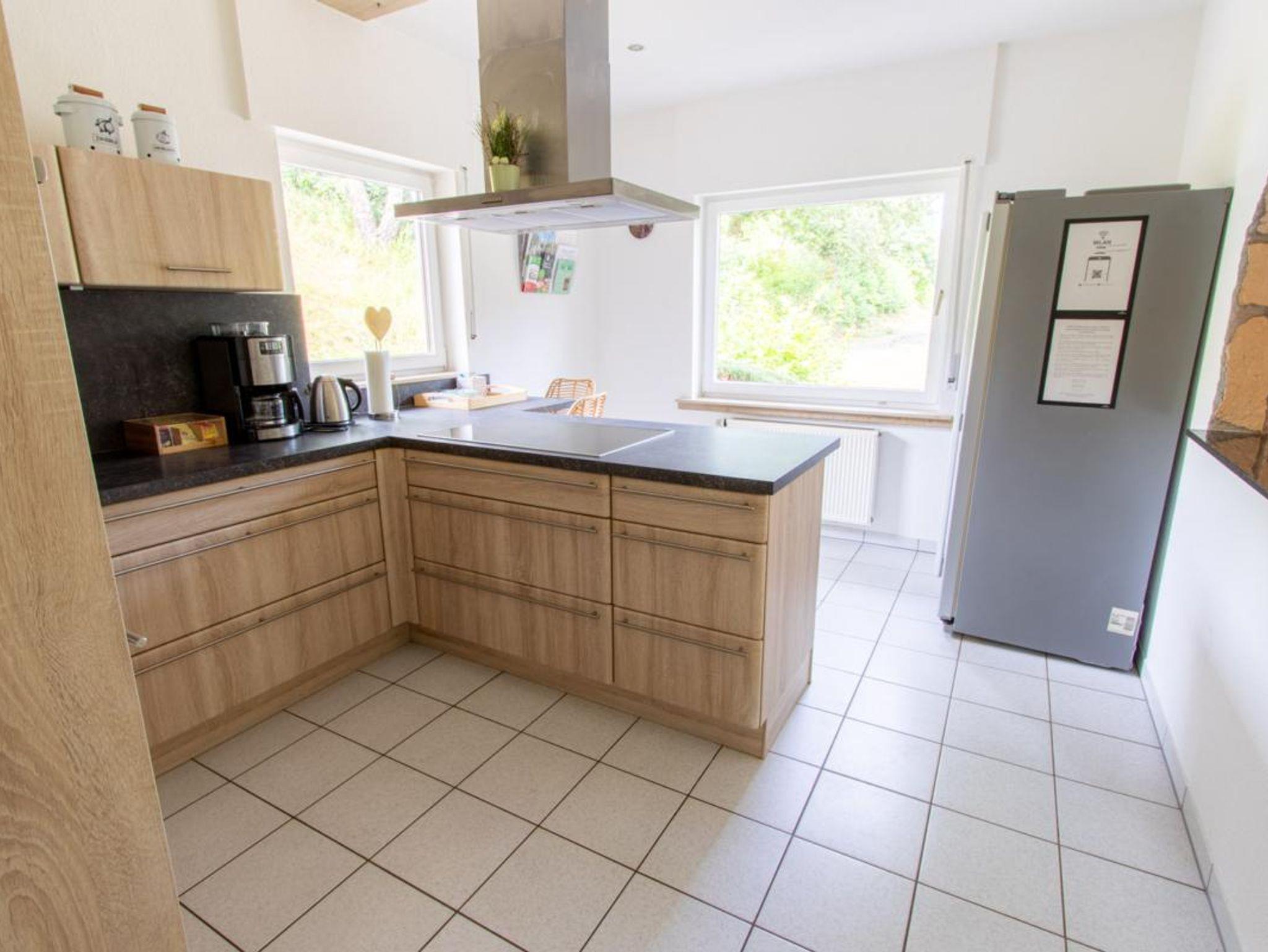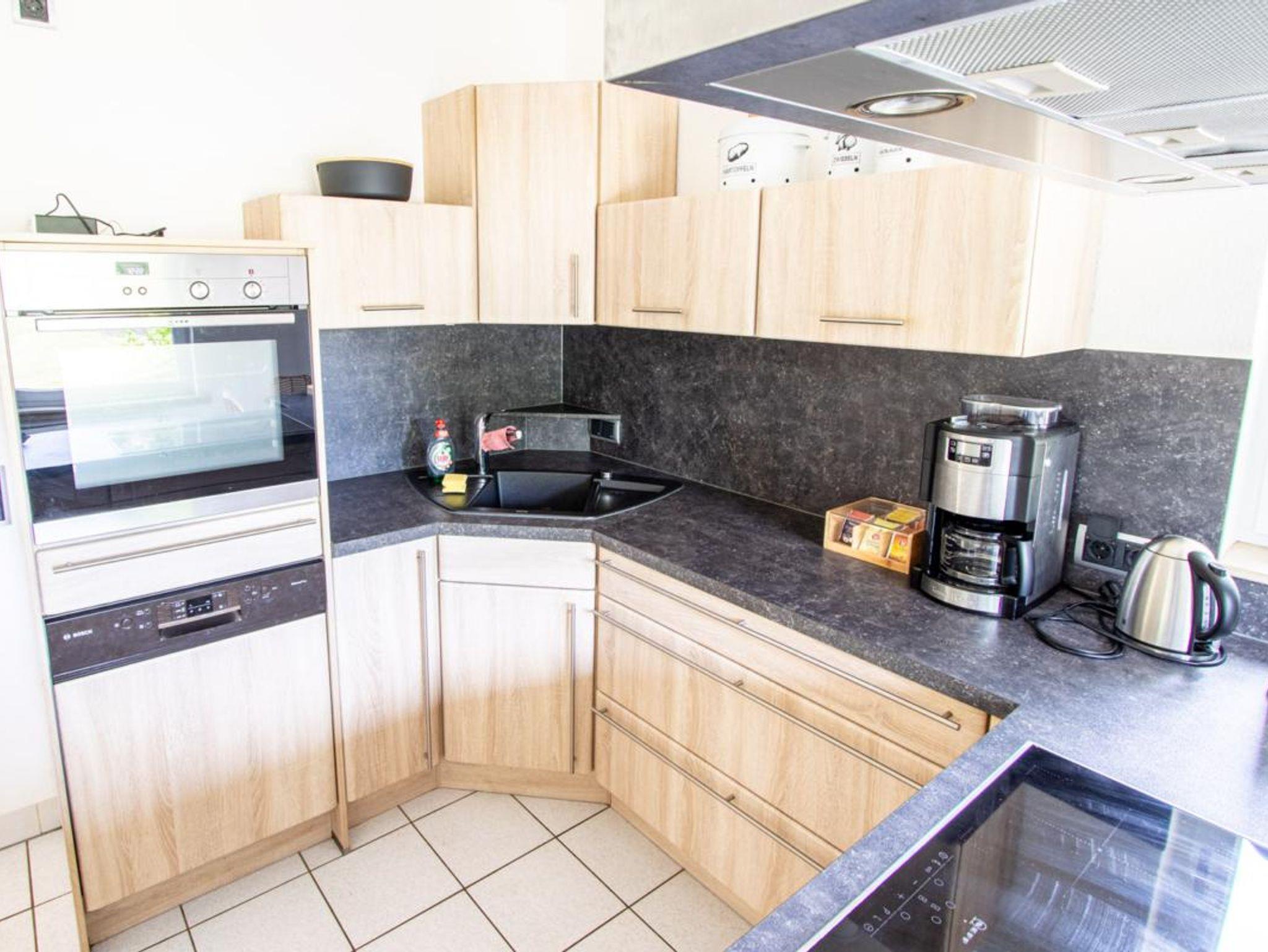 Voll ausgestattete Küche mit hochwertigen Elektrogeräten, Spülmaschine, Cerankochfeld, erhöhter Backofen, Side-by-side-Kühlschrank mit Gefriermöglichkeit, Kaffeemaschine, Wasserkocher, Toaster, Mixer, Radio.