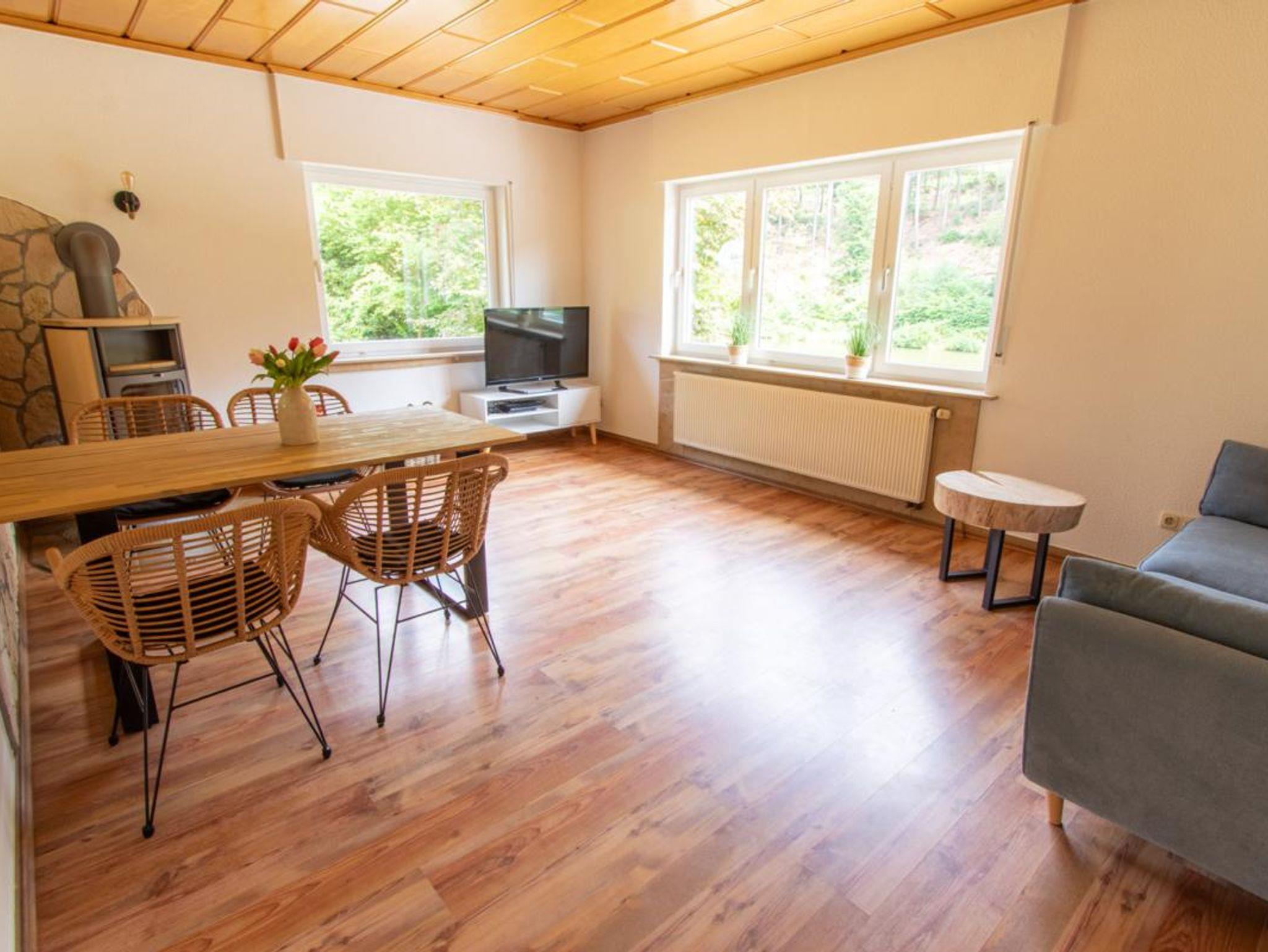 Wohnzimmer mit Esstisch für 4 Personen, Schlafsofa (1 Matratze, Liegefläche 140x200 cm), Flachbild-TV mit Satellitenempfang und DVD-Player, Holzofen, Gesellschaftsspiele.