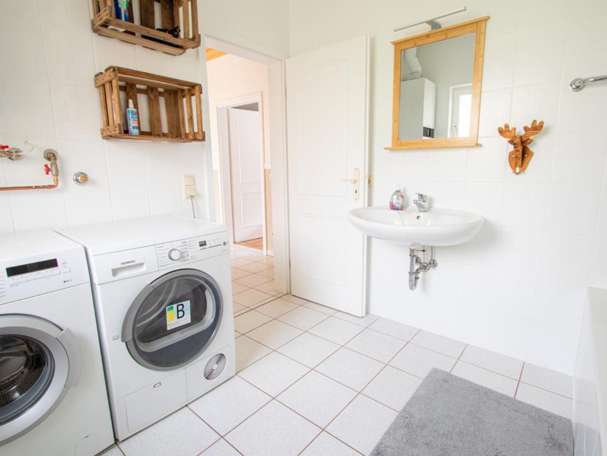 Badezimmer mit Badewanne mit Wannendusche, WC, Waschmaschine, Trockner, Haarföhn.