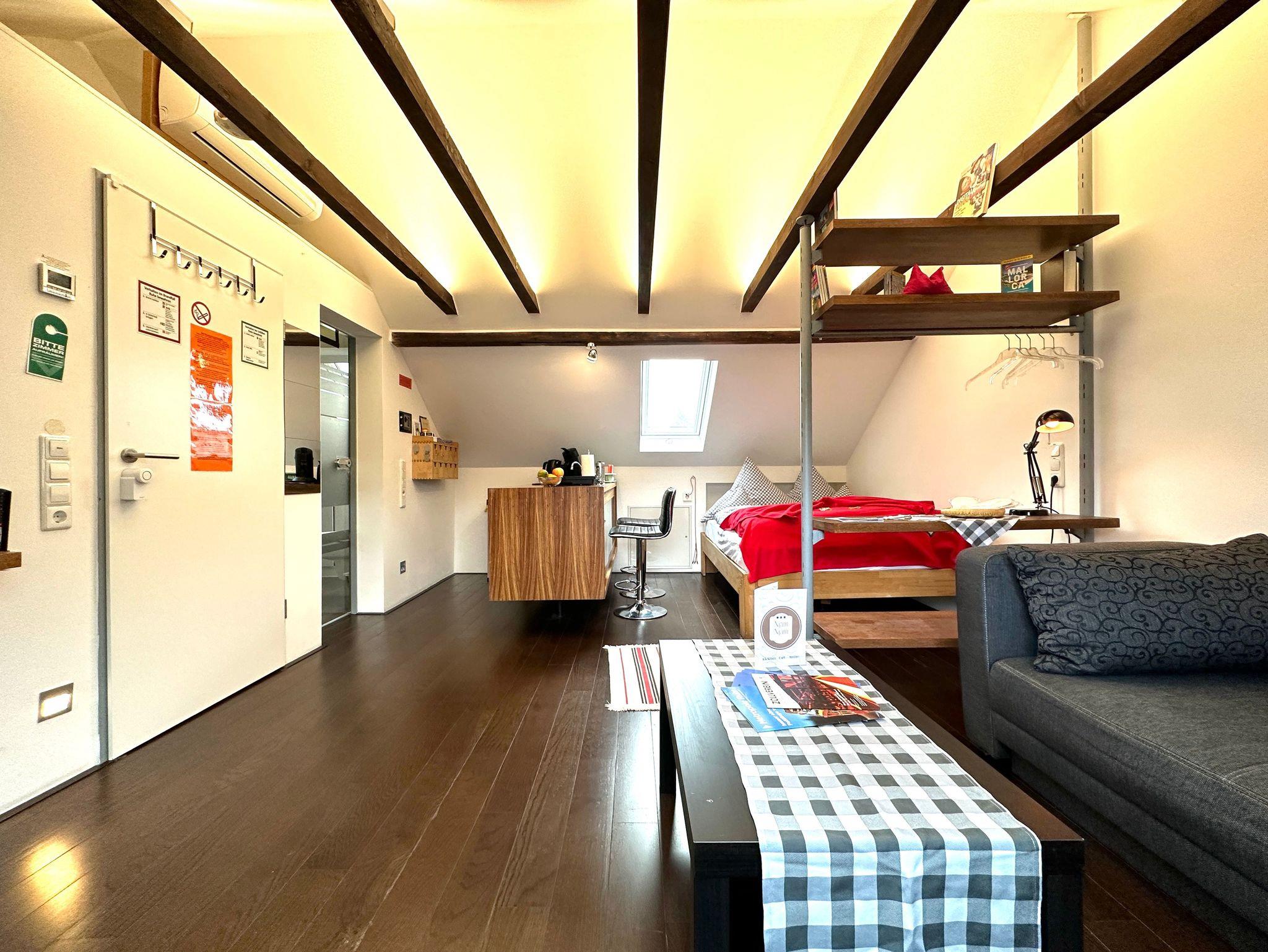 Das Besondere an der 25 m² großen Dachgeschosswohnung ist ihr freundliches sonniges Flair. Sie bietet für alles, was man für einen angenehmen Aufenthalt braucht: ein gemütliches Wohn-/Schlafzimmer mit einem 140x200 Bett, SAT-TV, kleiner Küchenzeile mit allem Notwendigem ausgestattet und ein Duschbad mit Waschbecken und Toilette. Die Wohnung bietet Platz für max. 3 Personen, durch eine zusätzliche Schlafcouch.
