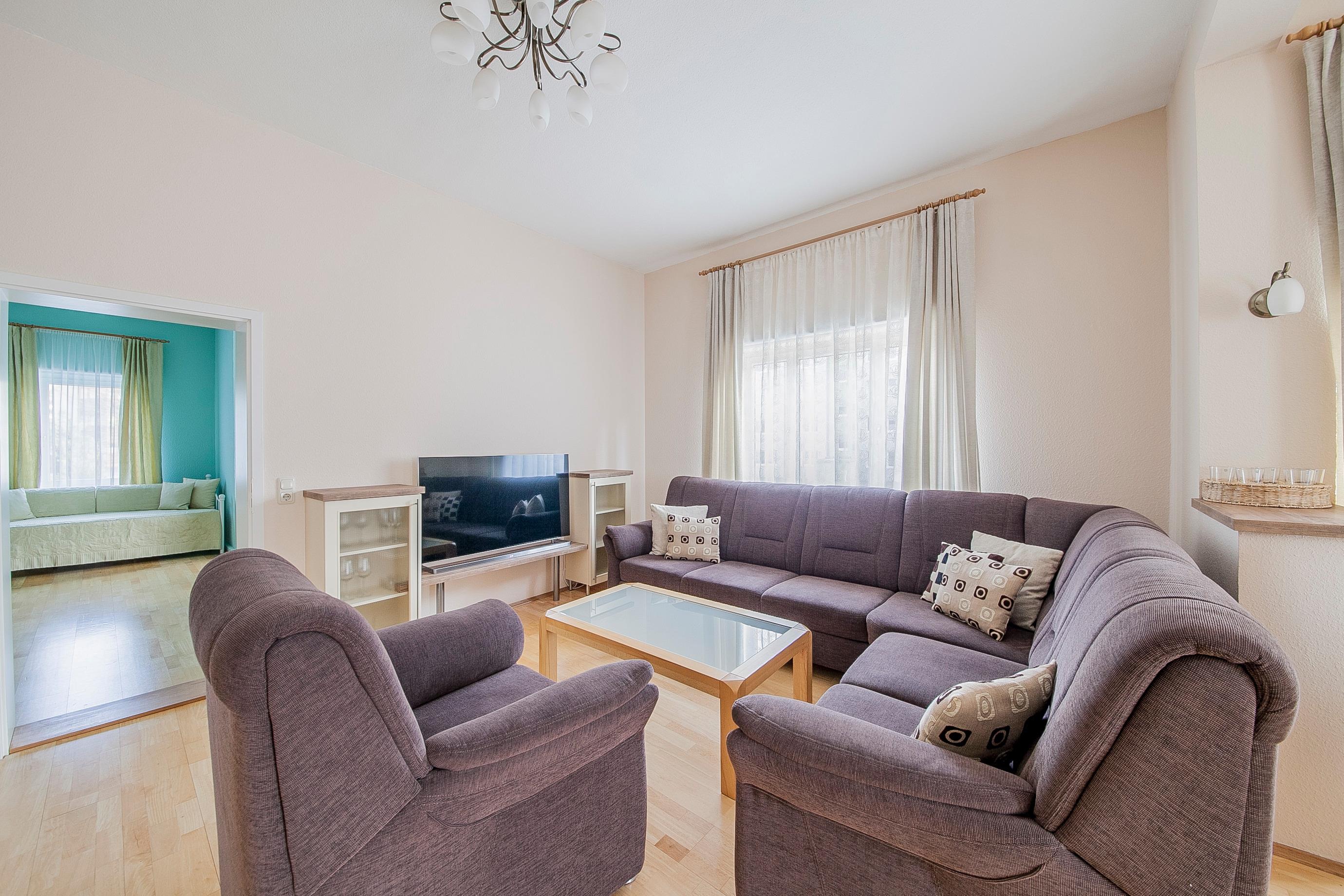 Die Ferienwohnung Deluxe verfügt auf der gesamten Fläche über einen edlen, hellen Parkettfußboden mit drei eingebauten LED-Leuchten im Essbereich. Im großzügigen Wohnraum befindet sich eine einladende Couchgarnitur, ein Couchtisch aus hochwertigem, massivem Holz, und im Medienbereich ein 139 cm (55 Zoll) großes Full-HD-Flat-TV mit WLAN Anschluss, das Sie nach einem erlebnisreichen Tag im Freien oder auch beim entspannenden "Couchtag" mit Kinoatmosphäre verwöhnt und Ihnen durch außergewöhnliche Filmerlebnisse oder auch die hautnahe Verfolgung von Sportübertragungen einen besonderen Urlaubsaufenthalt garantiert.