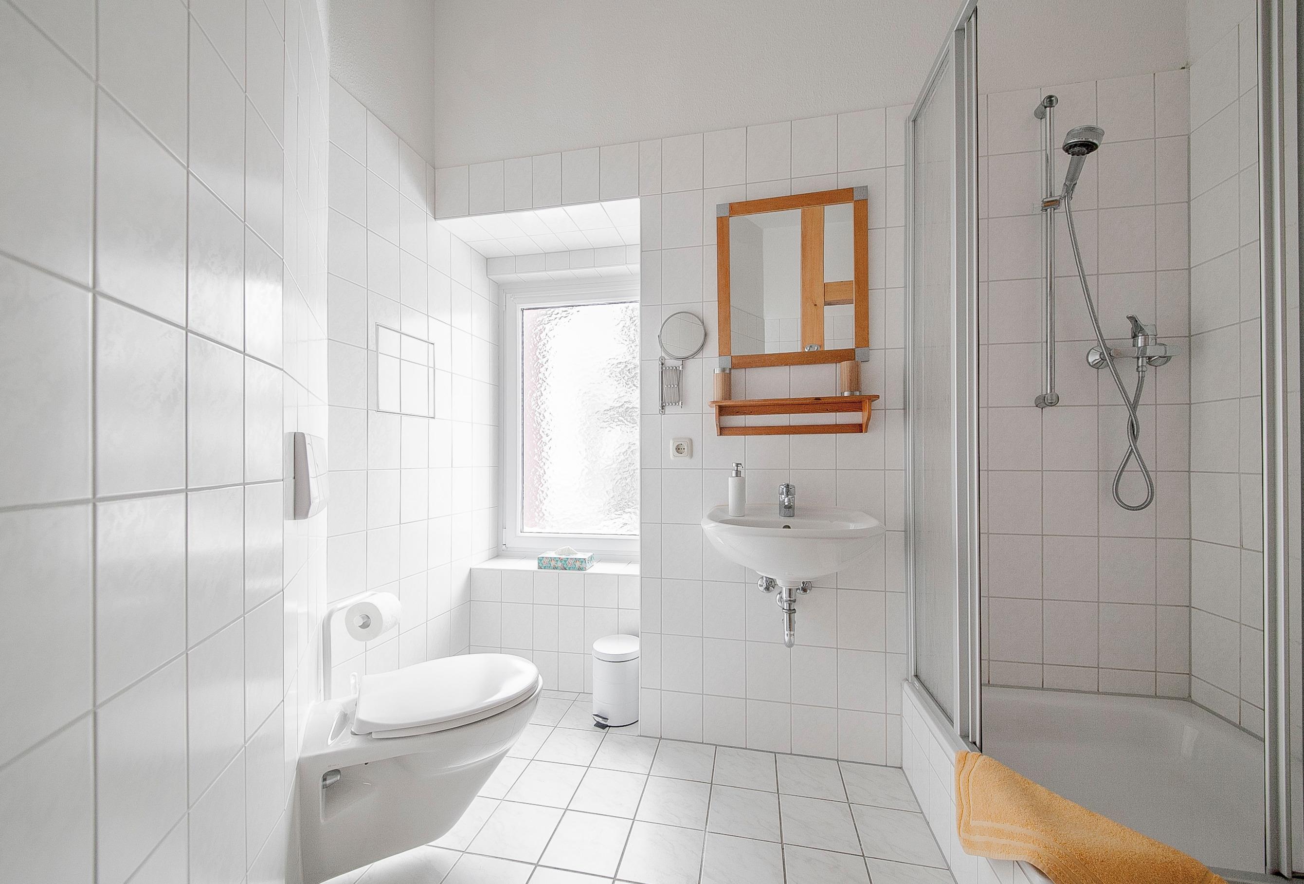 Dusche und WC finden Sie im ansprechenden Badezimmer mit Fenster. Frische Hand- und Badetücher werden Ihnen für die Dauer des Aufenthaltes gestellt.