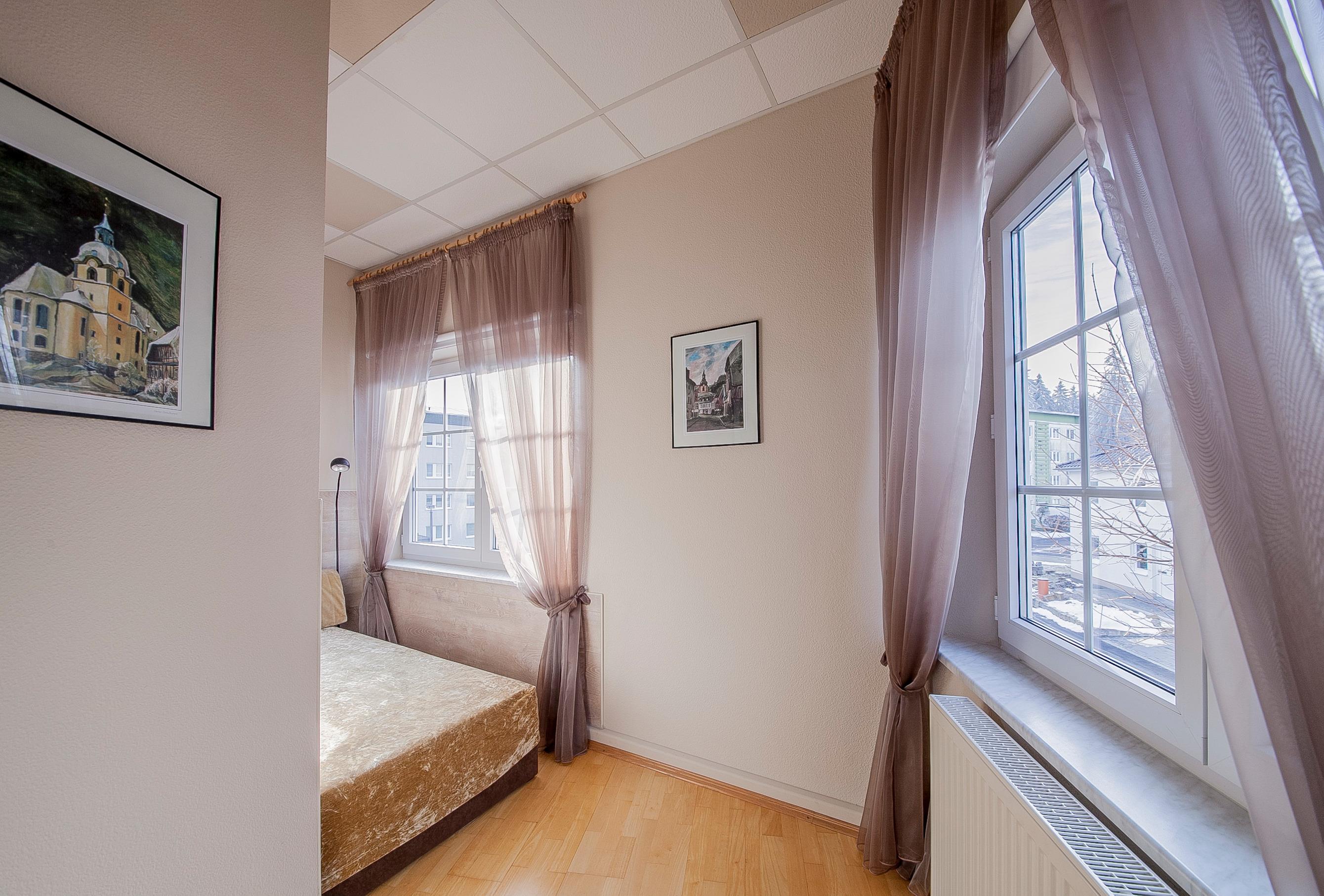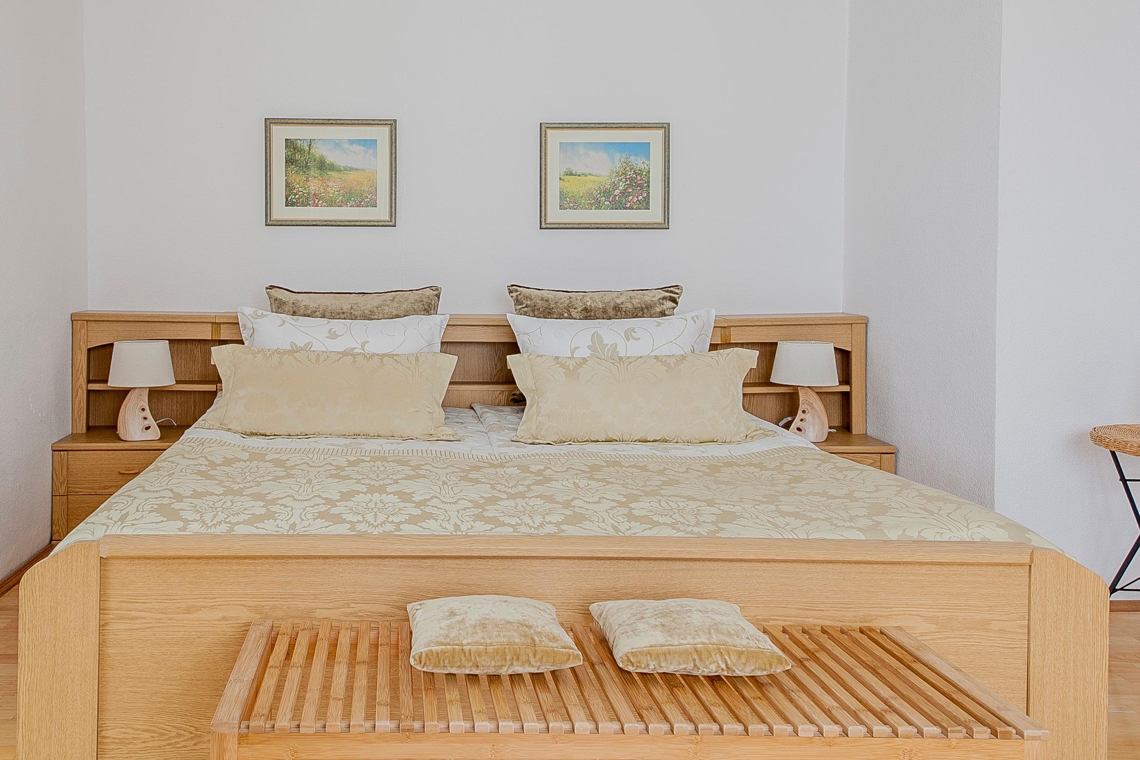 Für einen erholsamen Schlaf finden Sie bei uns ein gemütliches Doppelbett (200x200). Außerdem bietet das Zimmer ein Einzelbett und die Couch kann zu einem Bett ausgezogen werden.