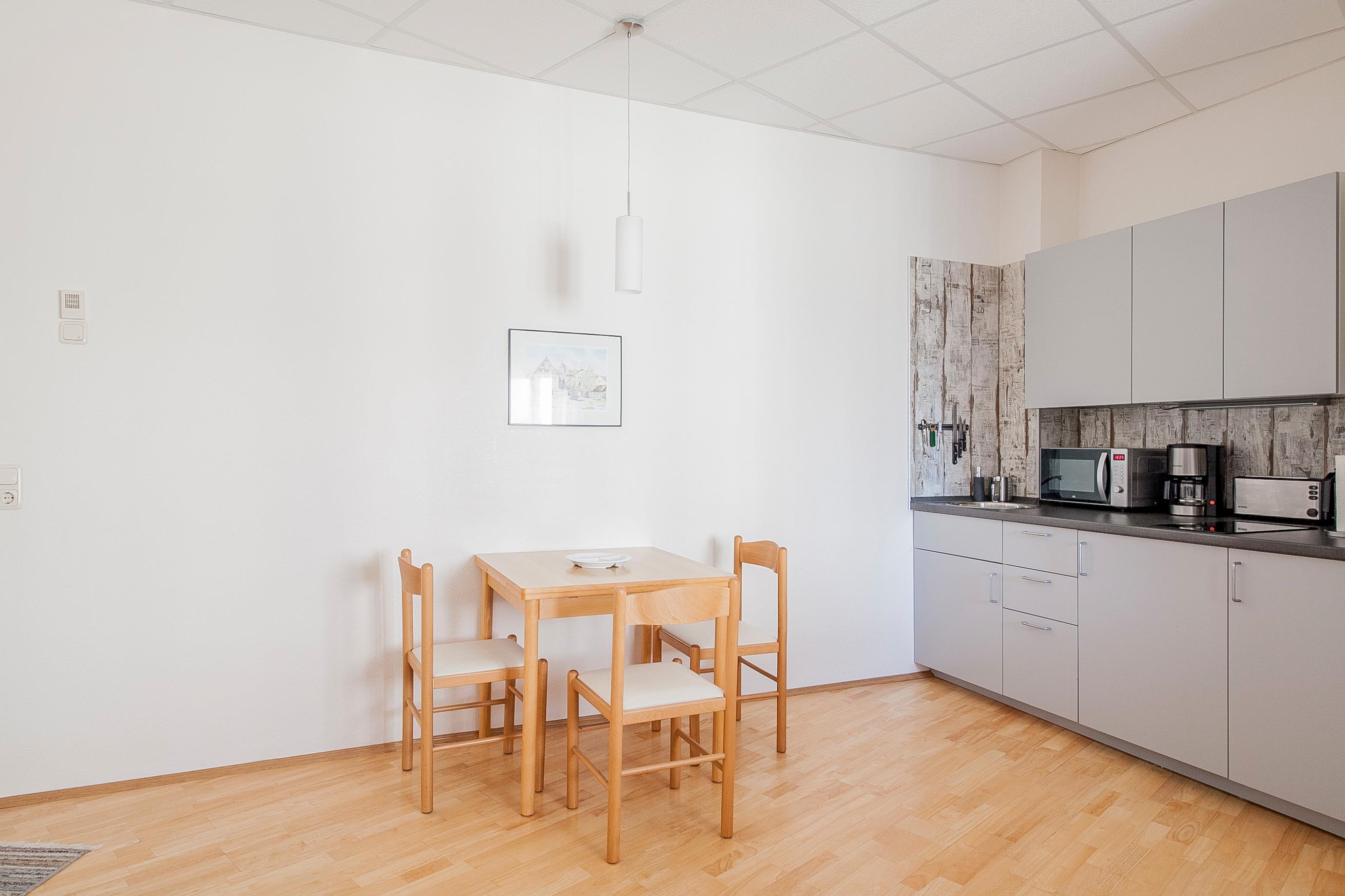 Komfortabel und komplett ausgestattet (2-Plattenherd, Kühlschrank mit Gefrierfach, Toaster, Kaffeemaschine, und Wasserkocher) ist unsere offene Küche. Küchentücher werden selbstverständlich von uns gestellt. Im sich anschließenden Essbereich mit Tisch und Stühlen können Sie mit 3 Personen angenehm verweilen.