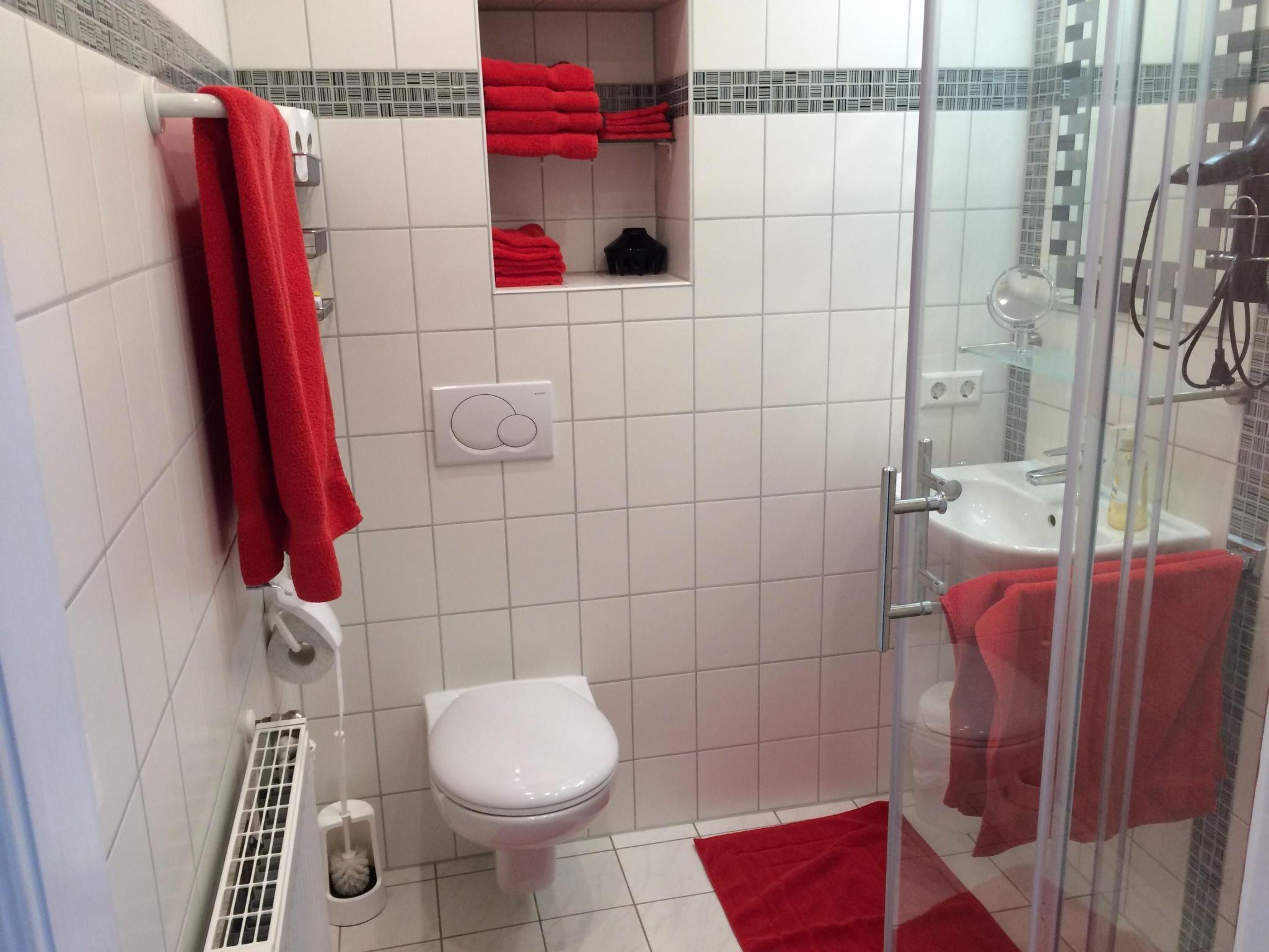 The holiday flat offers space for the whole family and/or for friends. The living space of 105 square metres is spread over two floors. The living and dining area with kitchen is on the ground floor. A shower with WC is also available here. The sleeping area is on the 1st floor, also with a shower and WC.
