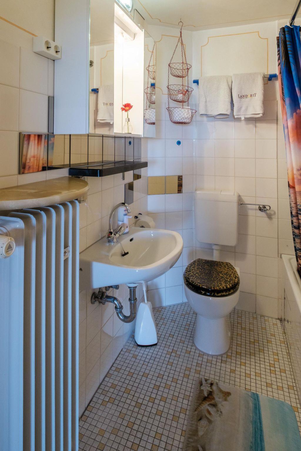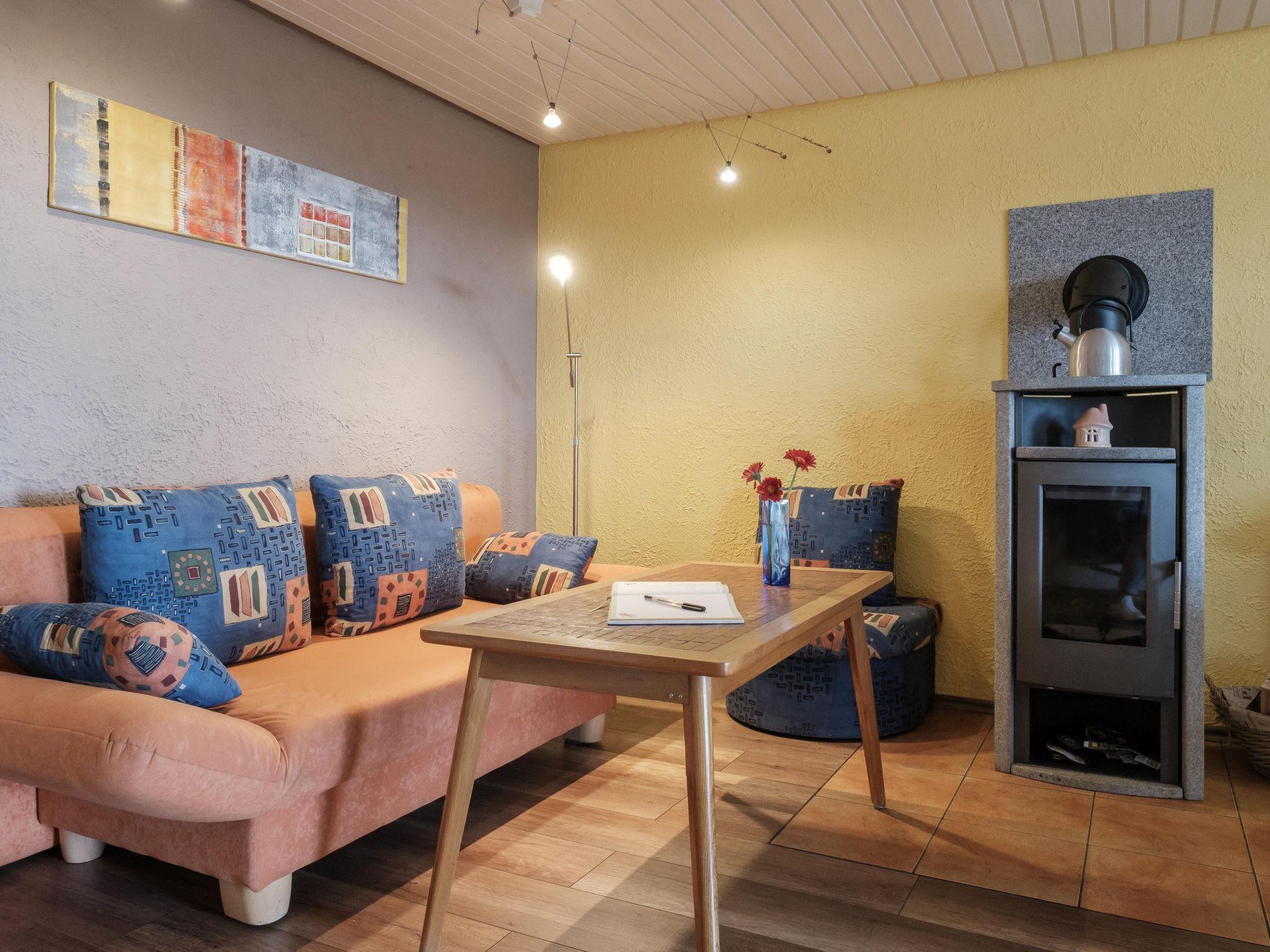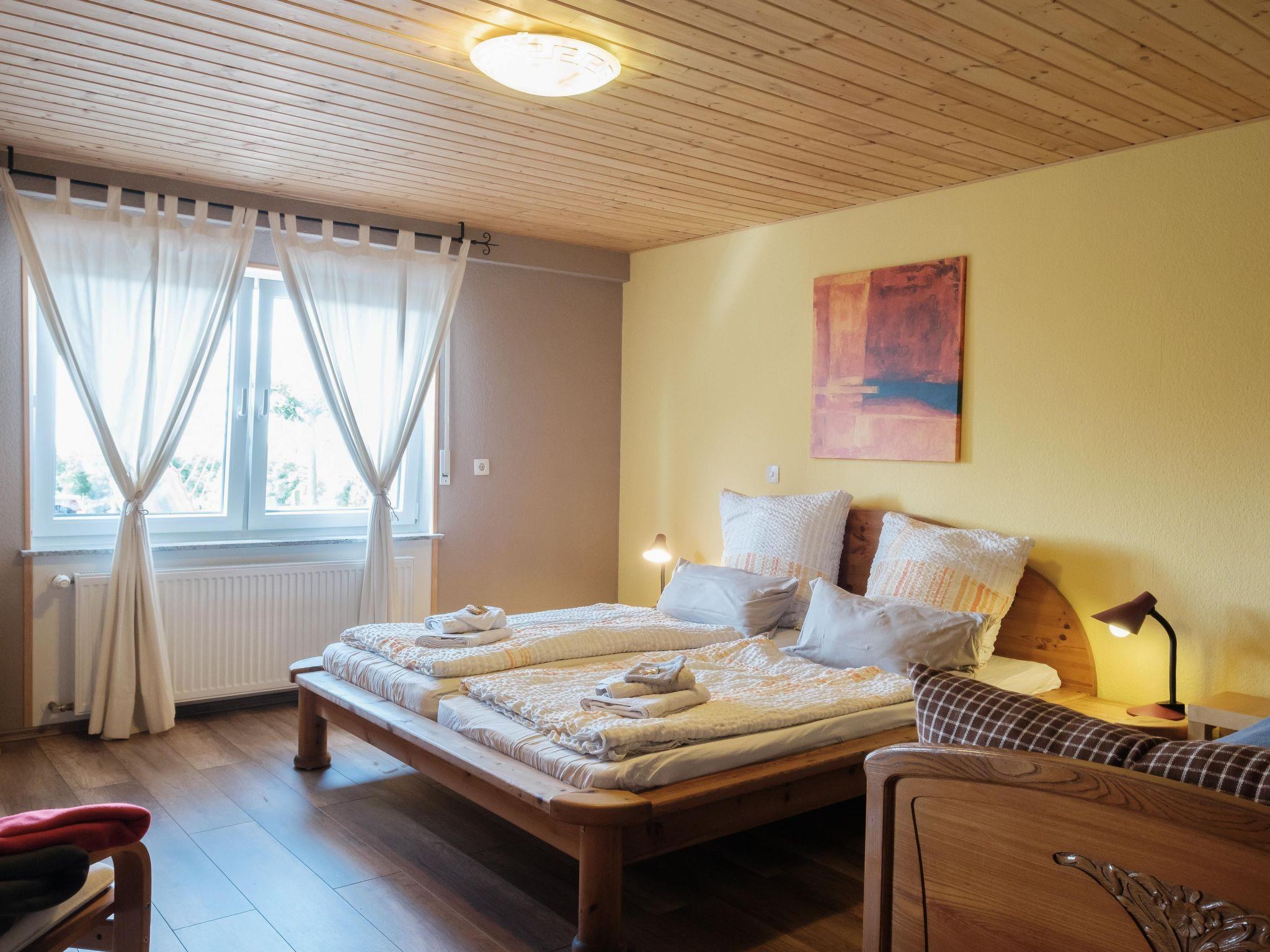 The family-friendly holiday flat is suitable for two to five people, including a maximum of 3 adults. It comprises a bedroom with double bed (180 x 200 cm) and single bed (90 x 200 cm) and possibly an extra bed, a kitchen, a living room with pull-out sofa (150 x 200 cm) and a bathroom with bathtub with shower attachment and WC. The fully equipped kitchen has a fridge with freezer compartment, dishwasher, kettle, coffee machine, toaster, microwave, crockery and cutlery. The flat also has a radio, satellite TV and oil central heating with radiators in all rooms except the kitchen and a wood-burning stove for romantic evenings. Towels, bed linen and table linen are provided. Final cleaning and WLAN are included in the price.
