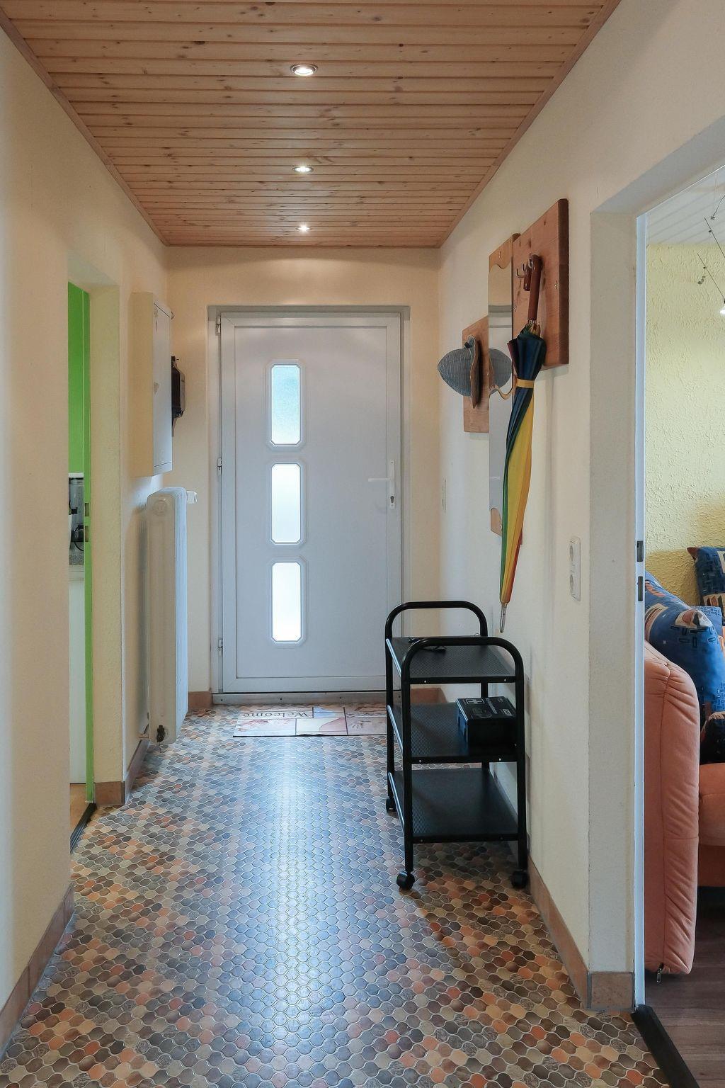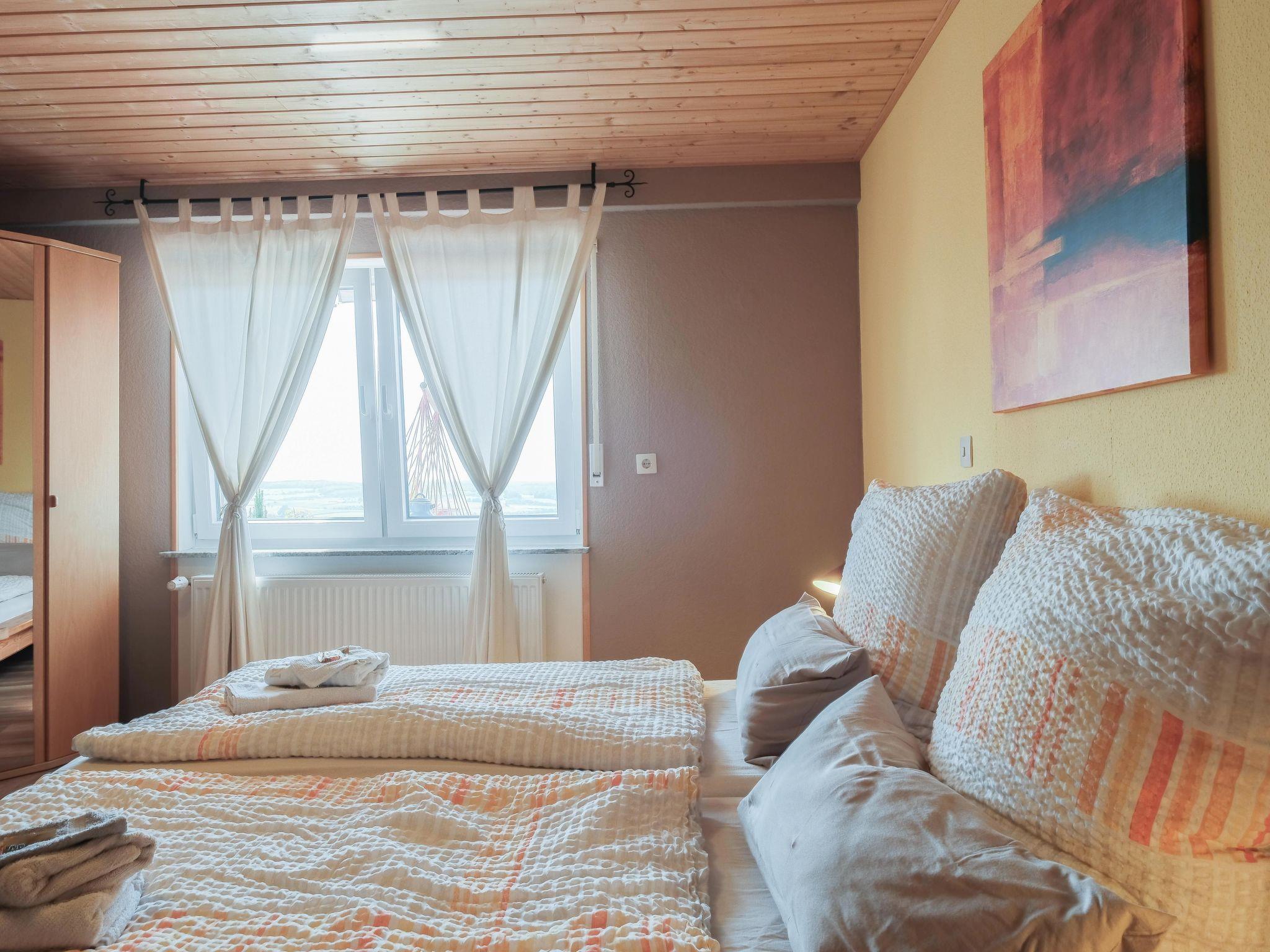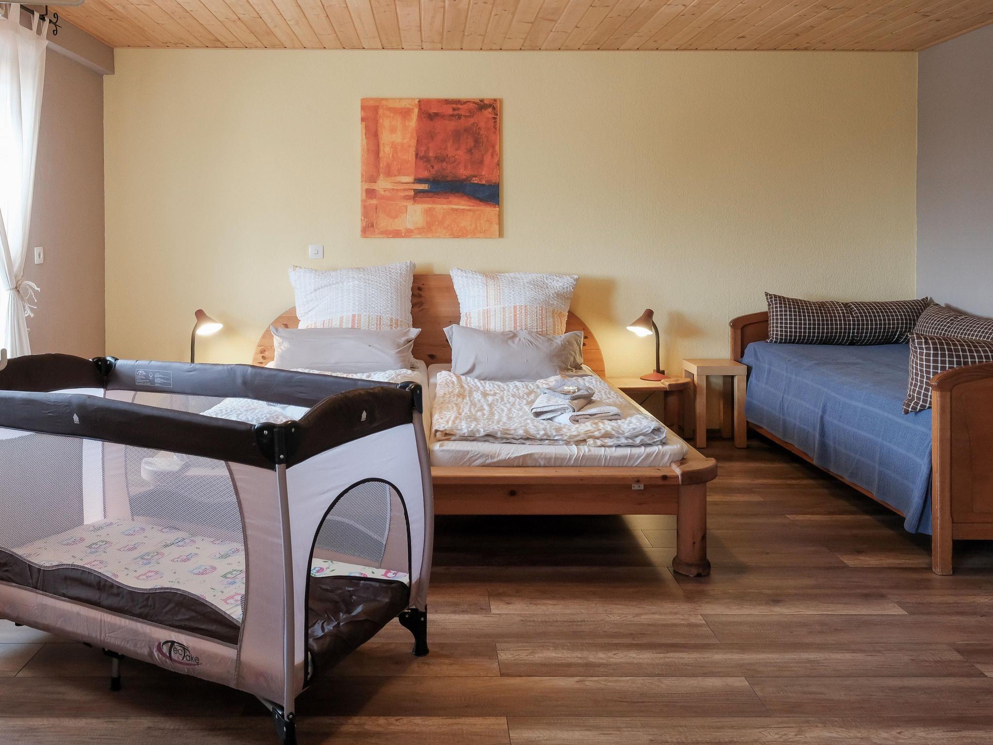 The family-friendly holiday flat is suitable for two to five people, including a maximum of 3 adults. It comprises a bedroom with double bed (180 x 200 cm) and single bed (90 x 200 cm) and possibly an extra bed, a kitchen, a living room with pull-out sofa (150 x 200 cm) and a bathroom with bathtub with shower attachment and WC. The fully equipped kitchen has a fridge with freezer compartment, dishwasher, kettle, coffee machine, toaster, microwave, crockery and cutlery. The flat also has a radio, satellite TV and oil central heating with radiators in all rooms except the kitchen and a wood-burning stove for romantic evenings. Towels, bed linen and table linen are provided. Final cleaning and WLAN are included in the price.