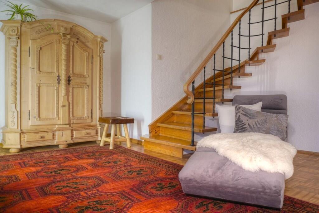 Vores ferielejlighed I er bygget i maisonette-stil og tilbyder masser af plads med 84 m² boligareal. Den er lys og fyldt med naturligt lys, har to altaner og sikrer et afslappende ophold. Smuk, stor stue med panoramavinduer og en fantastisk udsigt Lyst køkken med spiseplads og opvaskemaskine To solrige altaner med udsigt over vores fortryllende landskab og unikke bjerglandskab To soveværelser med dobbeltsenge (180 x 200 cm), hvoraf det ene nu også har en håndvask Moderne brusebadeværelse med bruseniche og hovedbruser Separat toilet Entré med garderobe og indbyggede skabe Én parkeringsplads pr. lejlighed på vores grund ved siden af huset