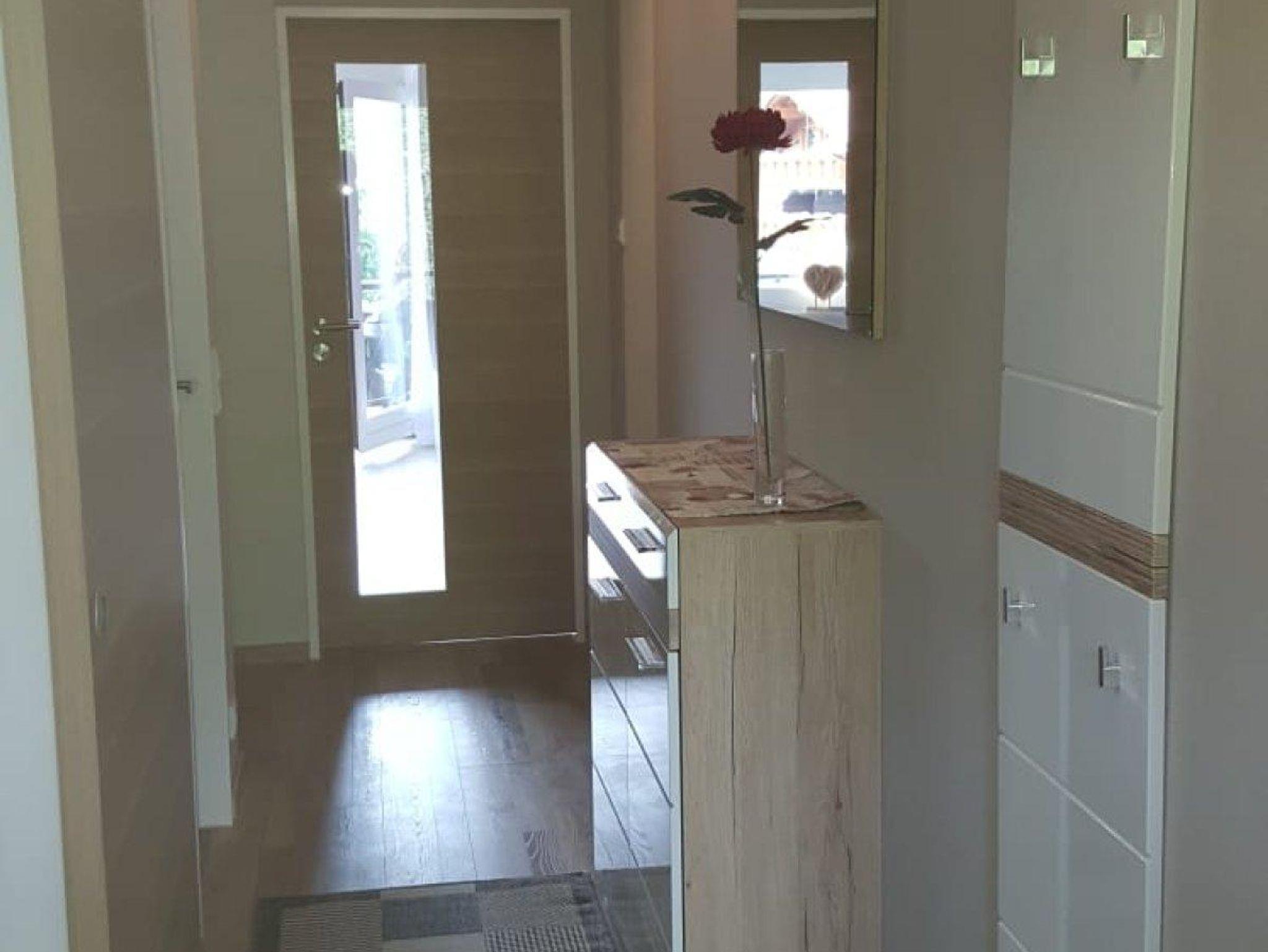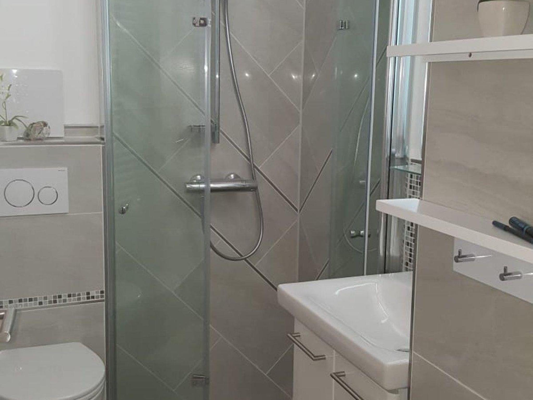 Das Bad glänzt im luxuriösen Design mit begehbarer Dusche, Fußbodenheizung, beheizbaren Spiegel, Fön und weiteren Accessoires.