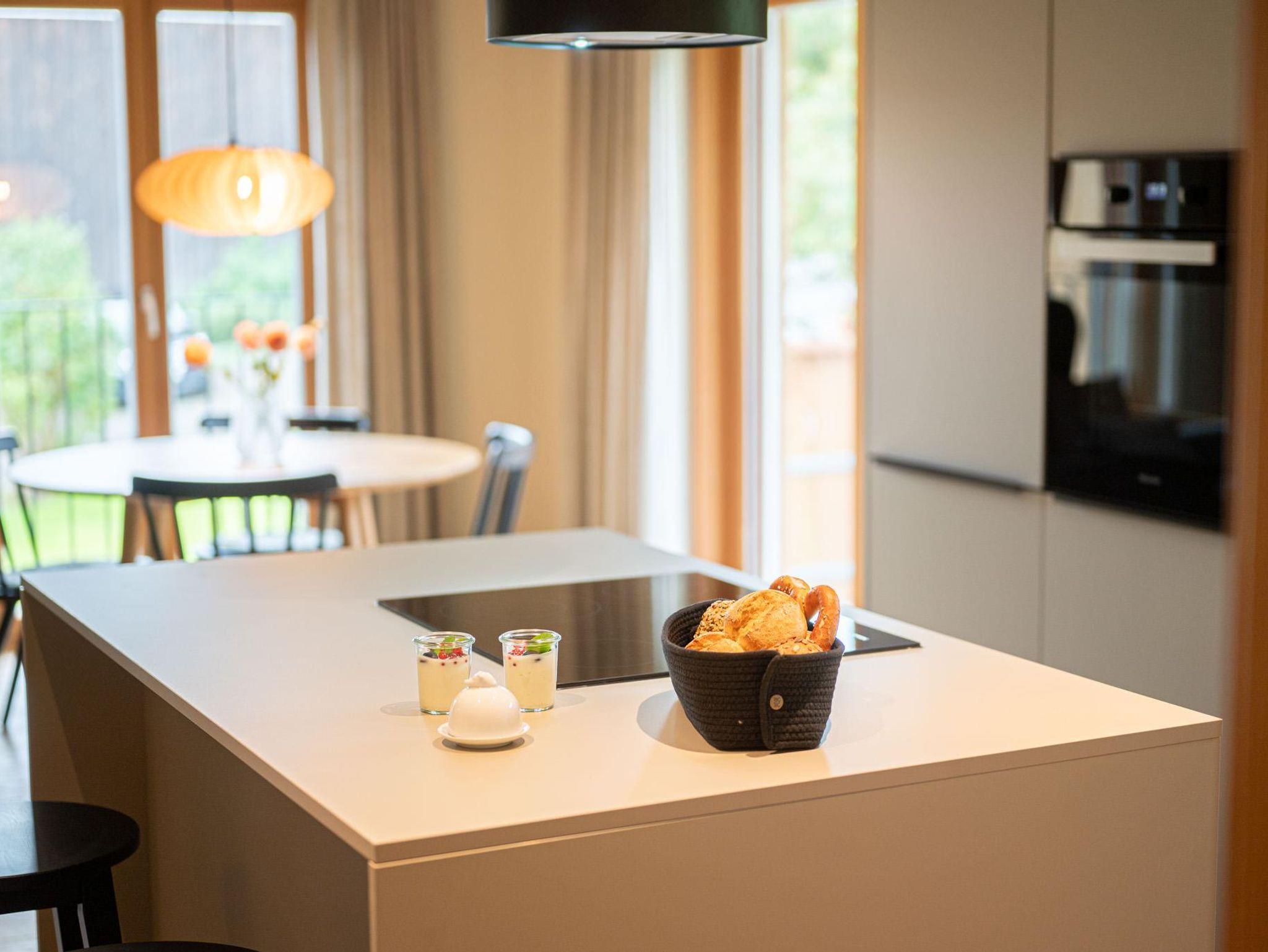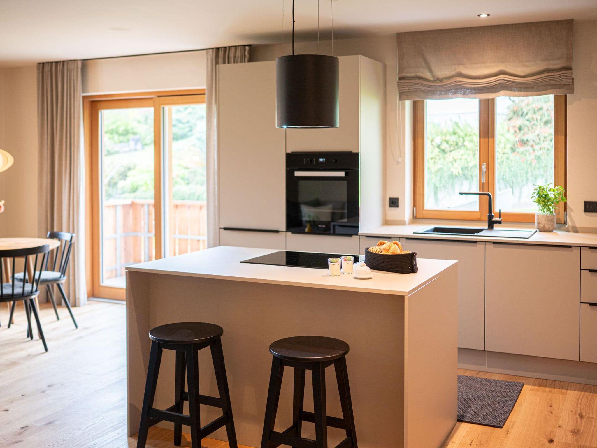 Kathi & Bruno Die geräumige Ferienwohnung verbindet bietet mit Balkon, Terrasse und französischen Balkonen viel Platz zum Entspannen - drinnen wie draußen. Die offene Wohnküche mit Küchenblock ist komplett ausgestattet mit Geschirrspüler, Kühlschrank, Herd und Backofen. Am Esstisch für vier lässt sich der Tag mit einer Tasse Kaffee beginnen. Der Wohnbereich mit großem Ecksofa und Sessel lädt zum Entspannen ein.
