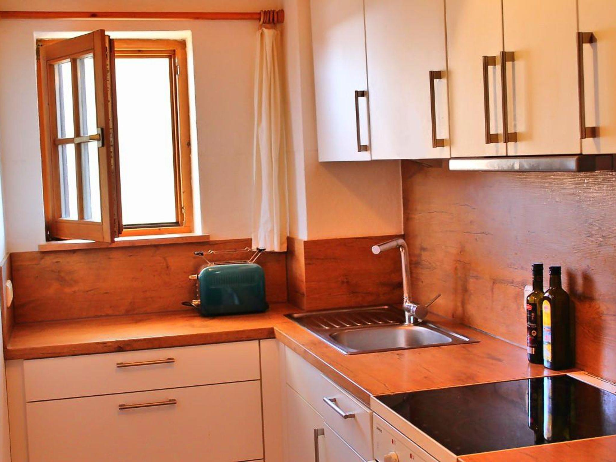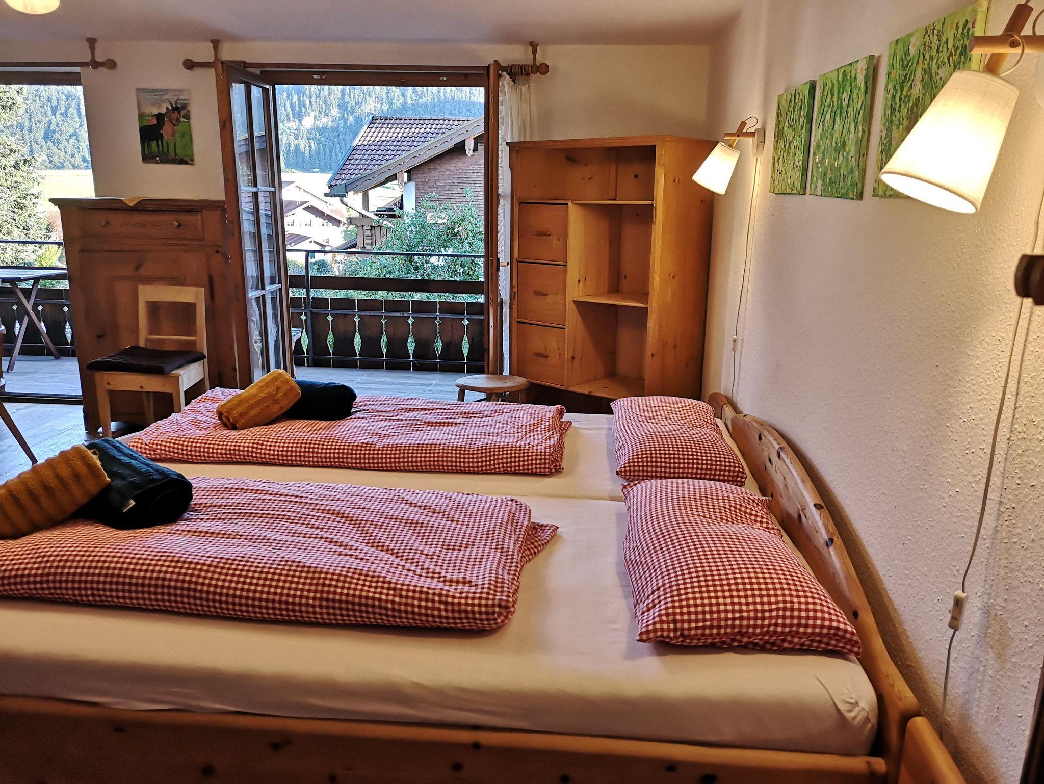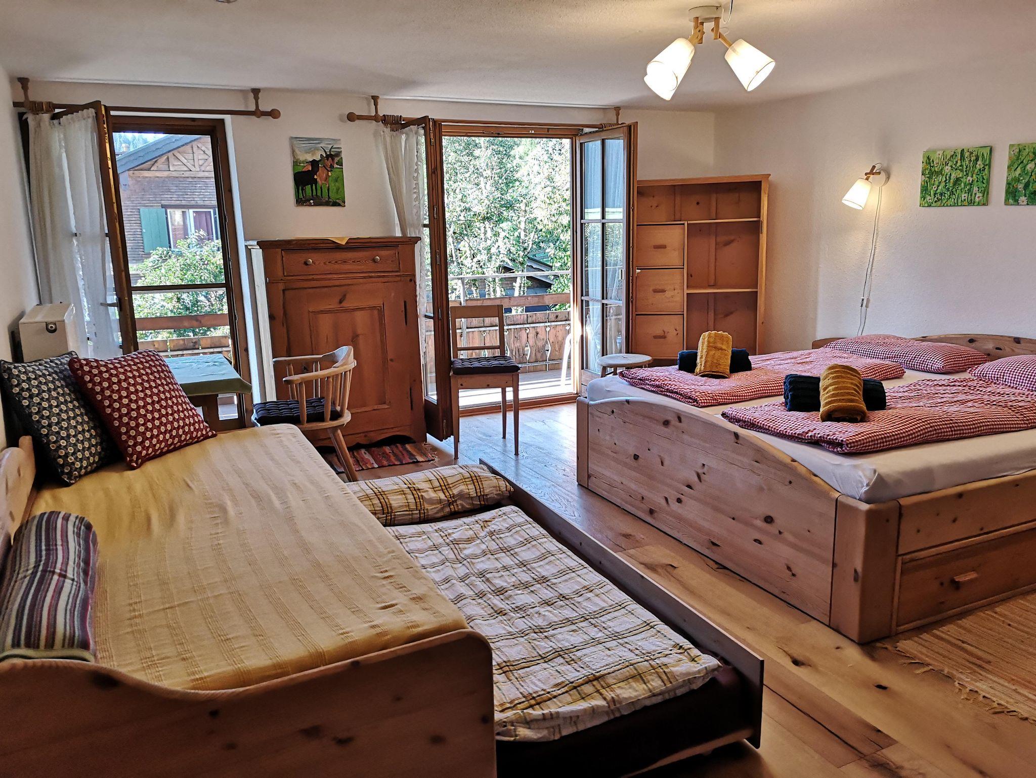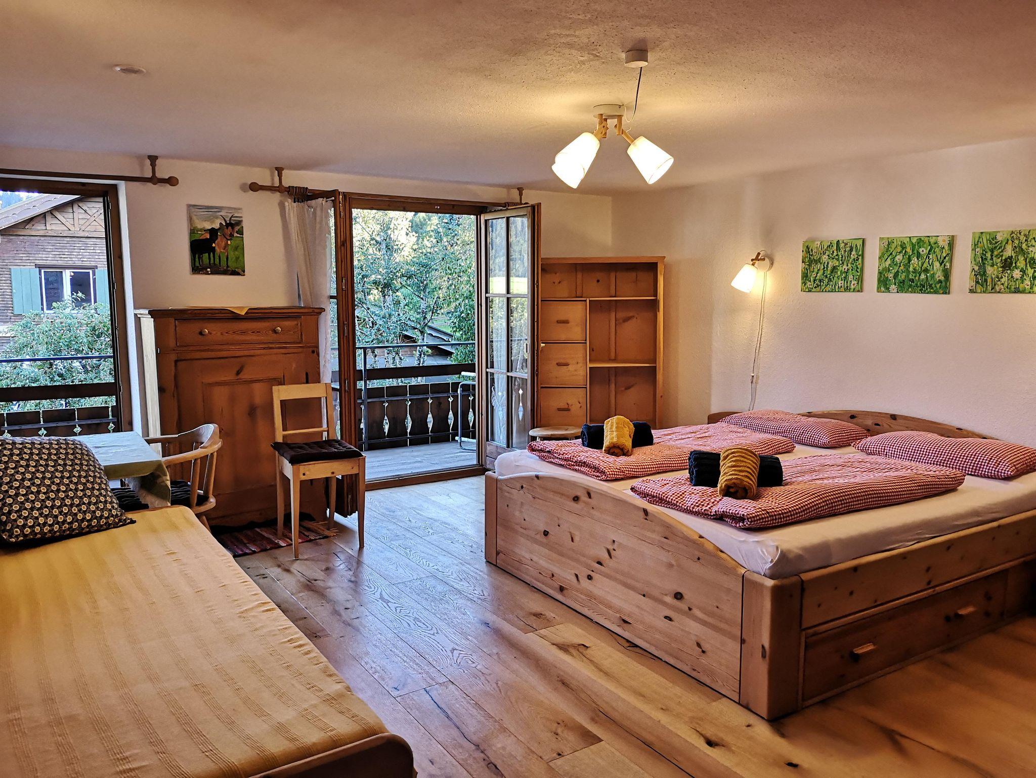 Urlaubswohnung mit zwei Sonnenbalkonen und traumhaftem Bergblick für bis zu 4 Personen in zwei großen Zimmern. Hohe komfortable Betten und stilvolle Einrichtung mit Bauernmöbeln.