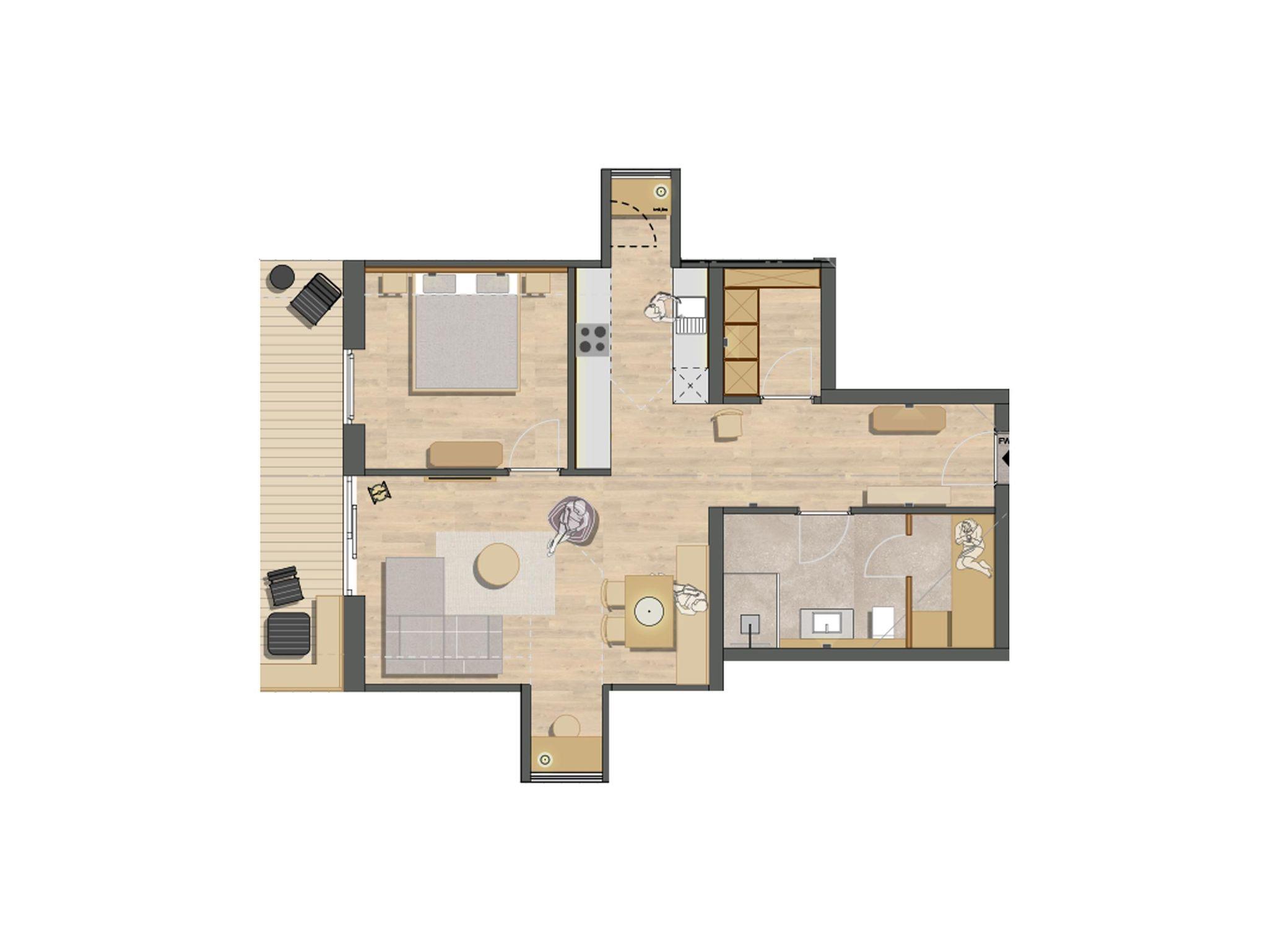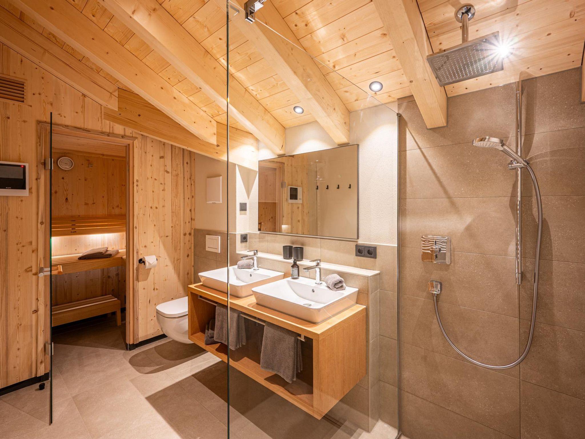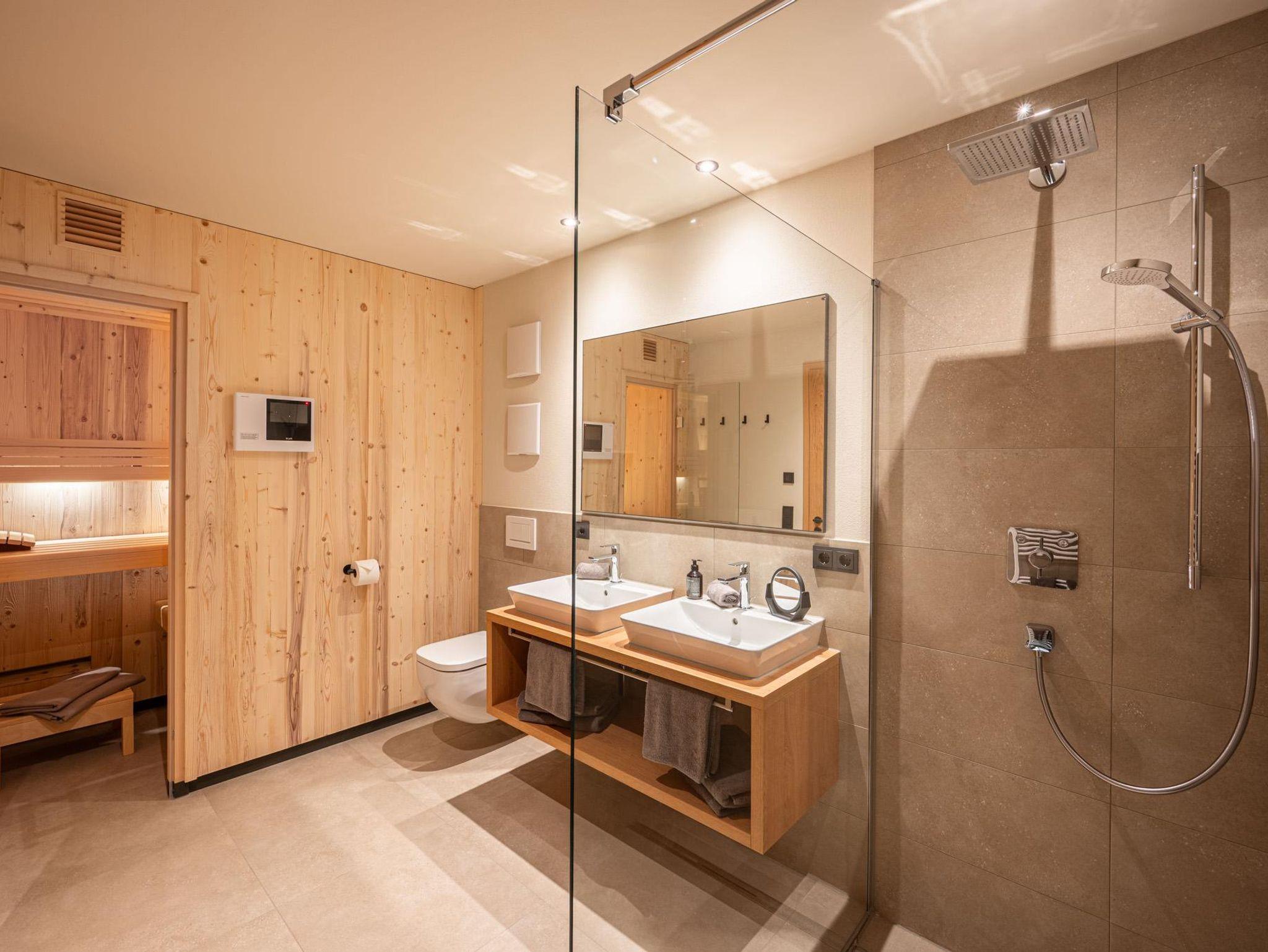 Das separate Schlafzimmer mit Doppelbett (1,80 m) sorgt für erholsamen Schlaf, während ein eigener Ankleideraum zusätzlichen Stauraum bietet. Das Badezimmer ist dein ganz persönlicher Wellnessbereich: private Sauna, Doppelwaschbecken und Dusche – für maximalen Komfort.
