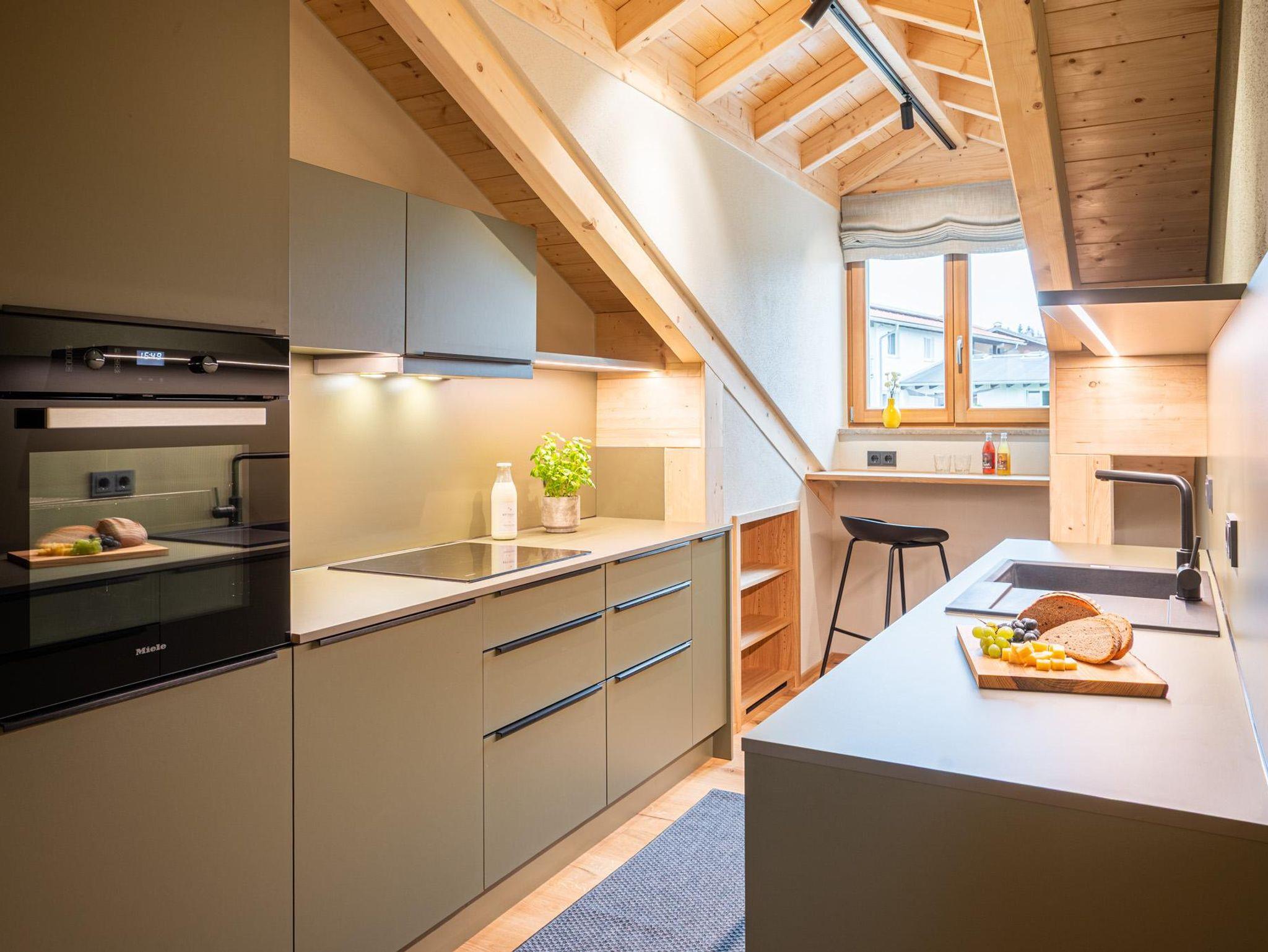 Die offene Wohnküche ist mit Spülmaschine, Kühlschrank, Herd und Backofen voll ausgestattet – ideal für unkomplizierte Mahlzeiten oder ausgedehnte Kochabende. Direkt angeschlossen ist der gemütliche Wohnbereich mit Sofa, Sessel und TV – genau richtig zum Zurücklehnen nach einem erlebnisreichen Tag.