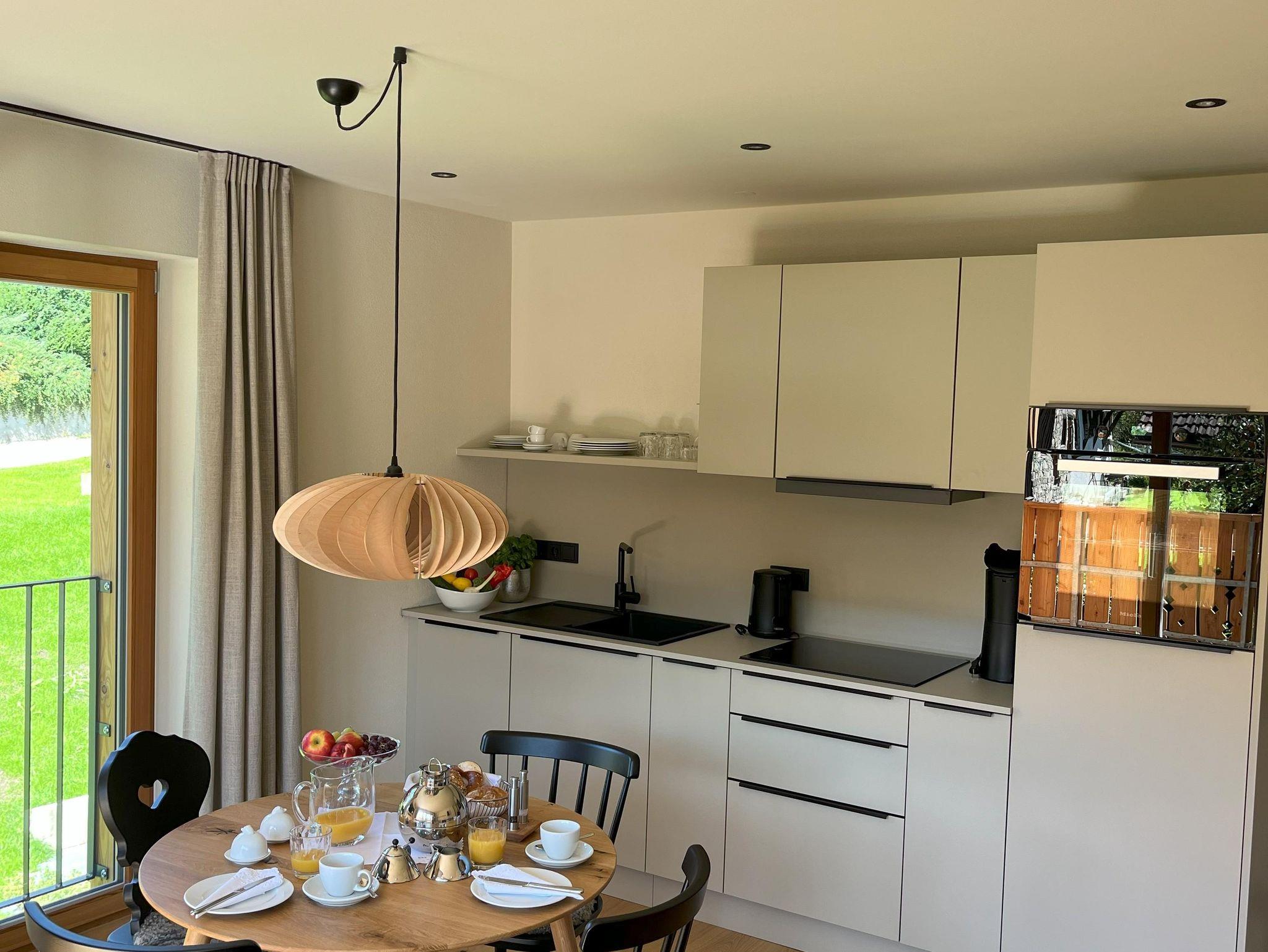 Die offene Wohnküche ist mit Spülmaschine, Kühlschrank, Herd und Backofen ausgestattet – alles da für ein entspanntes Frühstück oder ein selbstgekochtes Abendessen. Der Esstisch für zwei lädt zum Verweilen ein, während das Sofa im Wohnbereich der perfekte Ort zum Abschalten ist.