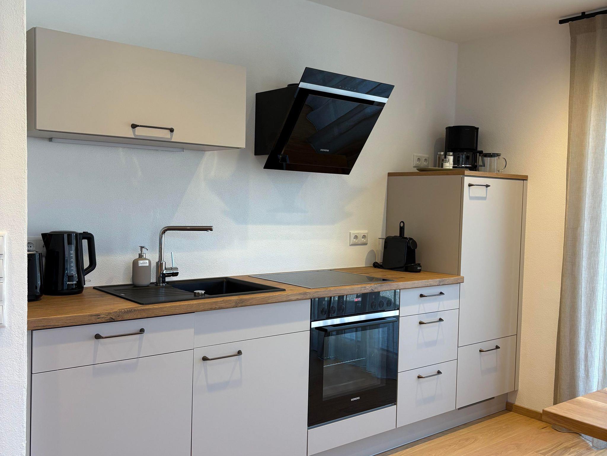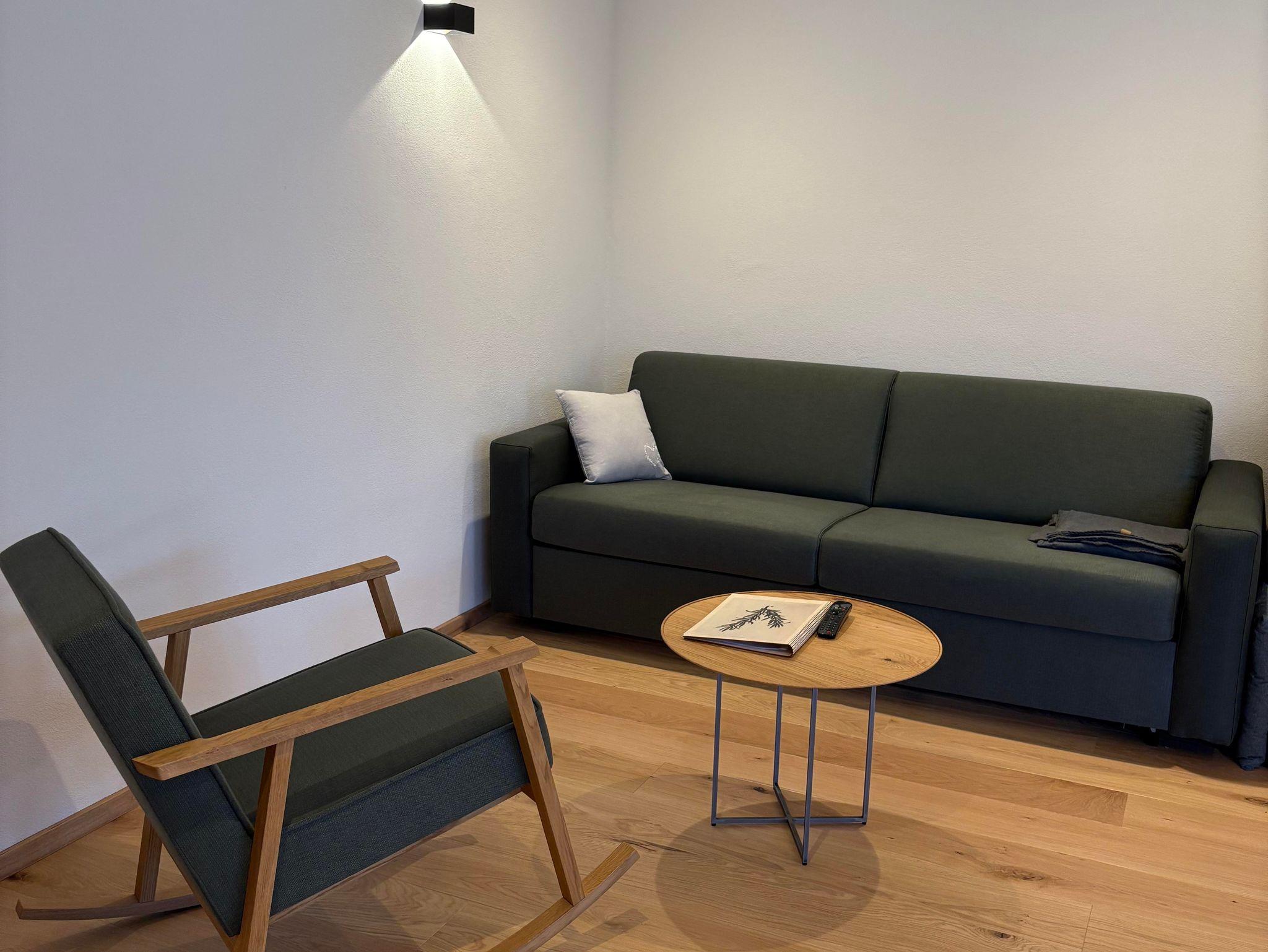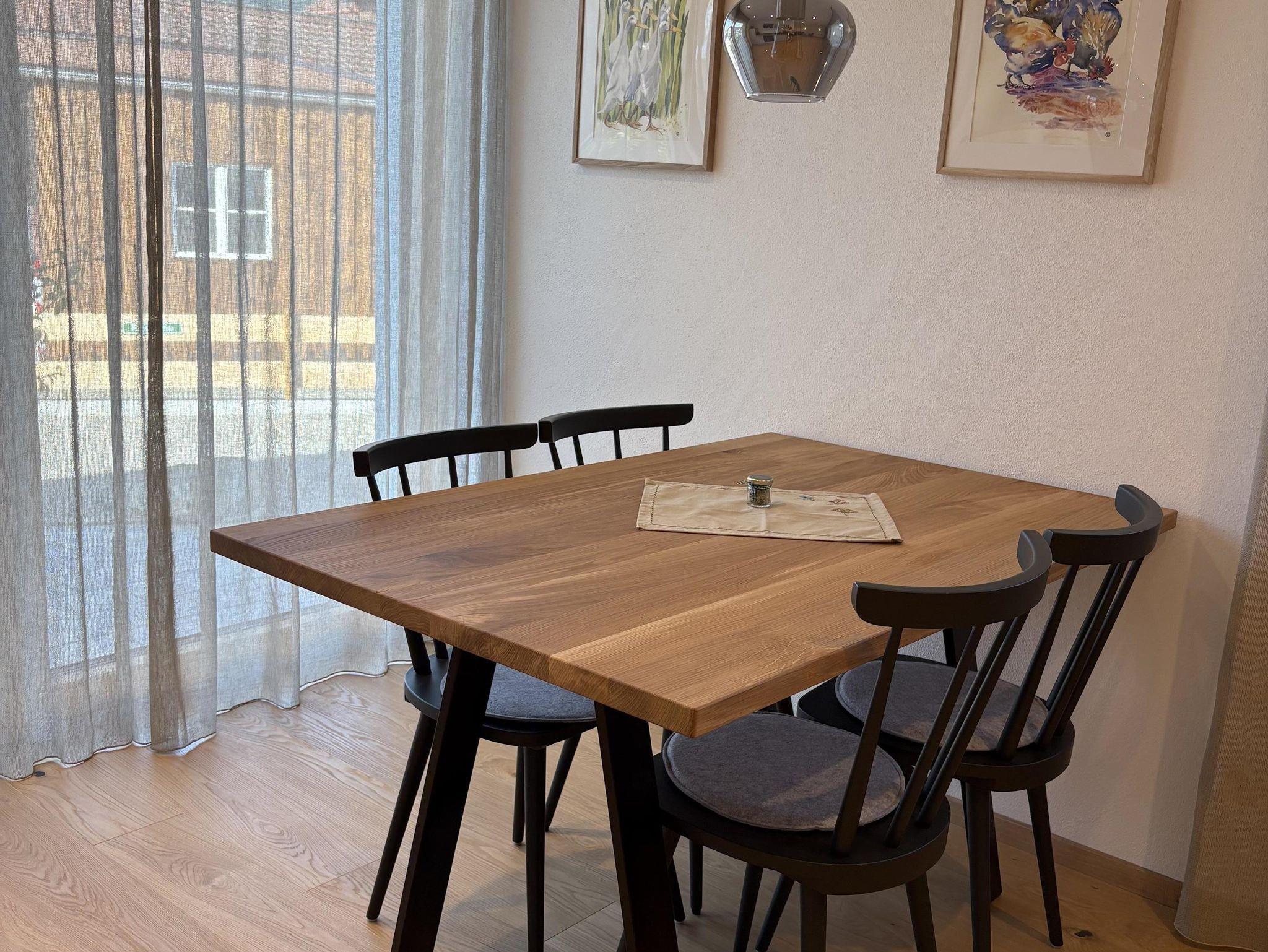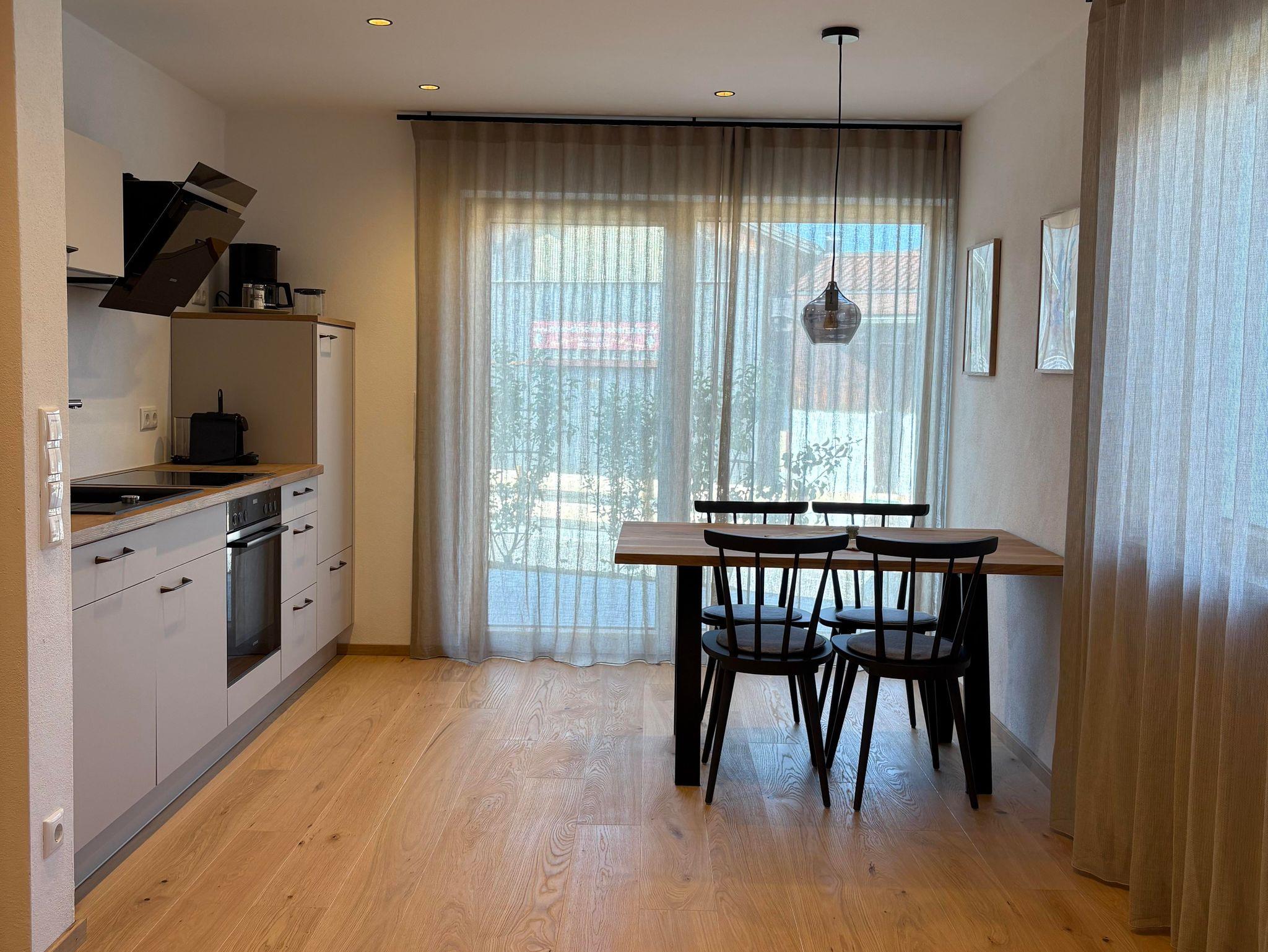 Die Ferienwohnung Rosmarin bietet auf 55 m² Platz für bis zu 4 Personen und befindet sich im Erdgeschoss. Sie verfügt über ein Schlafzimmer und ein Ausziehsofa, sowie ein modernes Badezimmer mit Walk-In Dusche. Der offene Wohn-/Essbereich umfasst eine gut ausgestattete Küche mit Kaffeemaschine, Geschirrspüler, Backofen und Wasserkocher. Zudem gibt es Fernsehr, kostenloses WLAN sowie einen Schreibtisch als Homeoffice-Möglichkeit. Eine Fußbodenheizung, ein Safe und ein Parkplatz am Haus sorgen für zusätzlichen Komfort. Ein Kinderbett ist ebenfalls auf Anfrage erhältlich. Die Ferienwohnung ist eine Nichtraucherwohnung und bietet mit ihrer Südterrasse einen seitlichen Bergblick.