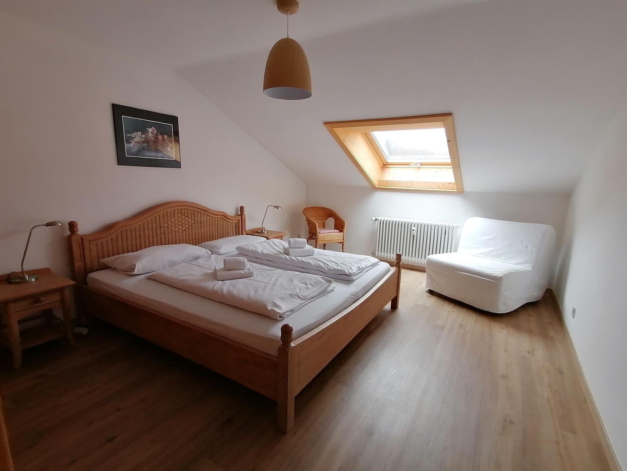Hübsche 2-Zimmer-Maisonette Wohnung. Wohnzimmer mit Sitzecke/Essecke und Südbalkon, separate Küche. Im Obergeschoß befindet sich 1 großes Schlafzimmer mit Doppelbett und Dachfenster, Dusche/WC.