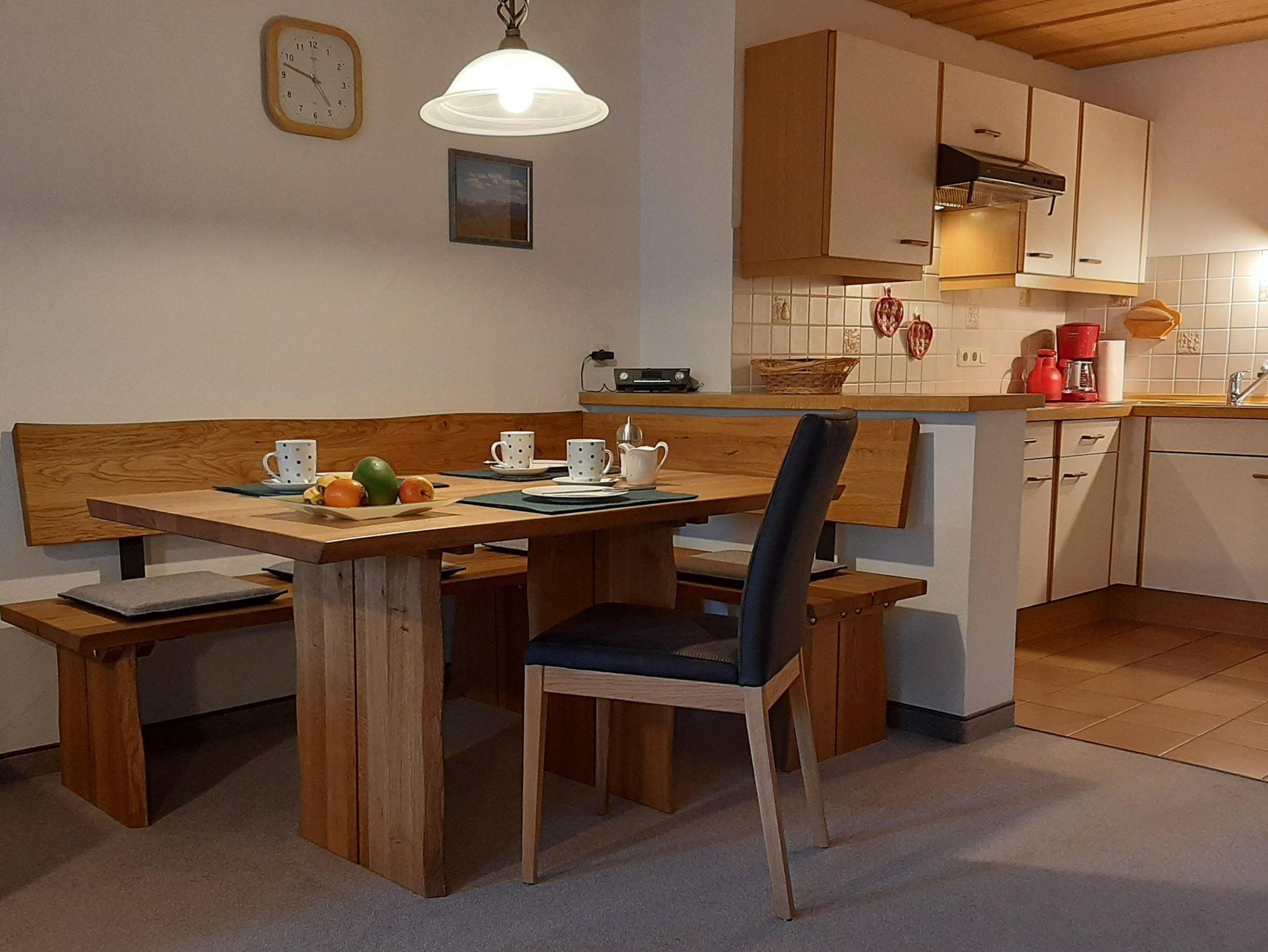 Die offene, voll ausgestattete Küche mit Cerankochfeld, Kühlschrank mit Gefrierfach, Mikrowelle, Spülmaschine, Kaffeemaschine, Wasserkocher, Toaster, Eierkoche, sowie das komplette Speise-und Kochservice schließt sich an die Essecke an.