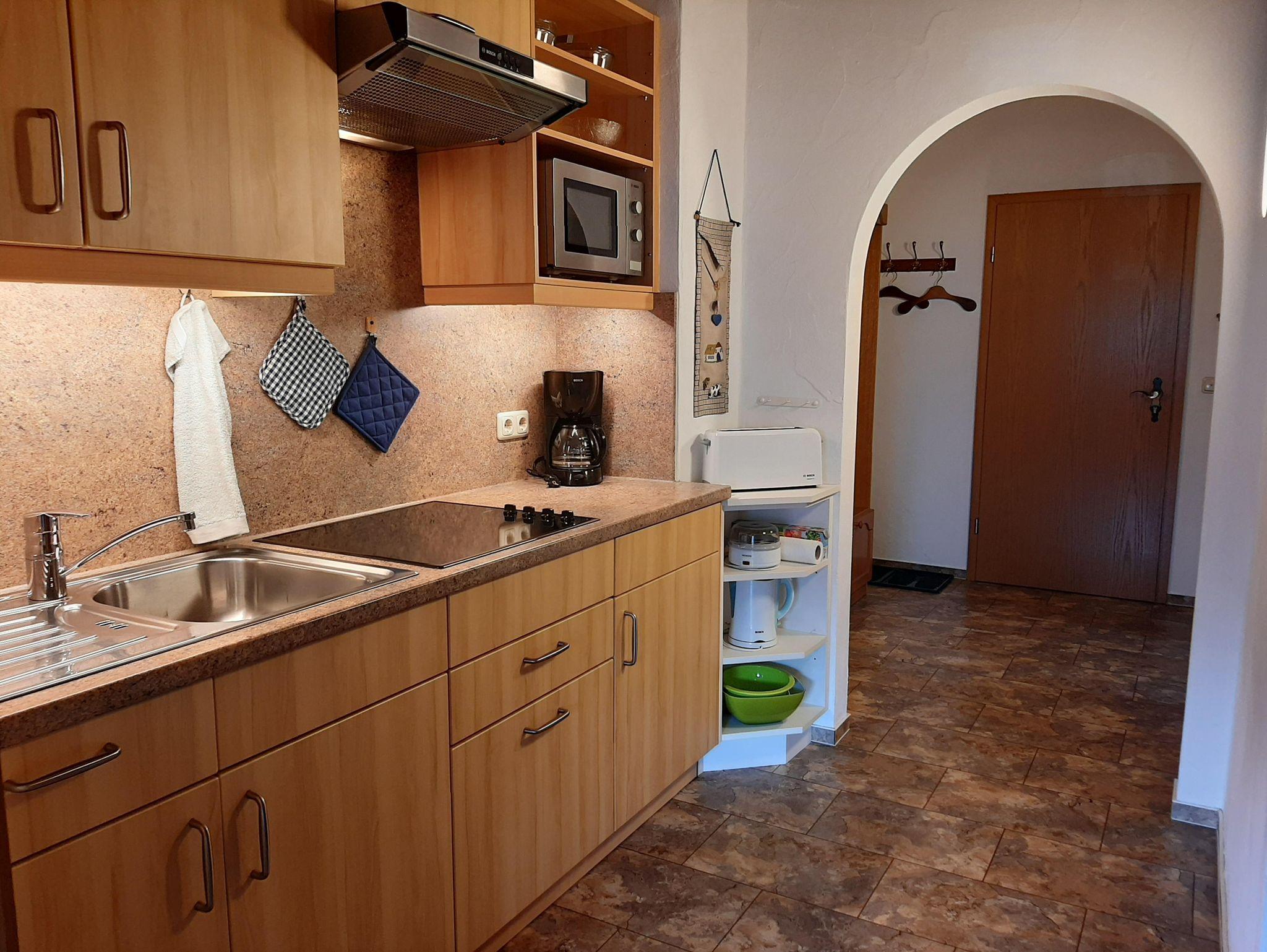 Im großzügigen Durchgang befindet sich die Küchenzeile mit Cerankochfeld, Mikrowelle, Kühlschrank mit Gefrierfach, Kaffeemaschine, Wasserkocher, Toaster, sowie komplettes Speise- und Kochgeschirr