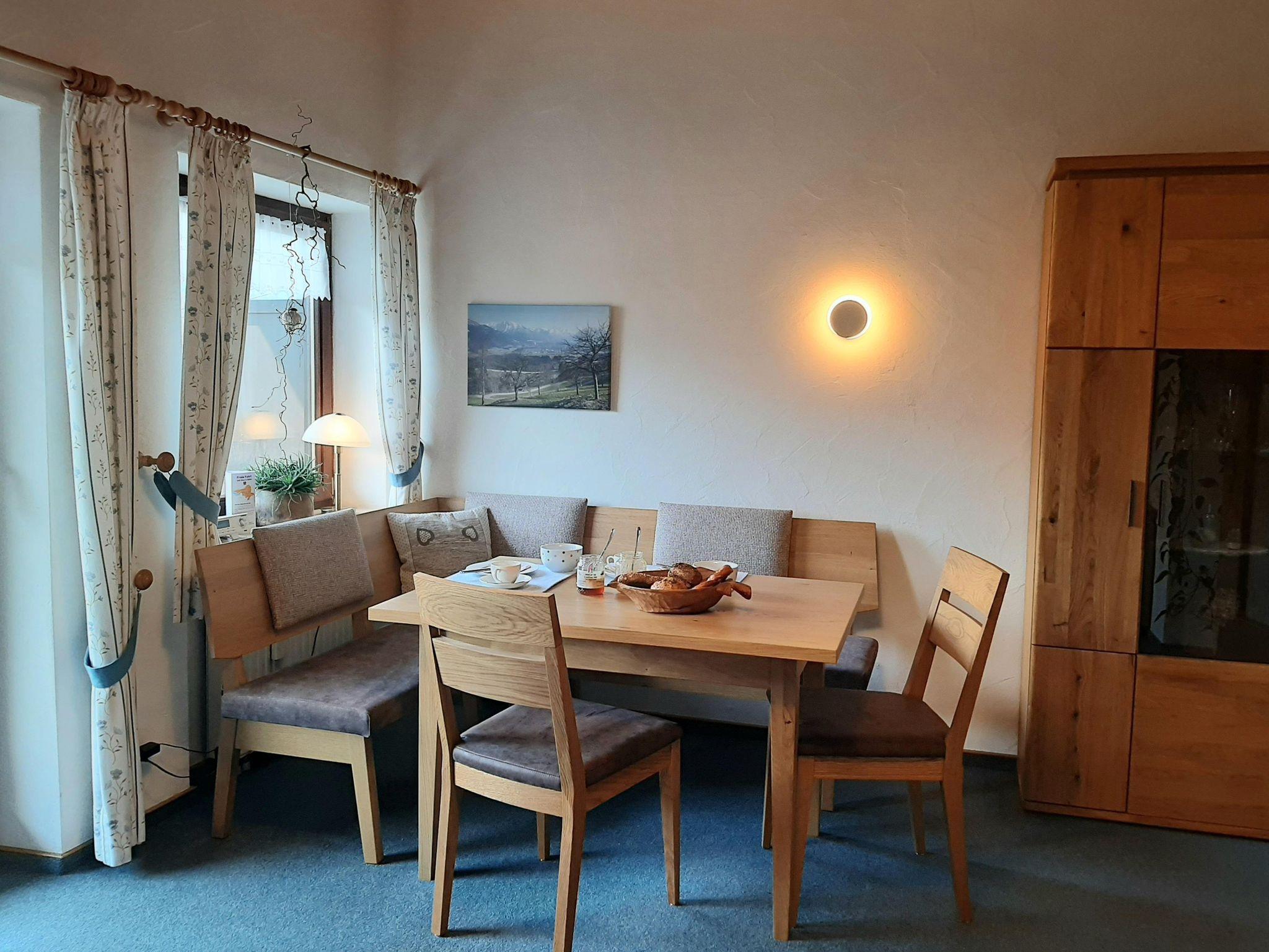 Wohn/Essraum mit gemütlicher Postergarnitur und Sat-TV, DAB, eine Eckbankgruppe mit Blick in die herrliche Bergwelt erwartet Sie