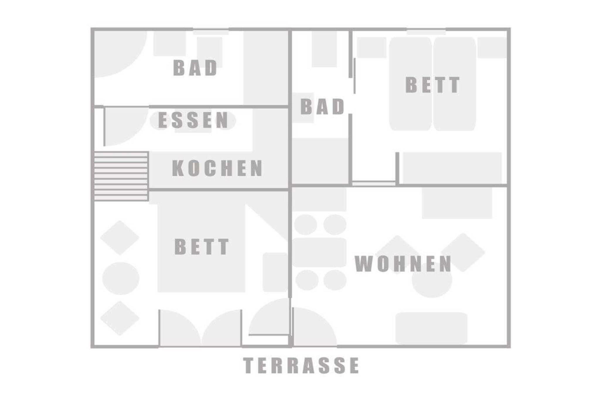 Stueetage: (Køkken(Fjernsyn, stereoanlæg, kogeplade, elkedel, komfur, kaffemaskine, ovn, opvaskemaskine , køleskab), Stue/soveværelse(Fjernsyn, spisebord, stereoanlæg), soveværelse(dobbeltseng, Fjernsyn, radio), badeværelse(bruser, håndvask, toilet, Håndklæder inkl.), badeværelse(badekar, bruser, håndvask, toilet, føntørrer, Håndklæder inkl.), pulterkammer(strygebræt, strygejern, tørreskab)) terrasse, have, havemøbler, parkering, Parasol, strygebræt, strygejern