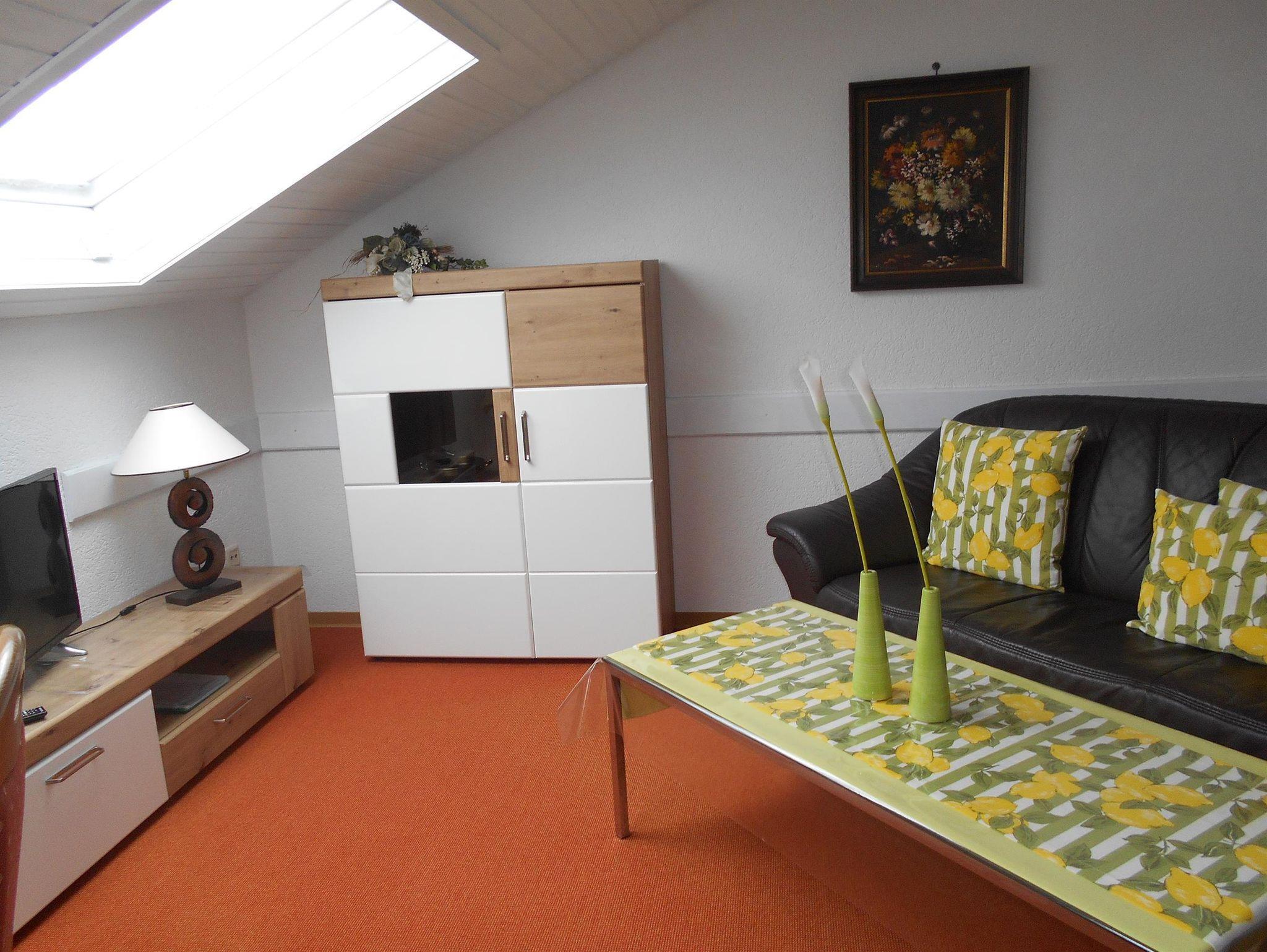Unsere großzügige Ferienwohnung „Fantasie“ befindet sich im Dachgeschoss. Sie verfügt über ein Schlafzimmer, ein Wohnzimmer, Bad mit Dusche sowie eine Küchenzeile. Das Wohnzimmer ist mit einem gemütlichen Sofa und TV/Radio ausgestattet. WLAN steht Ihnen kostenfrei zur Verfügung.