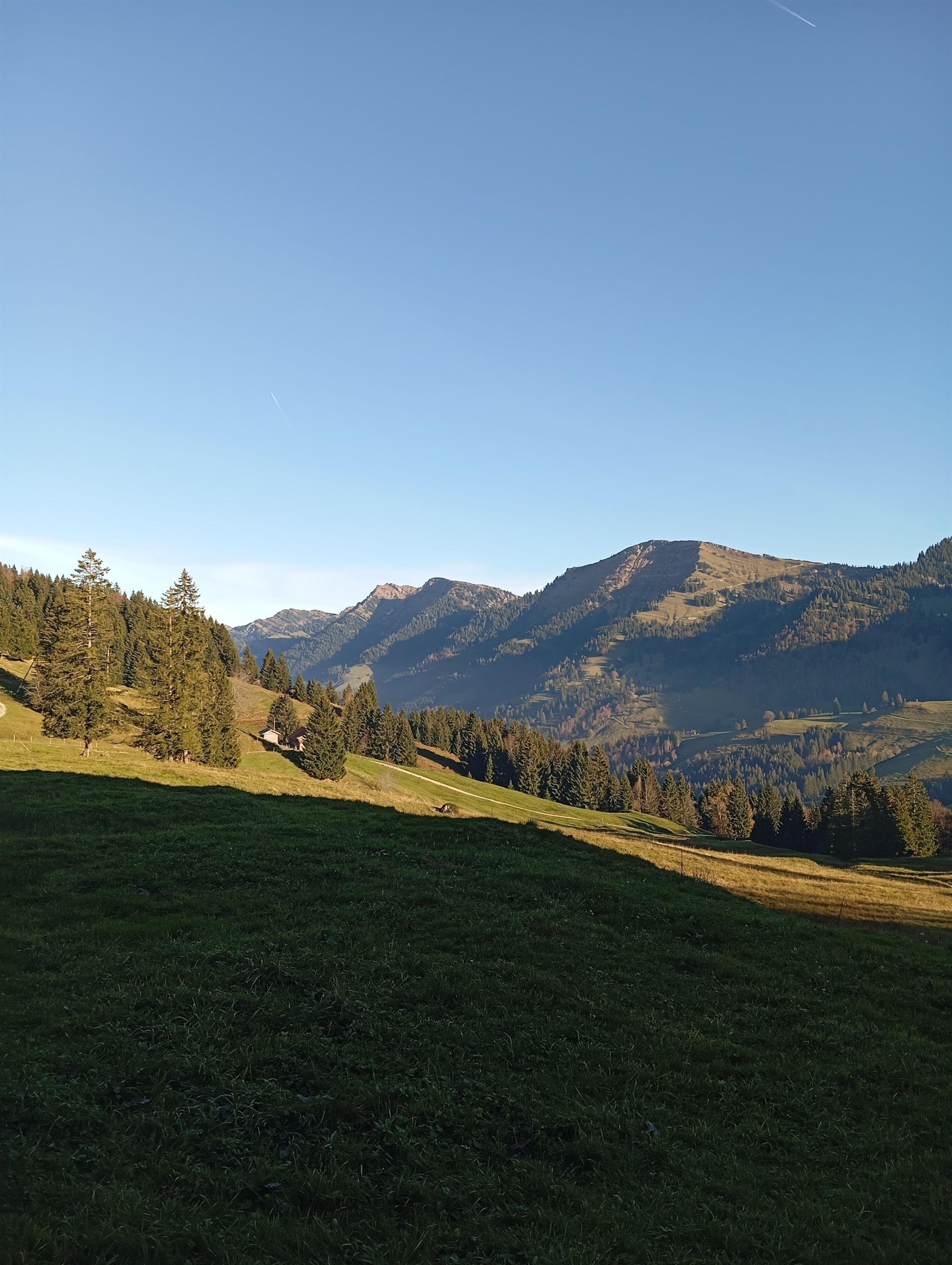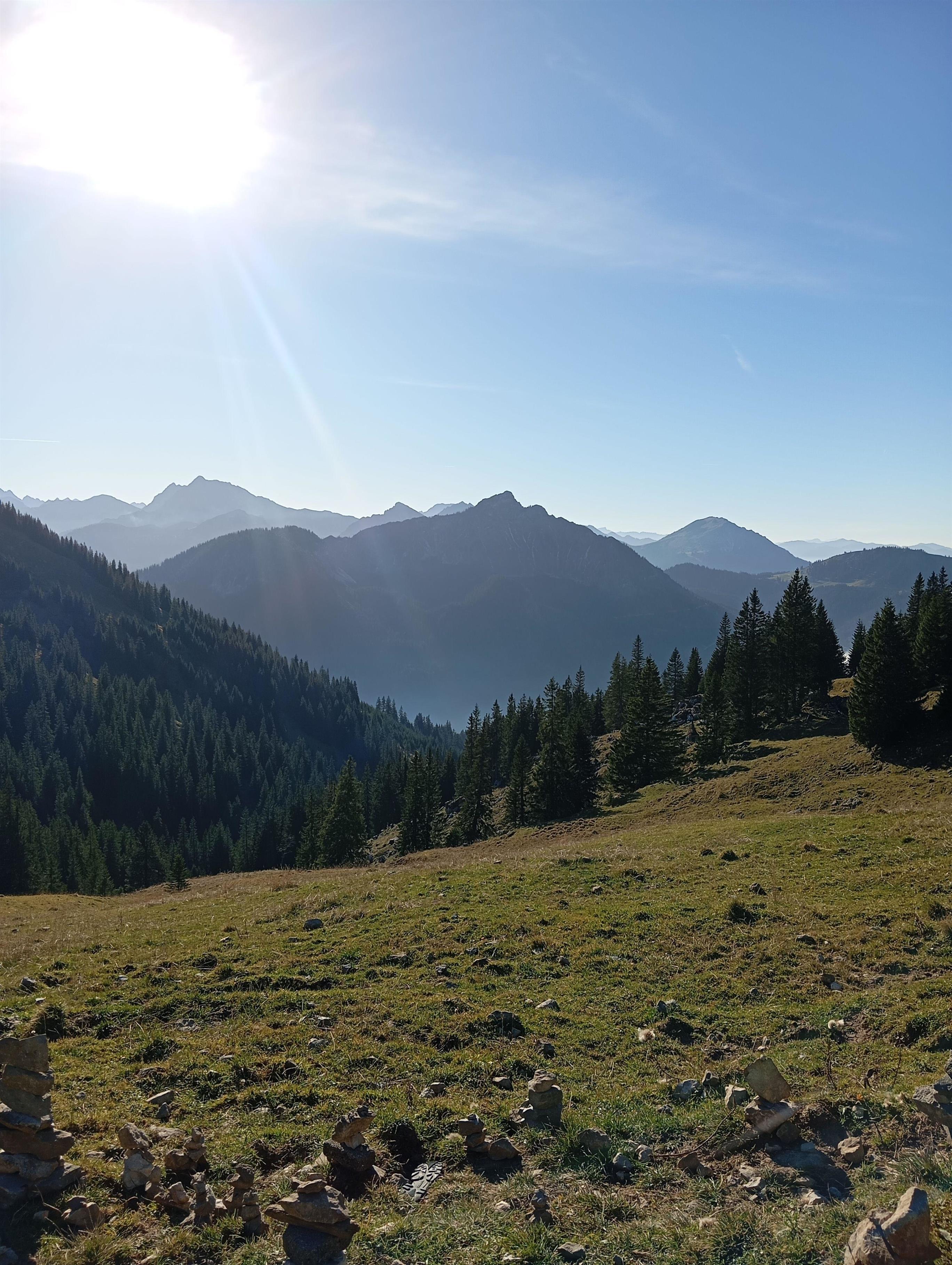 Nach Nordosten ausgerichtet befindet sich die überdachte ebenerdige Terrasse mit einem herrlichen unverbautem Ausblick ins Tal und die gegenüberliegenden Berge und Hügel.