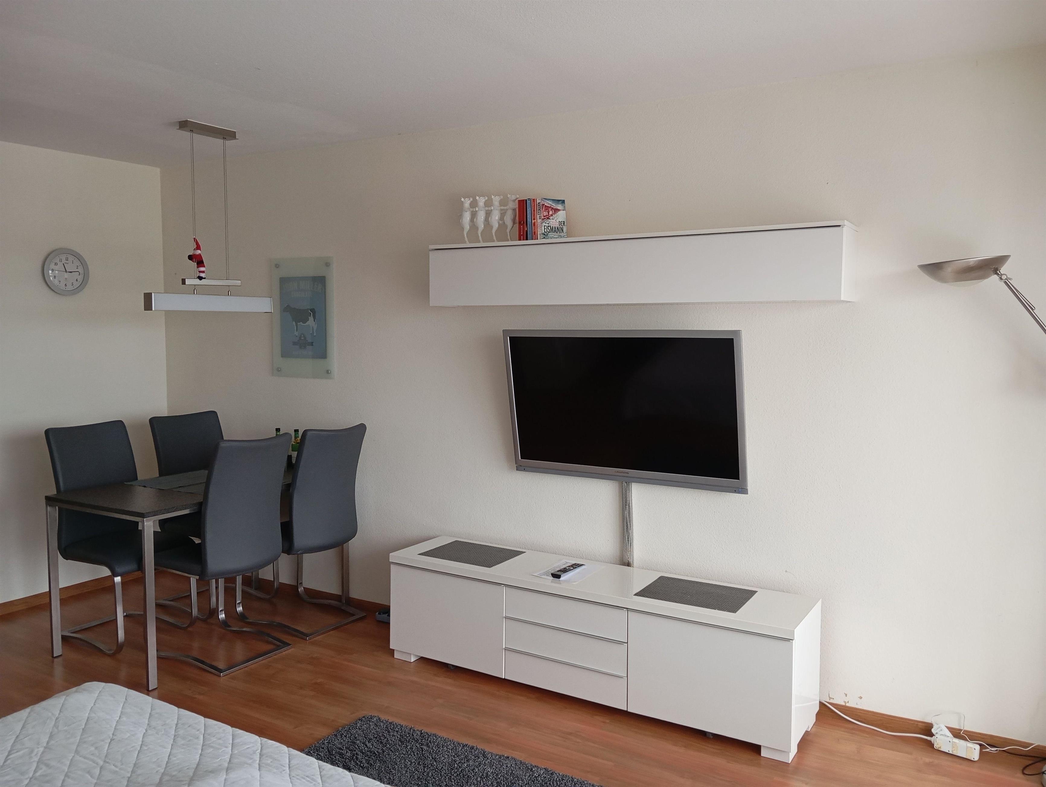 Wohn/Schlafraum: Esstisch mit 4 Stühlen, Doppelbett (2,0 x 1,8 m), 2 bequeme Sessel, großer Flachbildfernseher mit SAT – Programmen (Astra)