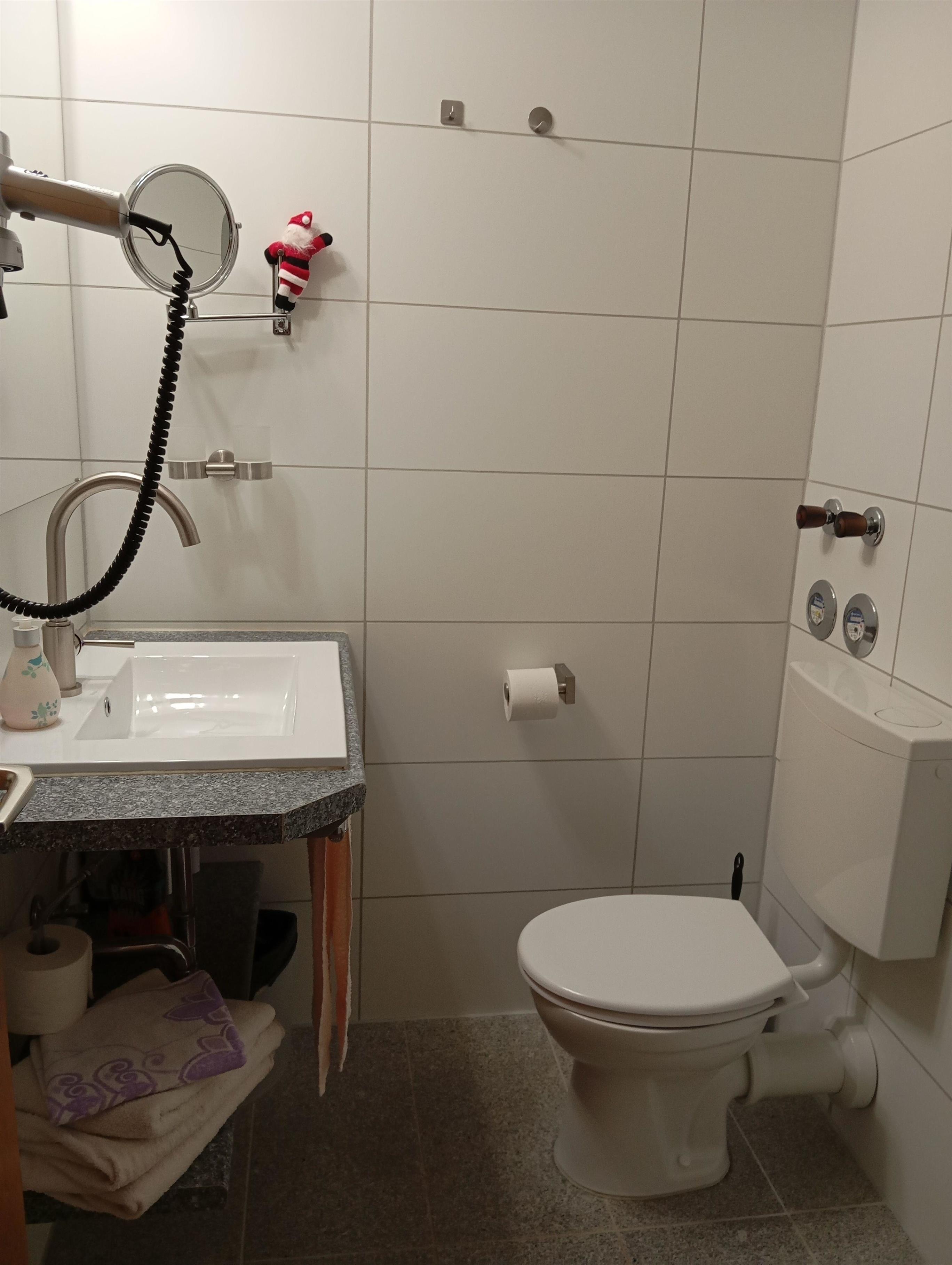 Bad: Halbrunddusche mit Schiebetüren, Toilette, Waschbecken mit großem Spiegel, Kosmetikspiegel und Haartrockner.