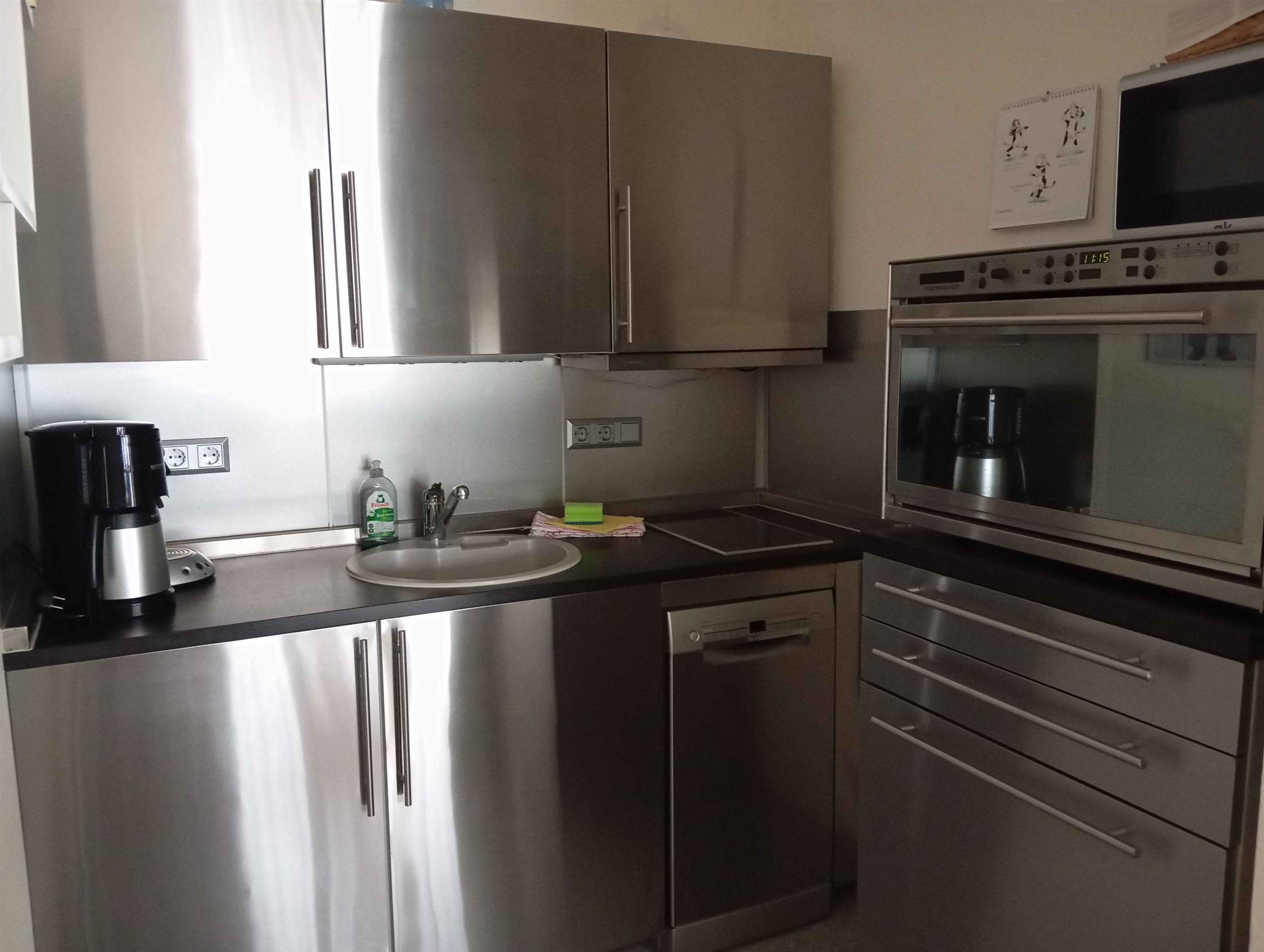 Filterkaffeemaschine, Senseo Kaffeepad-Maschine, Toaster, Wasserkocher, Moulinette, Spüle, Spülmaschine, Mikrowelle sowie eine reichhaltige Geschirrausstattung.