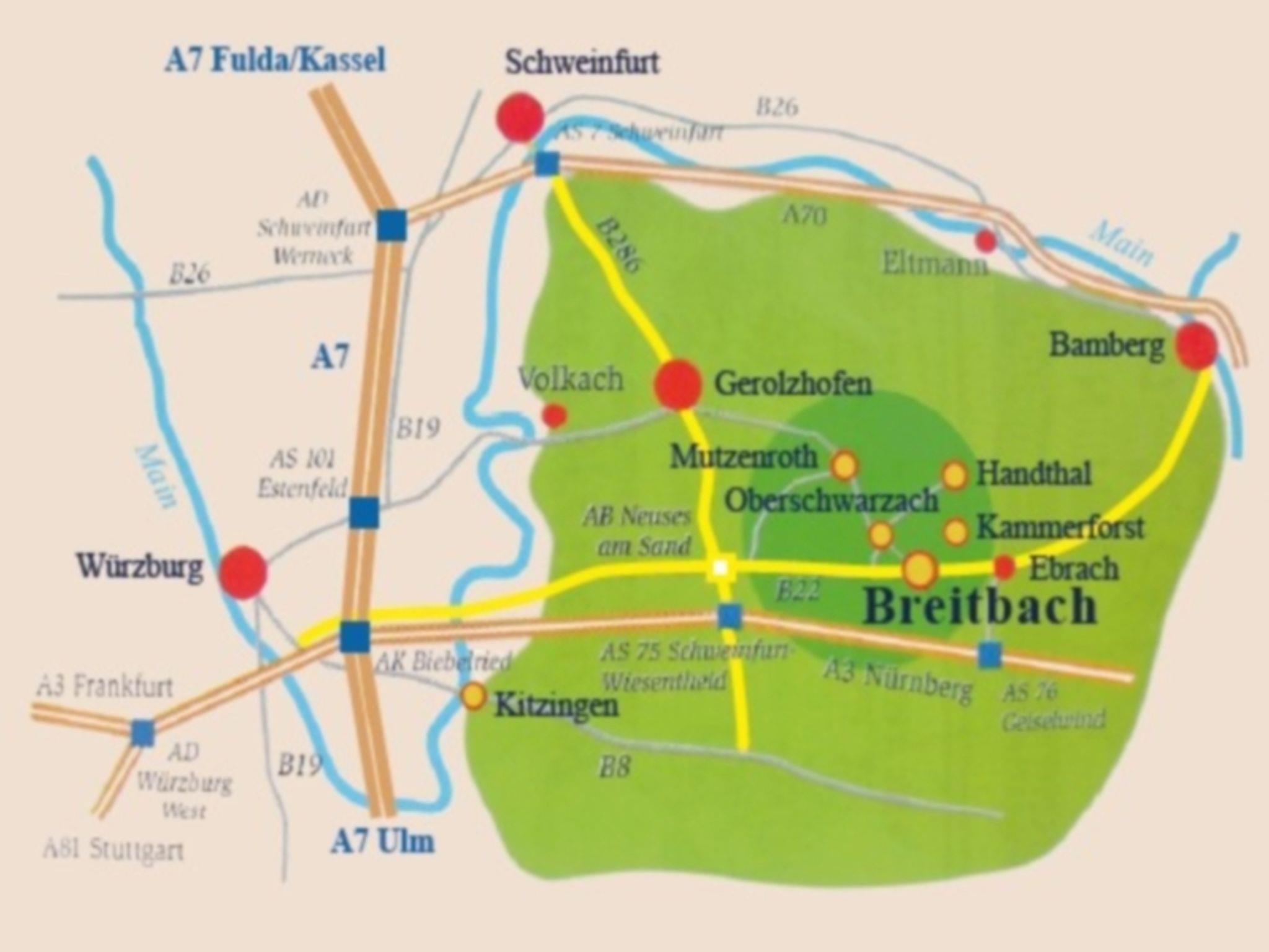 Breitbach an der Straße der Residenzen (B22), liegt genau in der Mitte zwischen Bamberg und Würzburg, im Naturpark Steigerwald. Unsere neue Pension, vom Hotel- und Gaststättenverband mit 3 Sternen bewertet, verfügt über Einzel-, Doppel- und Dreibettzimmer, sowie preisgünstige Familienzimmer (insges. 34 Betten). Neben der Pension befindet sich unser Gasthaus. Viele Freizeitmöglichkeiten, großes Wanderwege- und Radwegenetz ab Pension. Radler und Biker willkommen. Steigerwald-Panoramaweg, 2FrankenRadweg und Baumwipfel Lehrpfad in nächster Nachbarschaft ( 2 km).
