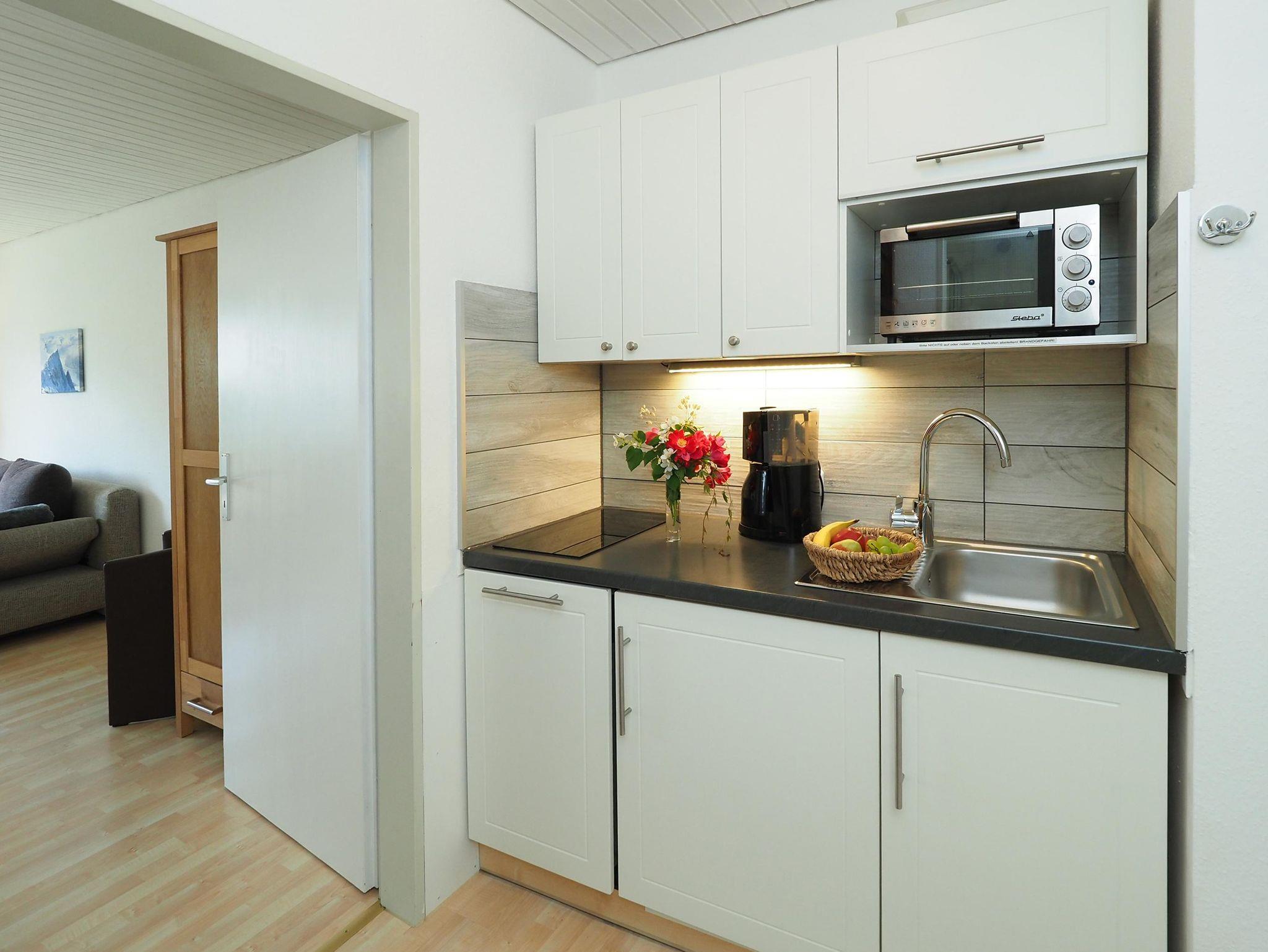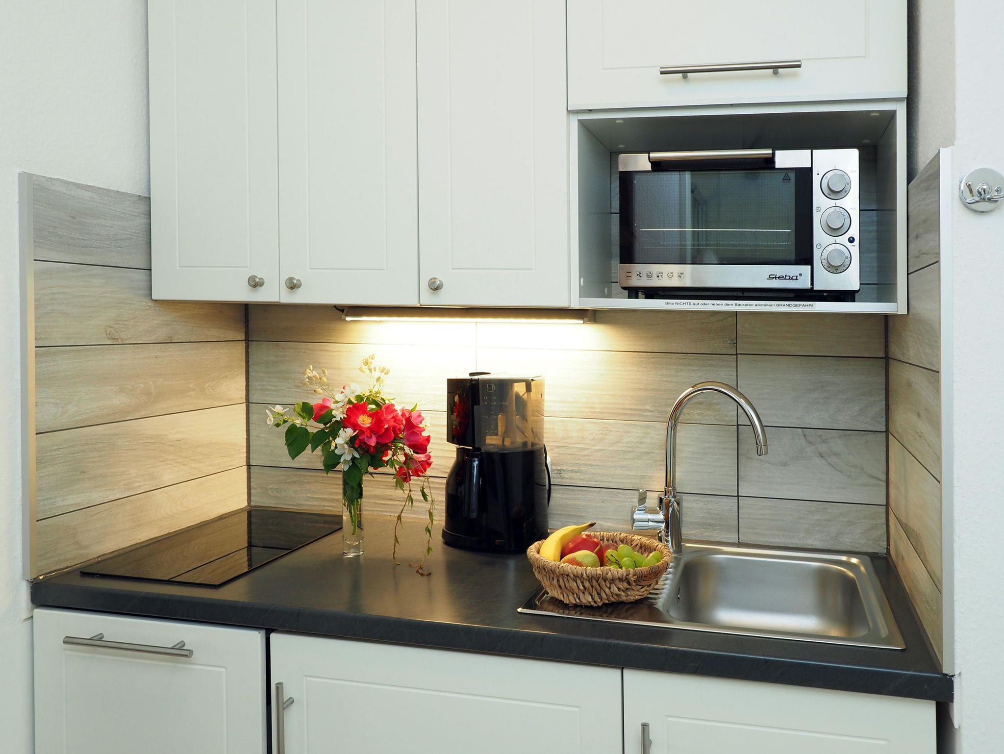 Es erwartet Sie zudem eine gut ausgestattete Küche mit Spülmaschine, Kaffeemaschine und kleinem Backofen.