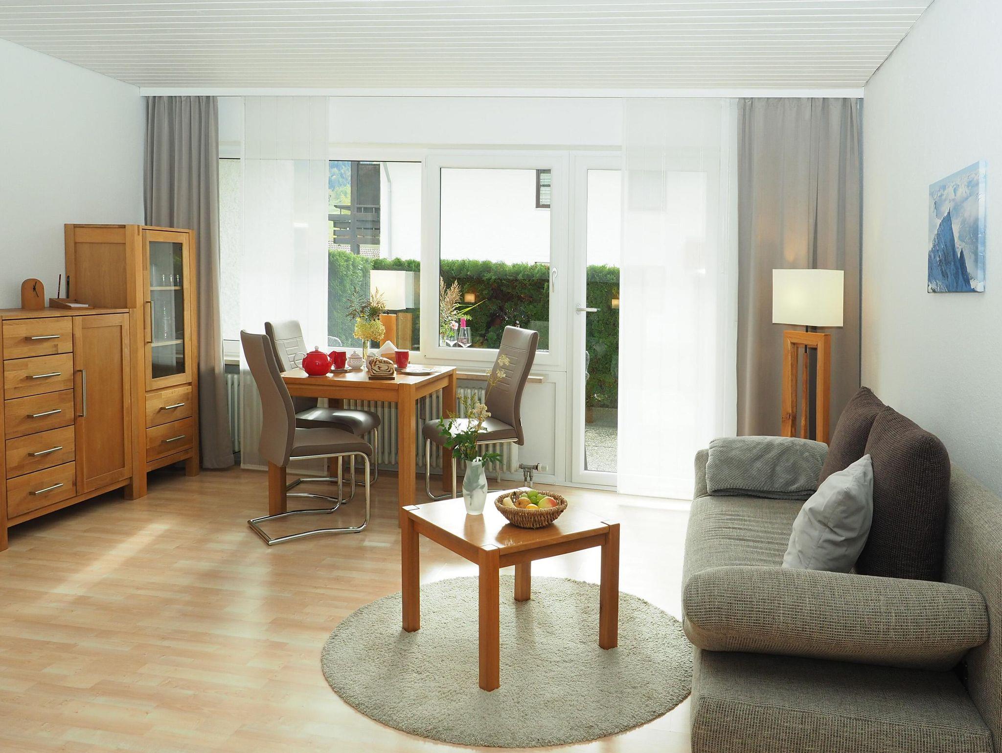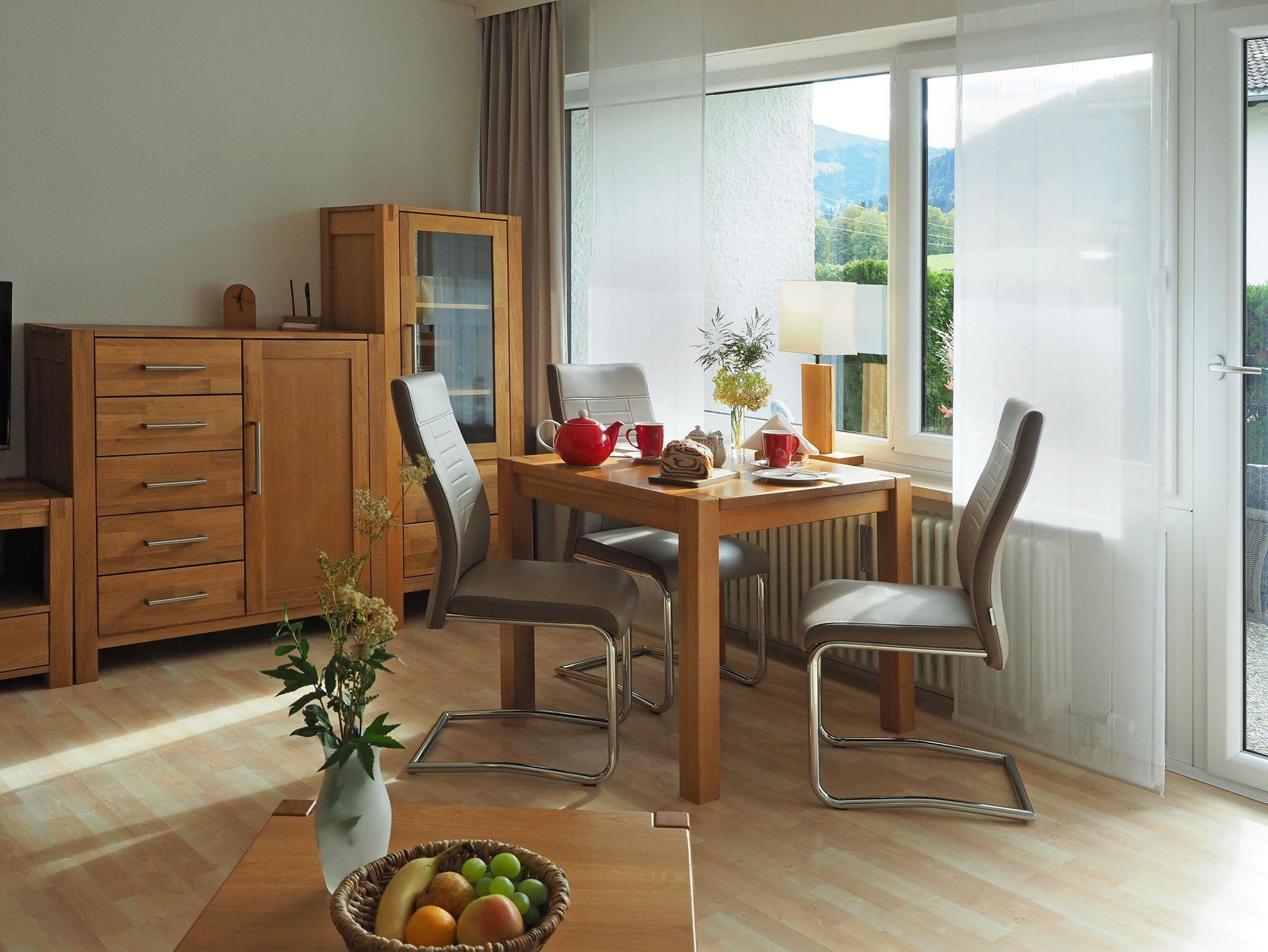 Freuen Sie sich auf einen Essplatz am Fenster mit Blick auf die Allgäuer Berge. Genießen Sie die Aussicht auf den Hochgrat vom Sofa oder von der Terrasse aus.