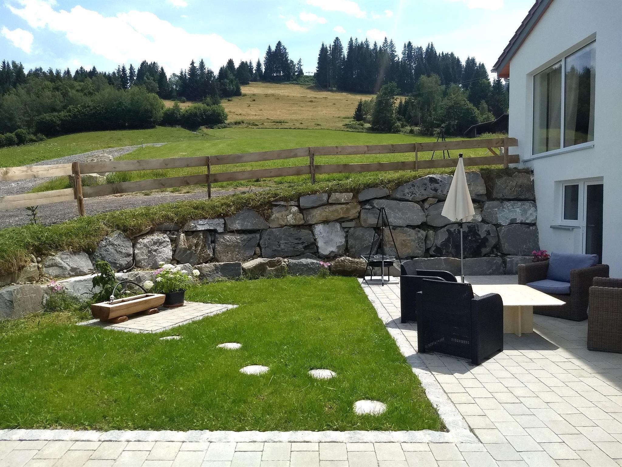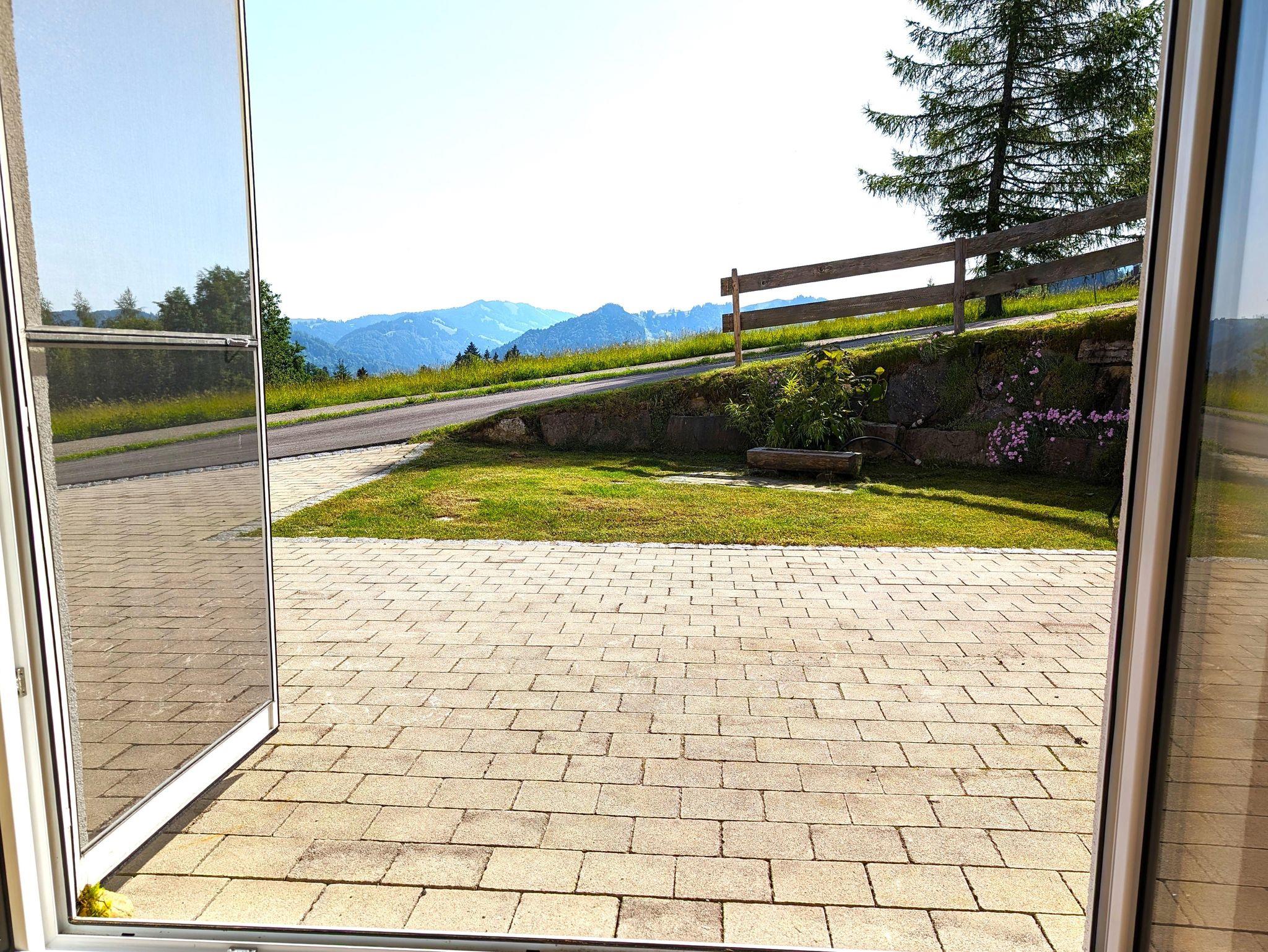 Die EG Wohnung (ca. 60 qm) hat einen separatem Eingang und eine Terrasse mit herrlichem Blick ins Tal auf die Nagelfluhkette und Oberstaufen. Die Wohnung bietet Platz für bis zu 4 Personen - ein Doppelbett 180cm, ein Bett 140 cm und eine Couch und ist offen (loftmäßig) gestaltet - lediglich das Bad ist abgetrennt.