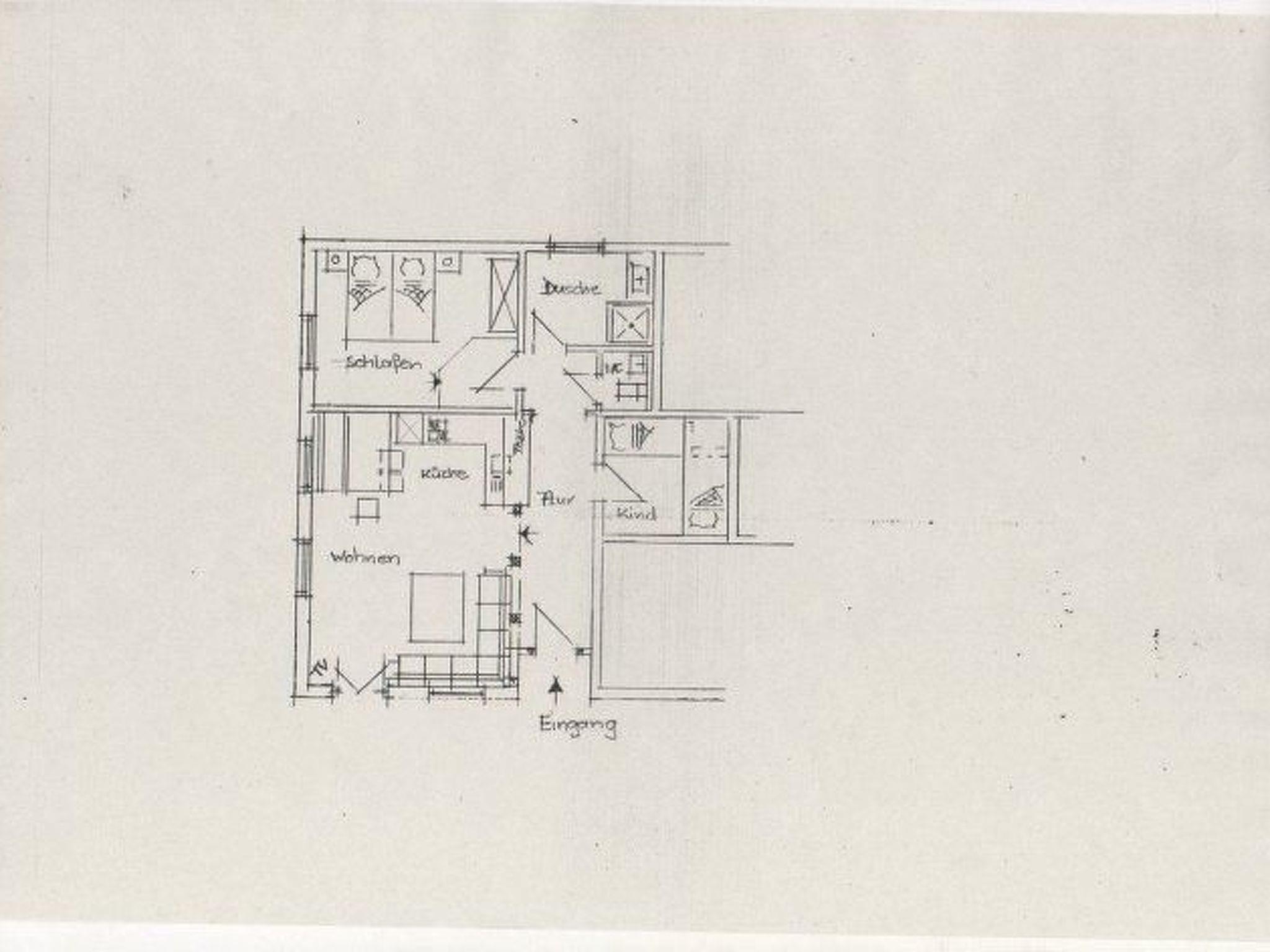 The apartment for up to four people provides around 66m² of living space. It has a bedroom with a double bed (two mattresses) and a children’s bedroom with a bunk bed (also suitable for adults). The living room and kitchen-diner are fully-equipped and furnished. There is a bathroom with a shower and WC. The entrance hallway is open. The apartment is at ground level with a view towards the edge of the forest and the meadow (see layout sketch).