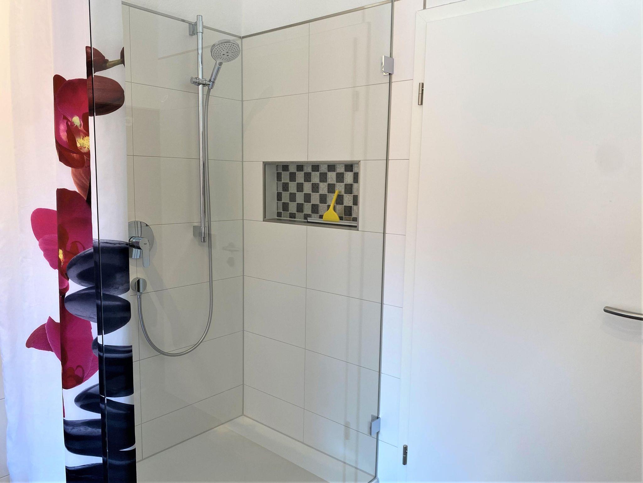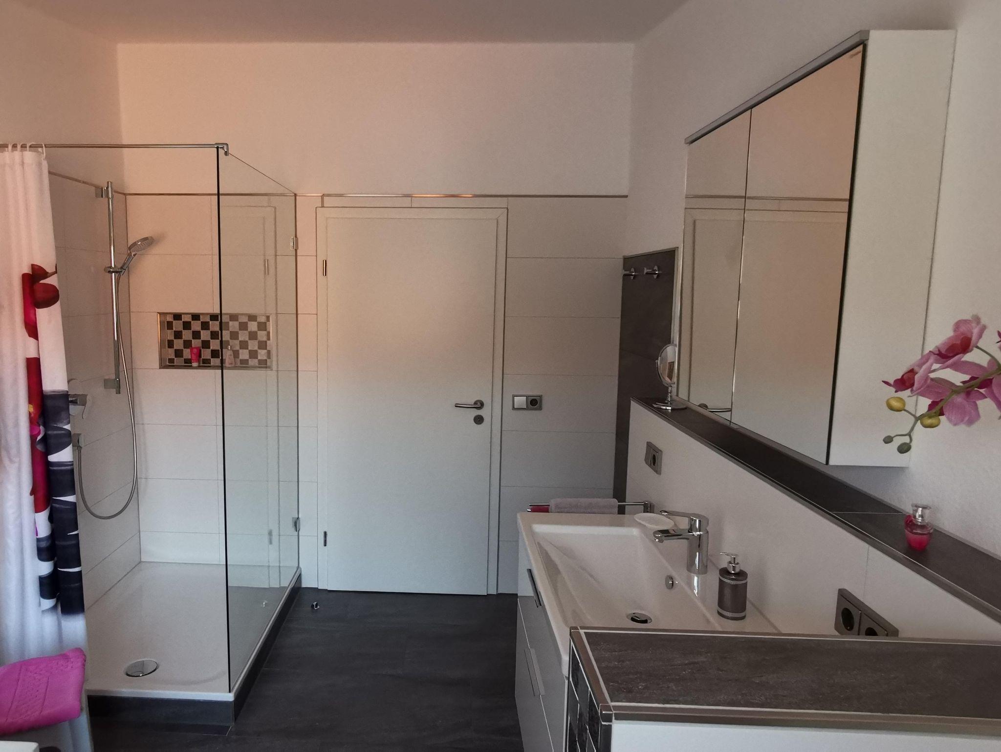 Bad mit großer flacher Duschwanne, Badewanne, Toilette, Waschtisch, Spiegelschrank, Ablage und Handtuchwärmer. Diele mit Garderobe und Schuhschrank.