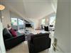 Helles, freundlich eingerichtetes Wohnzimmer mit Parkettboden, Couch und Tisch-Garnitur, Sidebord/Glasvitrine. Radio/CD, Flachbildschirm mit Kabel-TV.