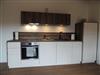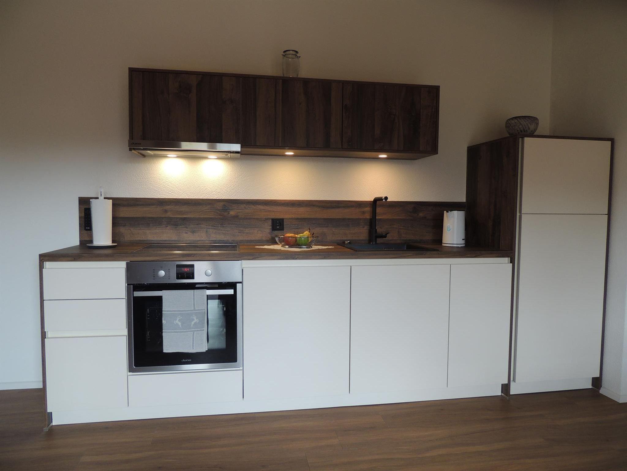 Der Wohn-/Essbereich mit sichtbarem Dachstuhl, Küche, Eßtisch und gemütlicher Couch lädt zum Entspannen ein. Wird das Sofa zum Schlafen genutzt, hat es eine Liegefläche von 143 x 205 cm.