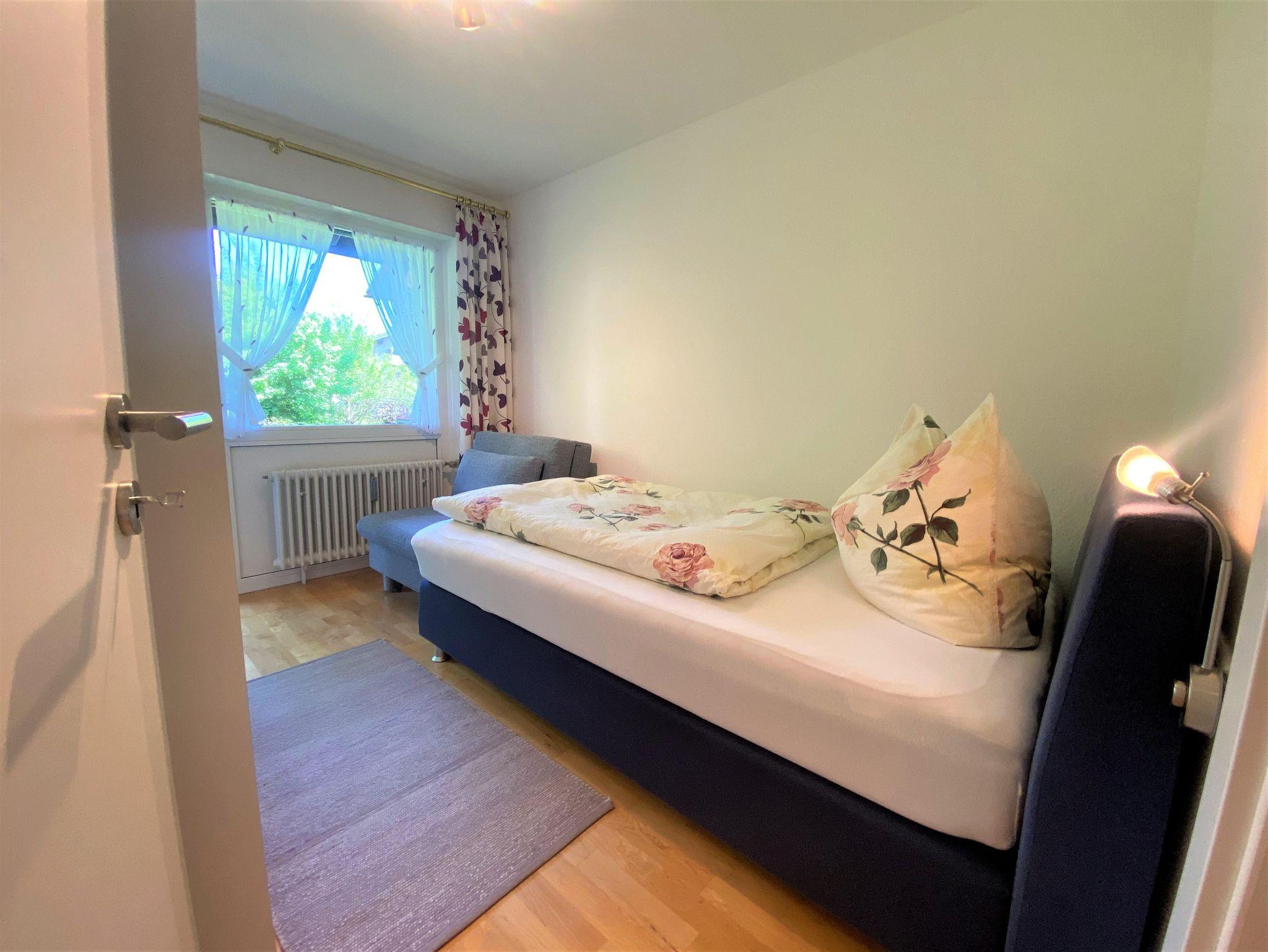 Weiteres Schlafzimmer mit Parkettboden, Boxspringbett 2x1,20 m und Kleiderschrank.