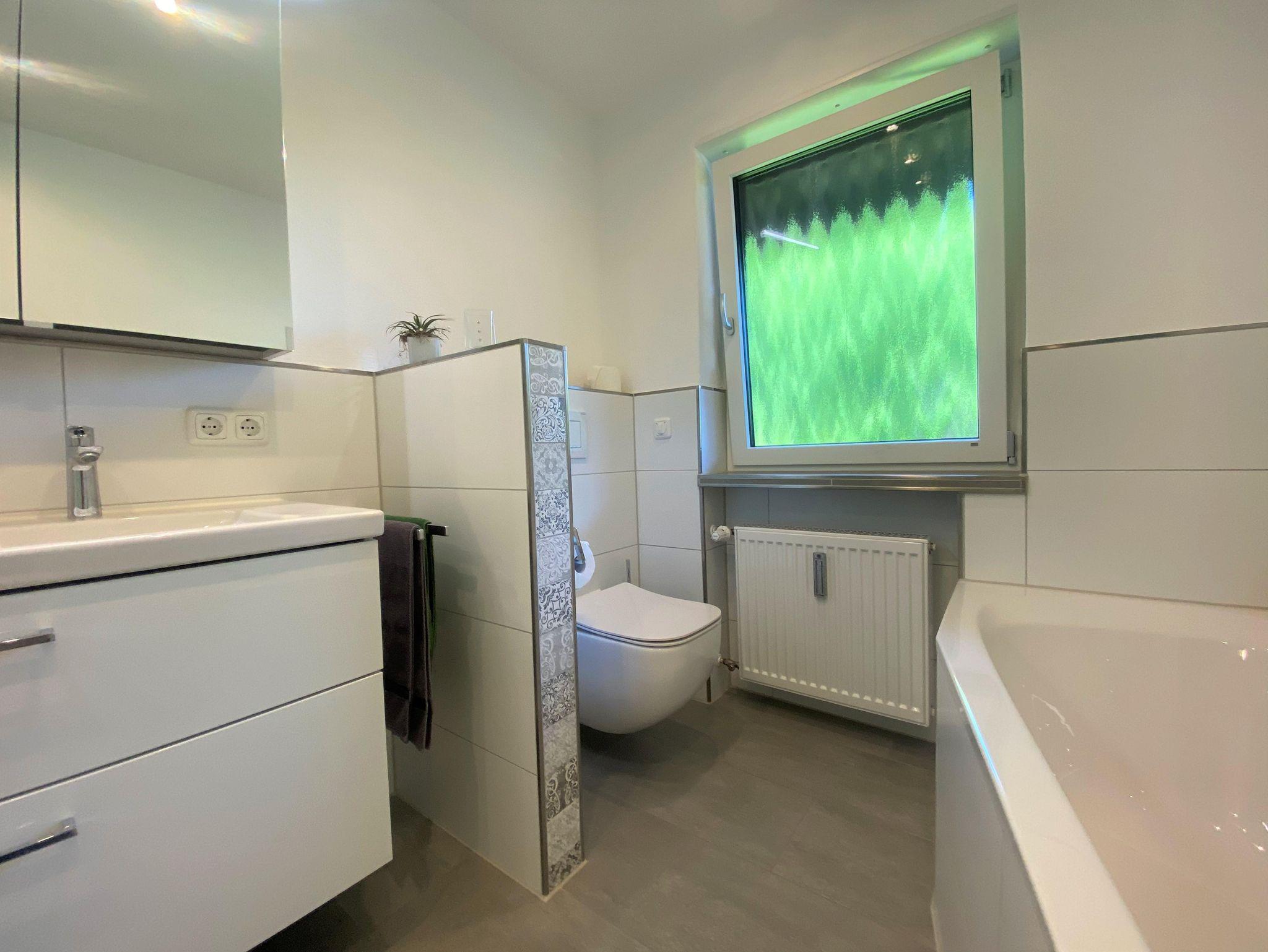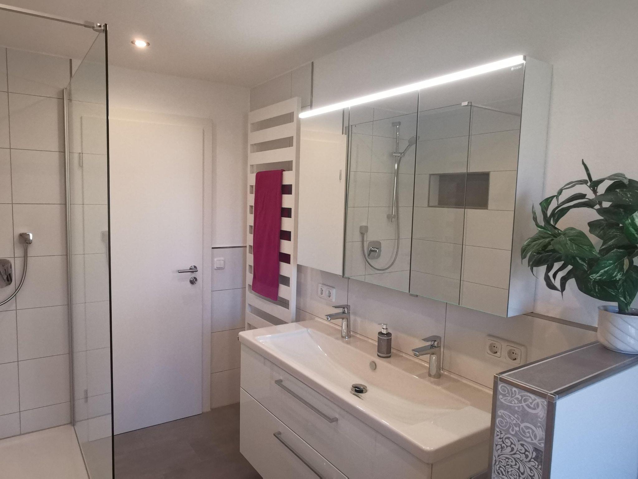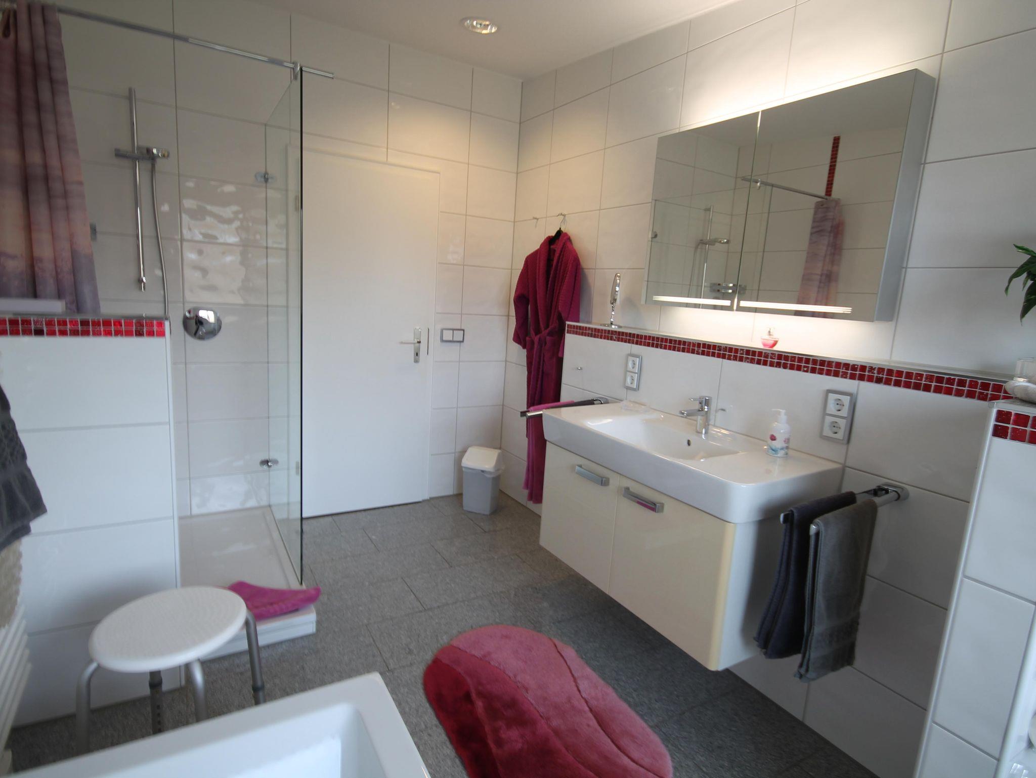 Bad mit Dusche, Badewanne, Toilette, Bidet, Doppelwaschbecken-Spiegel u. Badschrank.
