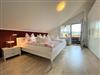 Schlafzimmer mit Parkettboden, Boxspring-Doppelbett 2x2 m und Kleiderschrank.