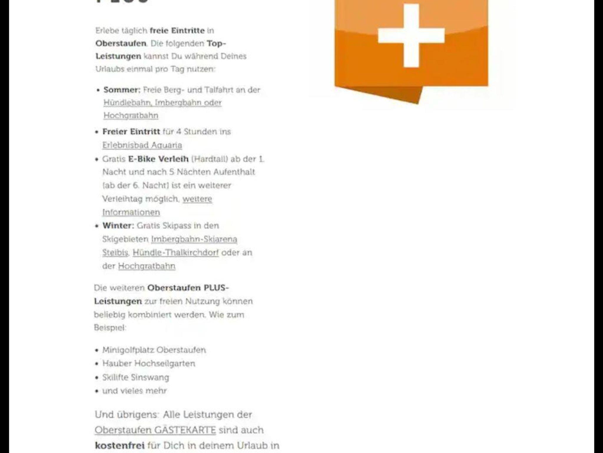 Wir sind Partner von Oberstaufen PLUS: Zusätzlich zu unseren Leistungen erhalten Sie bei uns Ihre Gästekarte mit Oberstaufen PLUS (Mehrzweck-Gutschein) und genießen damit attraktive Vorteile und Erlebnisse für die Dauer Ihres Aufenthaltes. Weitere Informationen zu Oberstaufen PLUS finden Sie hier.
