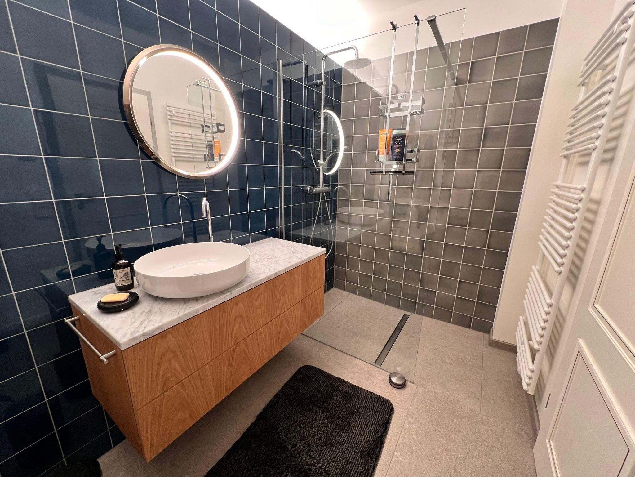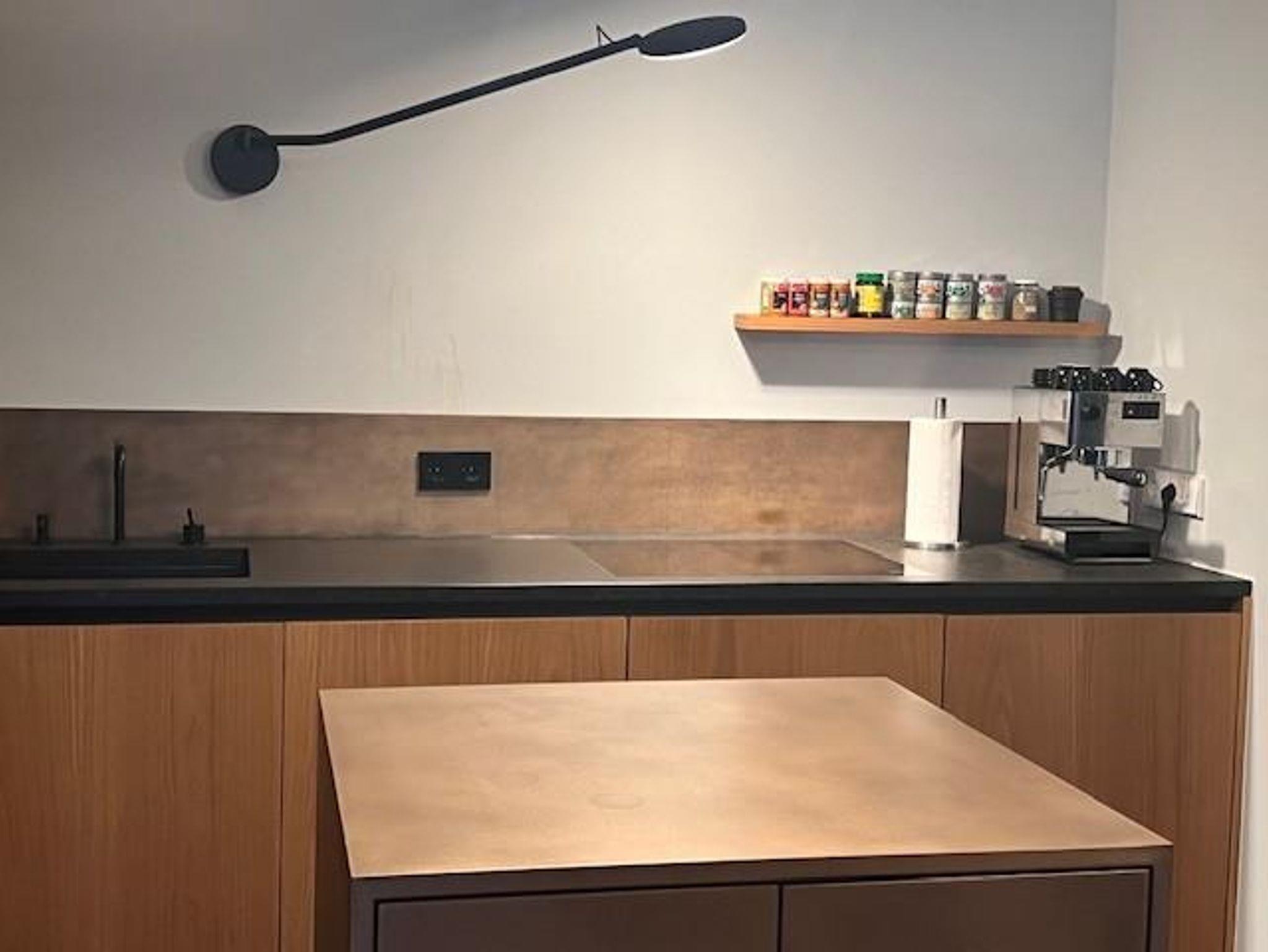Es gibt eine wirklich vollwertig und hochwertig ausgestattete Küche mit Spülmaschine, Induktionsherd, Backofen, Kühlschrank mit Gefrierfach, Siebträger-Espressomaschine, Kaffemaschine, Gewürze und Öl.