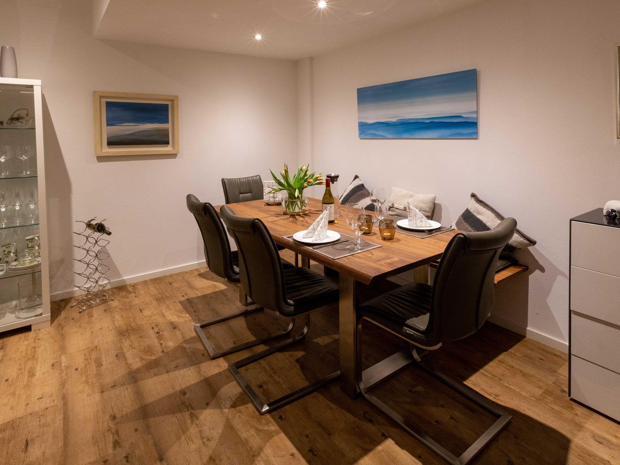 Das hochwertig möblierte Wohnzimmer bietet Entspannung beim Fernsehen oder Musikhören von modernster Technik (TV Soundbar, Blue-Ray-Player.)Besonders gemütlich ist die Essecke, wo Sie auf Lederstühlen oder der Bank am Massivholztisch Platz nehmen. Verschiedene echte Bilder und Grafiken tragen zu dem besonderen Ambiente bei.Vom Wohnzimmer gelangen Sie auf den Südbalkon und können es sich in den Loungesesseln bequem machen. Das Schlafzimmer ist ebenfalls mit bequemen und wertigen Möbeln ausgestattet. Der Kleiderschrank und eine Bank bieten ausreichend Platz für Ihre Garderobe. Hier nutzen Sie den zweiten Flachbildfernseher oder lassen sich von den großen Fotografien für besondere Träume inspirieren. Ein fest installierter Safe steht zur Verfügung.In Schlafzimmer, Küche und Wohnzimmer erlauben Plissees und elektrische Rollläden absolute Privatsphäre. Vom Schlafzimmer und von der Küche gelangen Sie auf den nach Osten gerichteten zweiten Balkon,wo ebenfalls ein Tisch und vier Stühle stehen