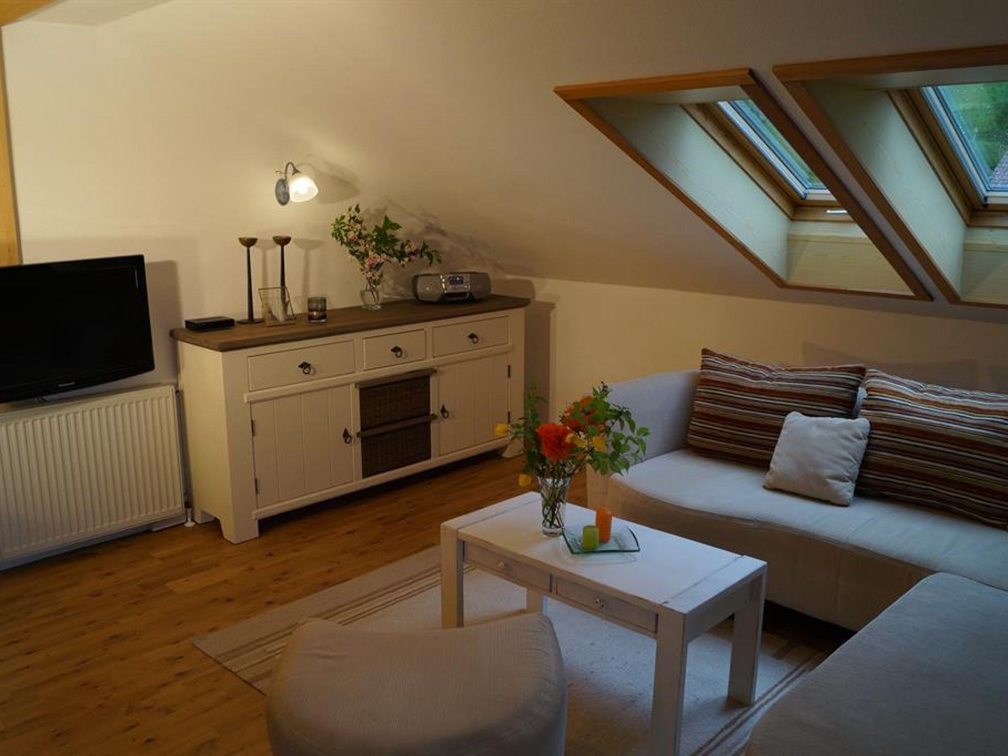 Die gemütlich eingerichtete Ferienwohnung (ca. 60qm) befindet sich im Dachgeschoß.